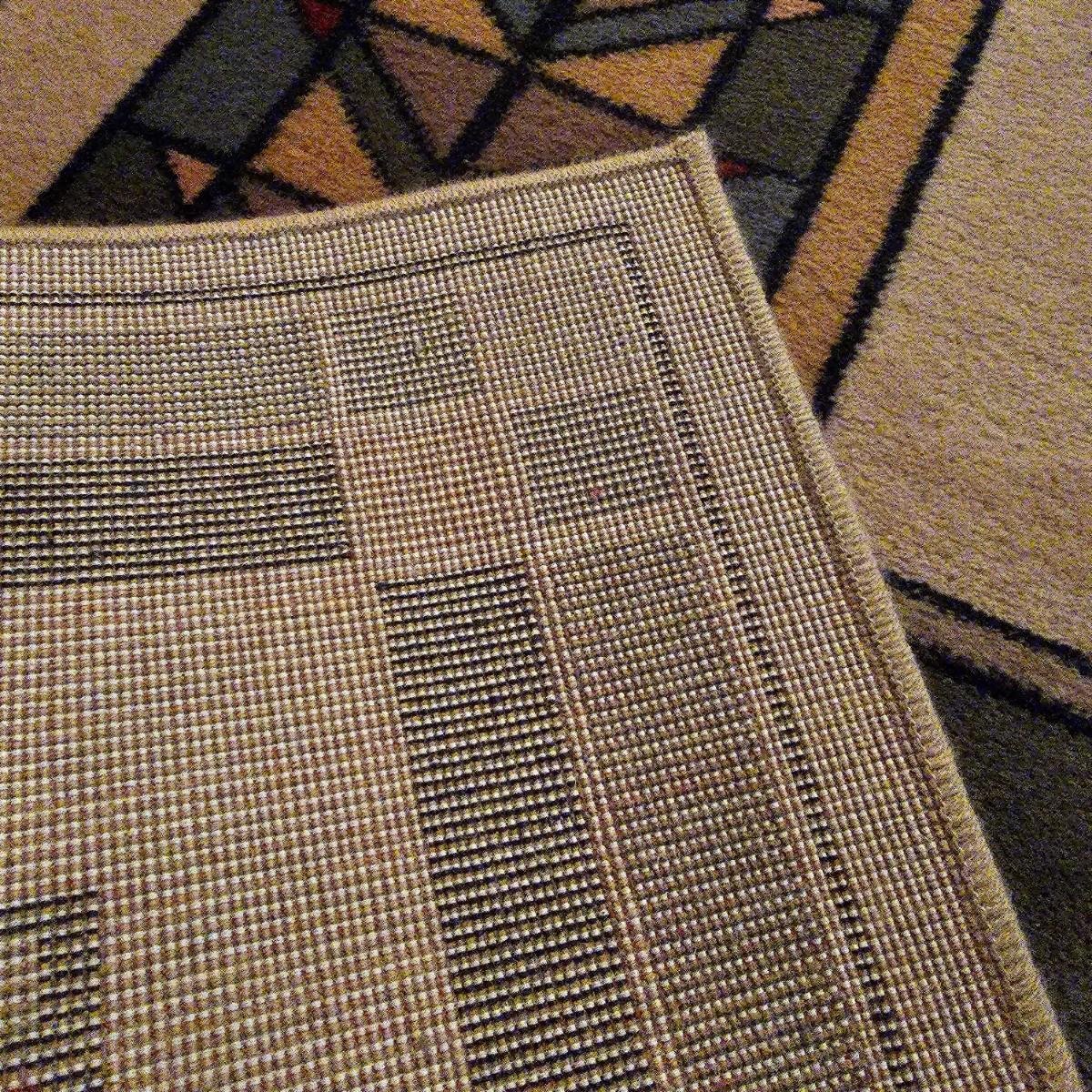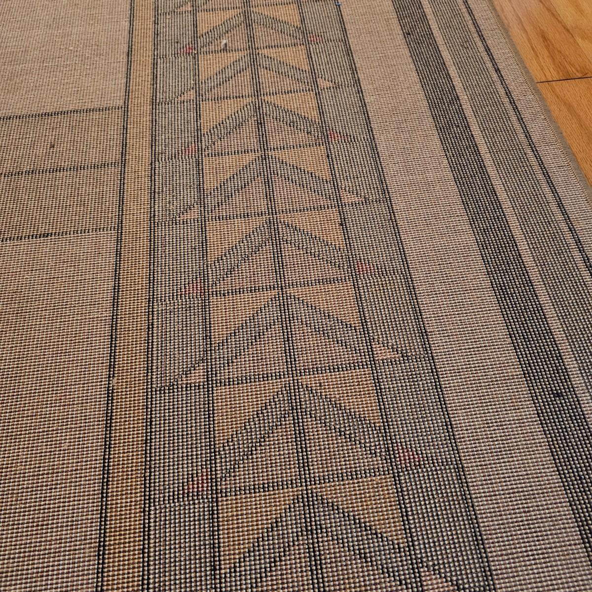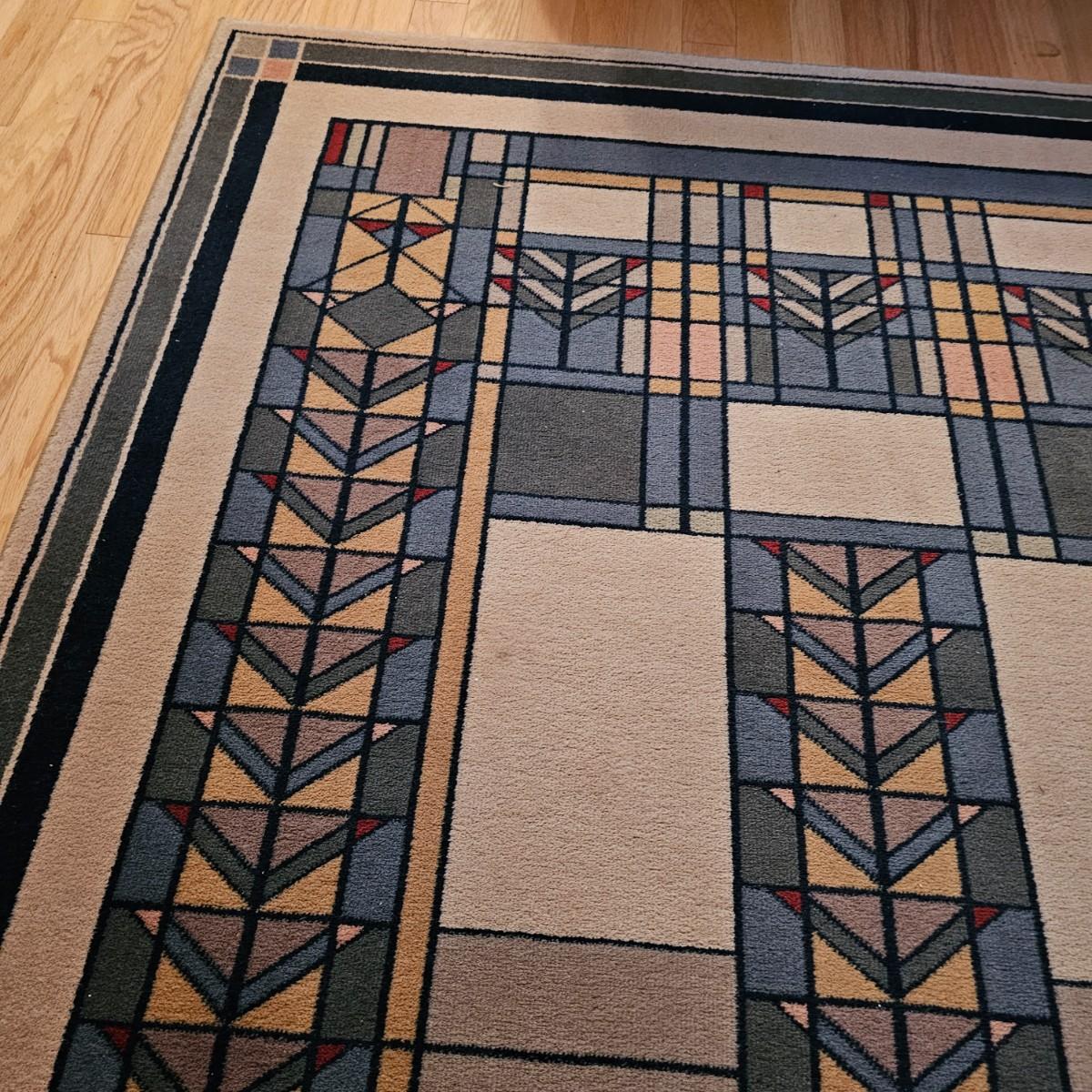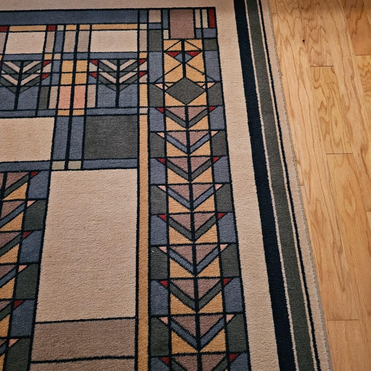 Beautiful prairie style Karastan rug with a stained glass window look. Tans, browns, greens and reds in a chevron style pattern make up this design. Bound edges all around. Pile appears to be wool, but we cannot verify this and there is no label. Rug measures approximately 5' x 8'. See photos for details. Local pickup only.