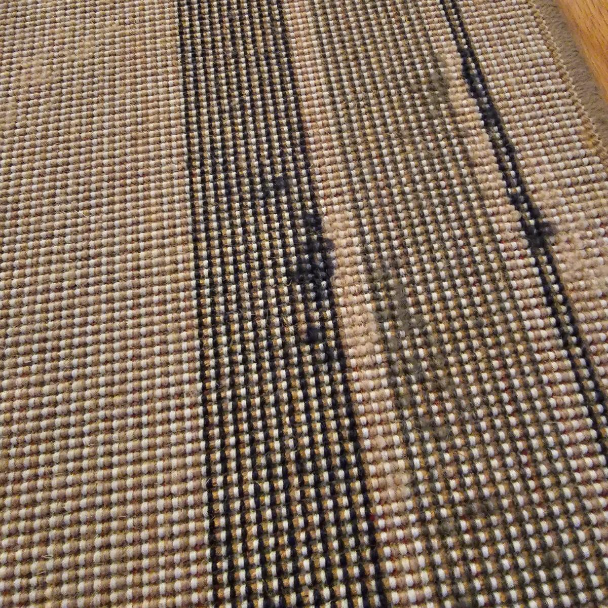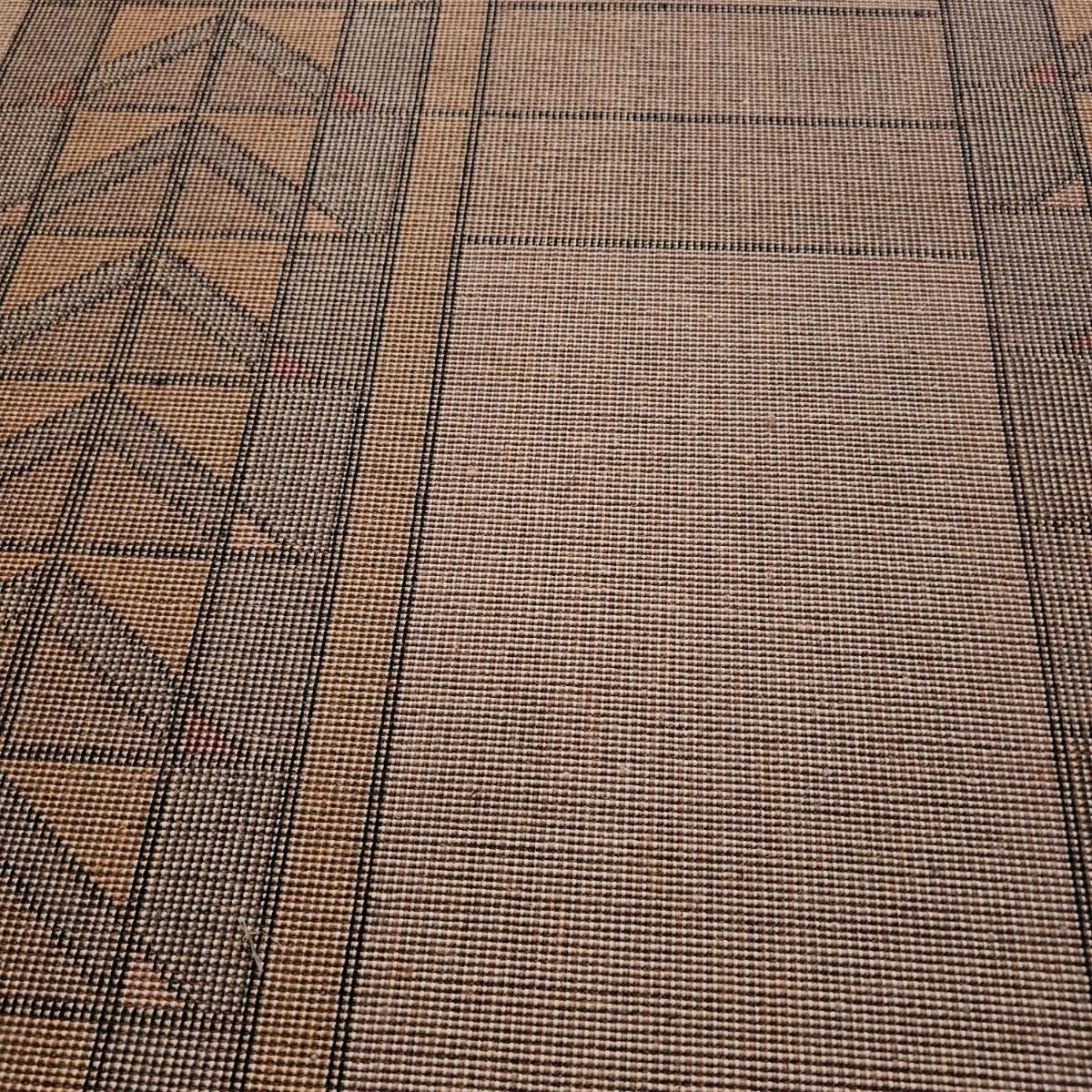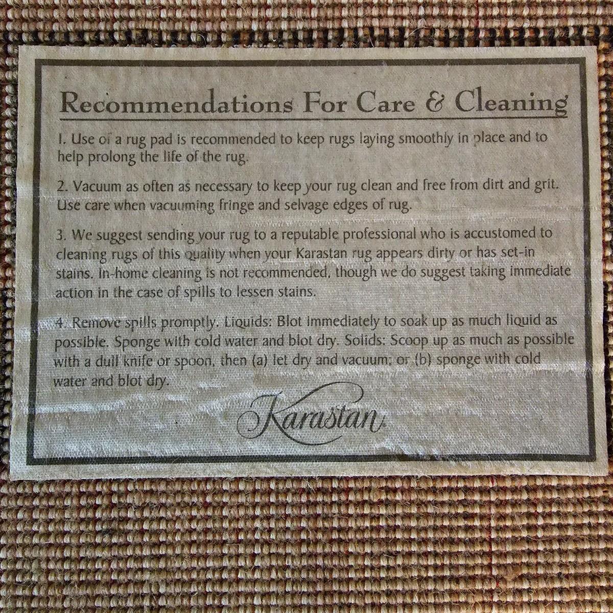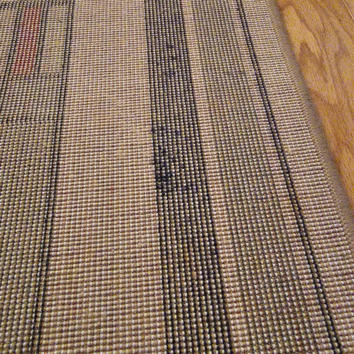 Beautiful prairie style Karastan rug with a stained glass window look. Tans, browns, greens and reds in a chevron style pattern make up this design. Bound edges all around. Pile appears to be wool, but we cannot verify this and there is no label. Rug measures approximately 5' x 8'. See photos for details. Local pickup only.