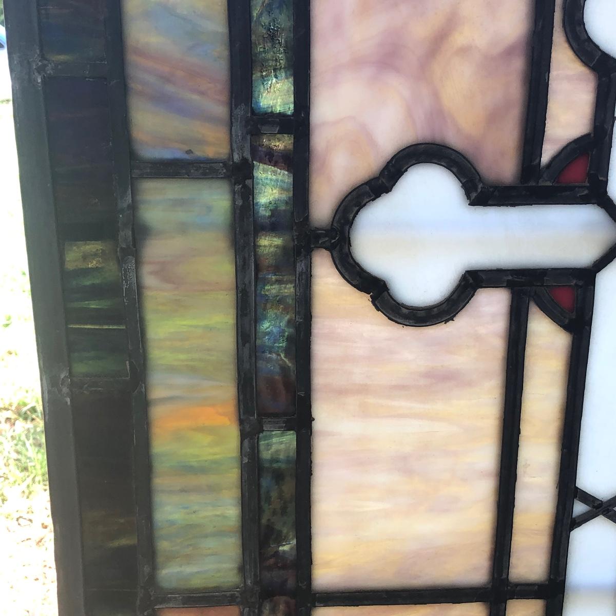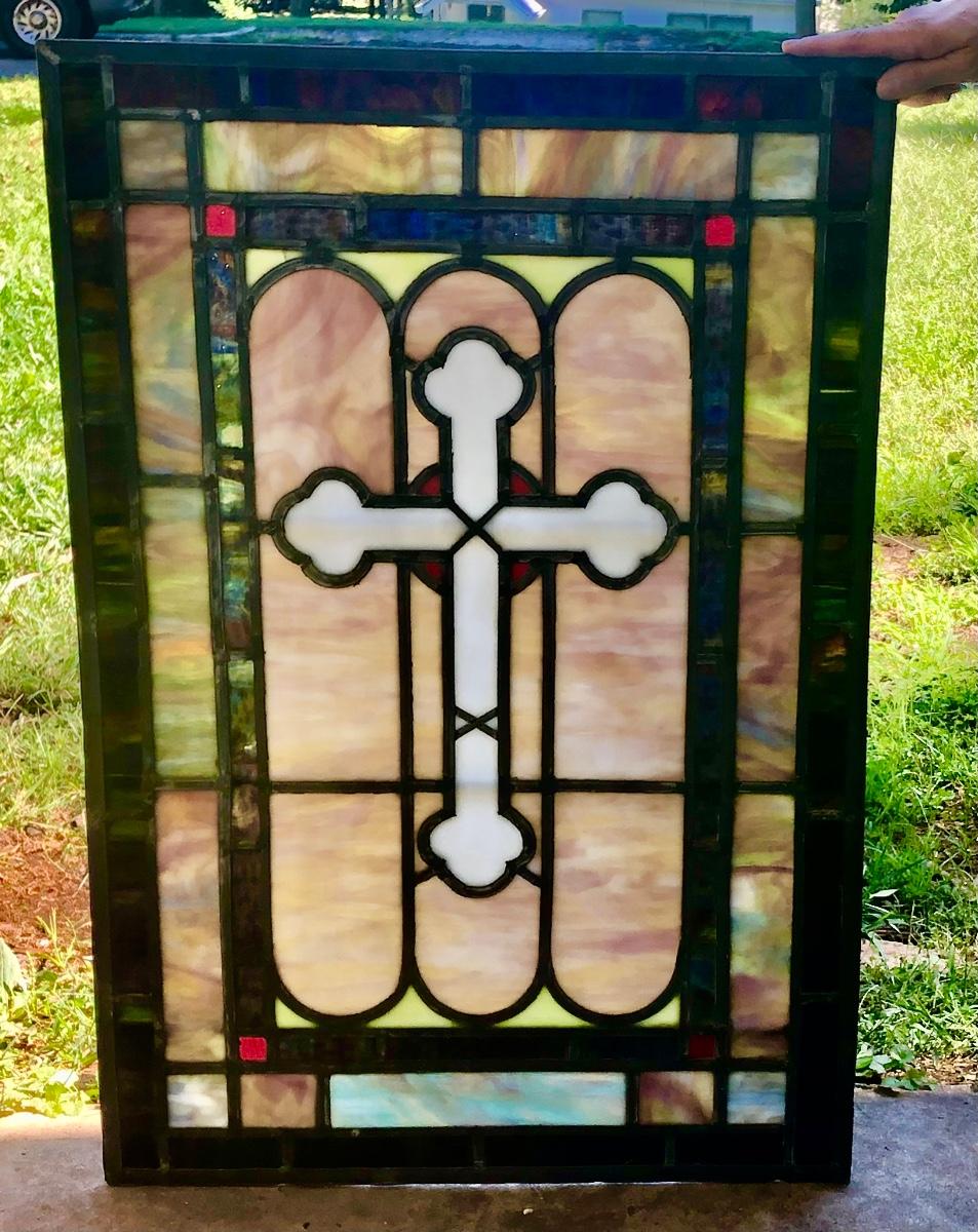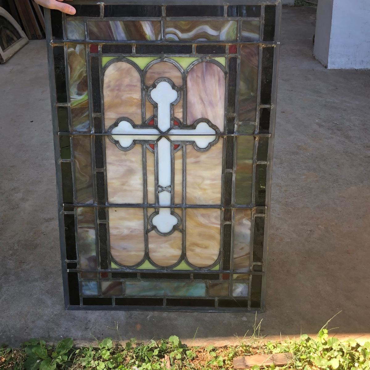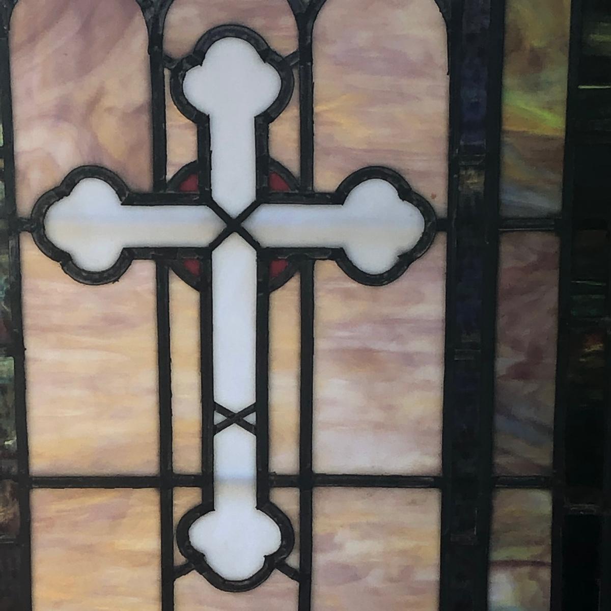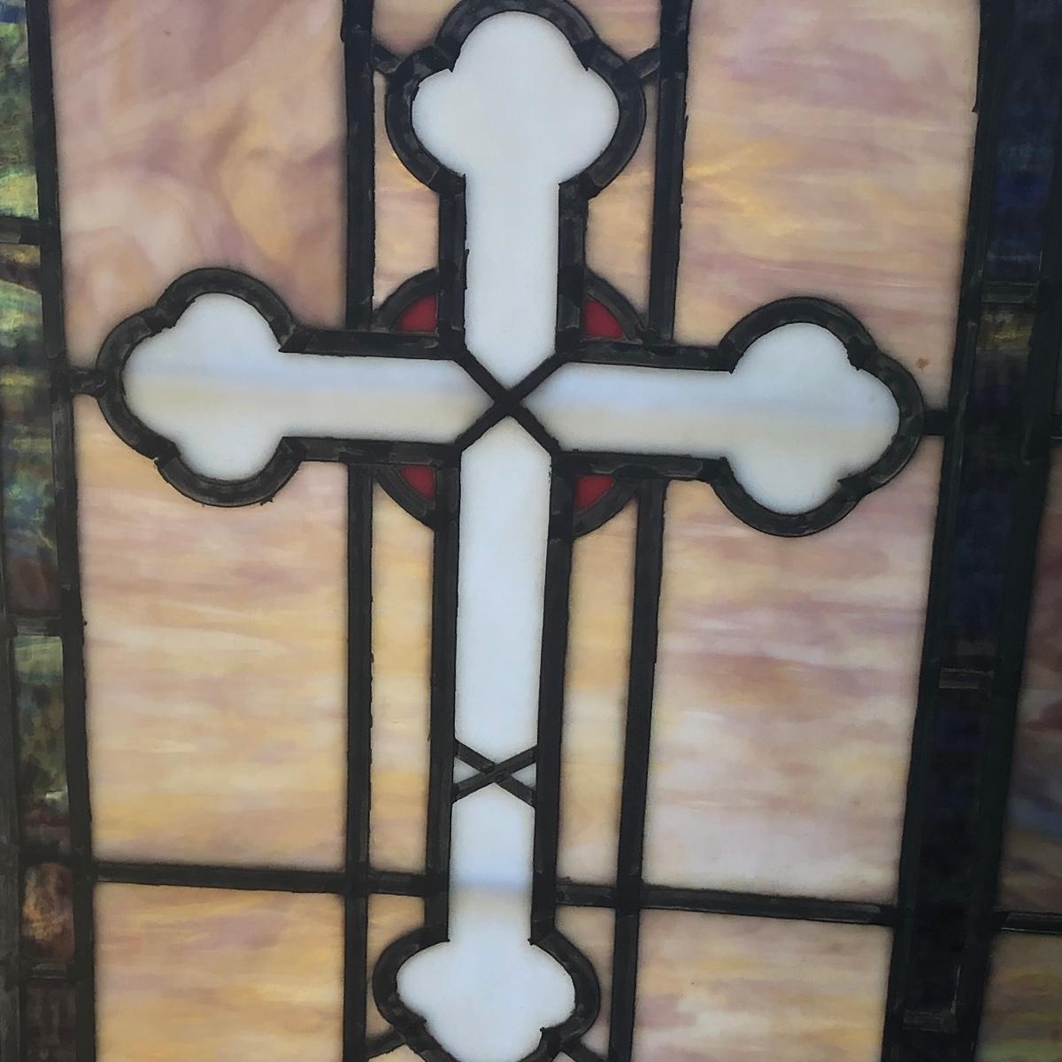 This stunning stained glass piece with lots of color and white cross in the middle is unlike our other stained glass lots, this one does not have a window frame and their is no way to hang it currently. It measures 24” x 37”.