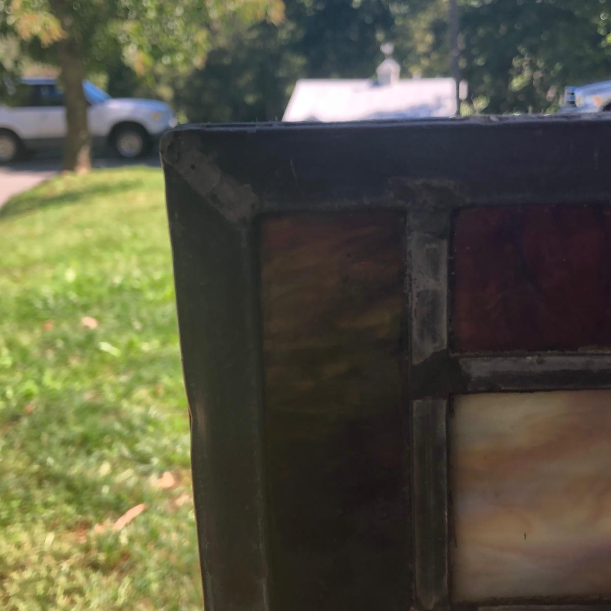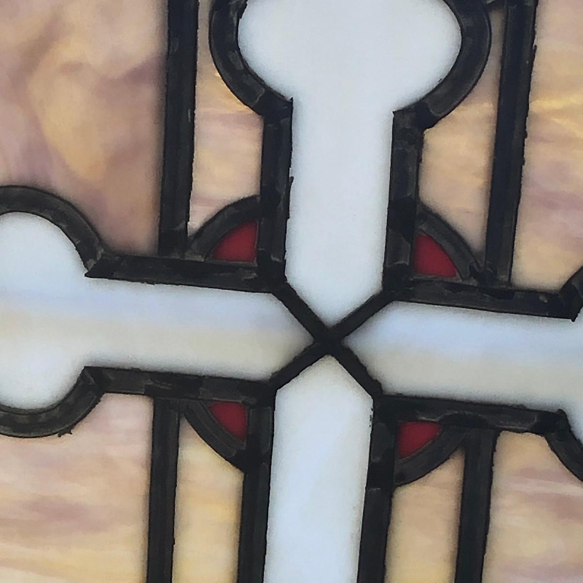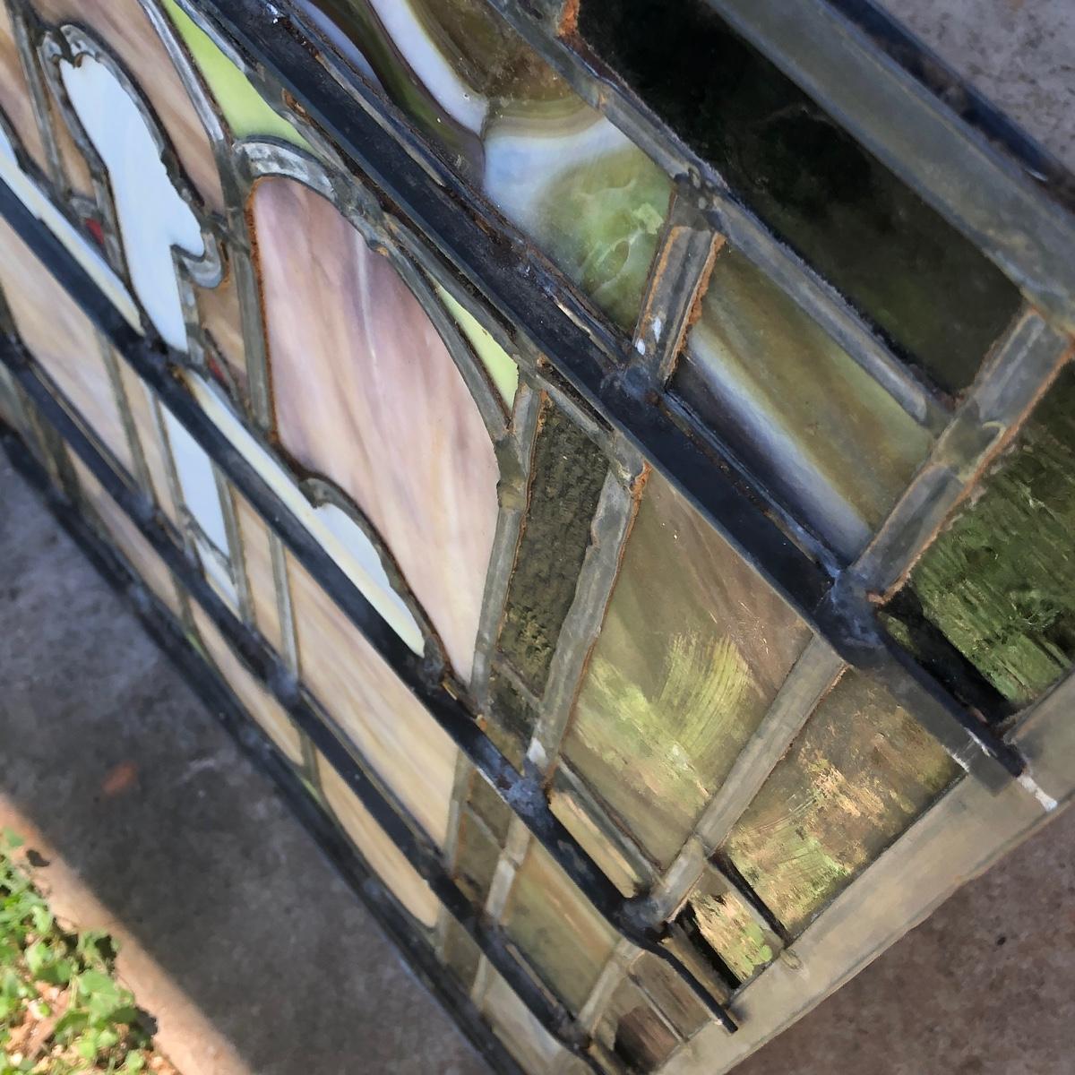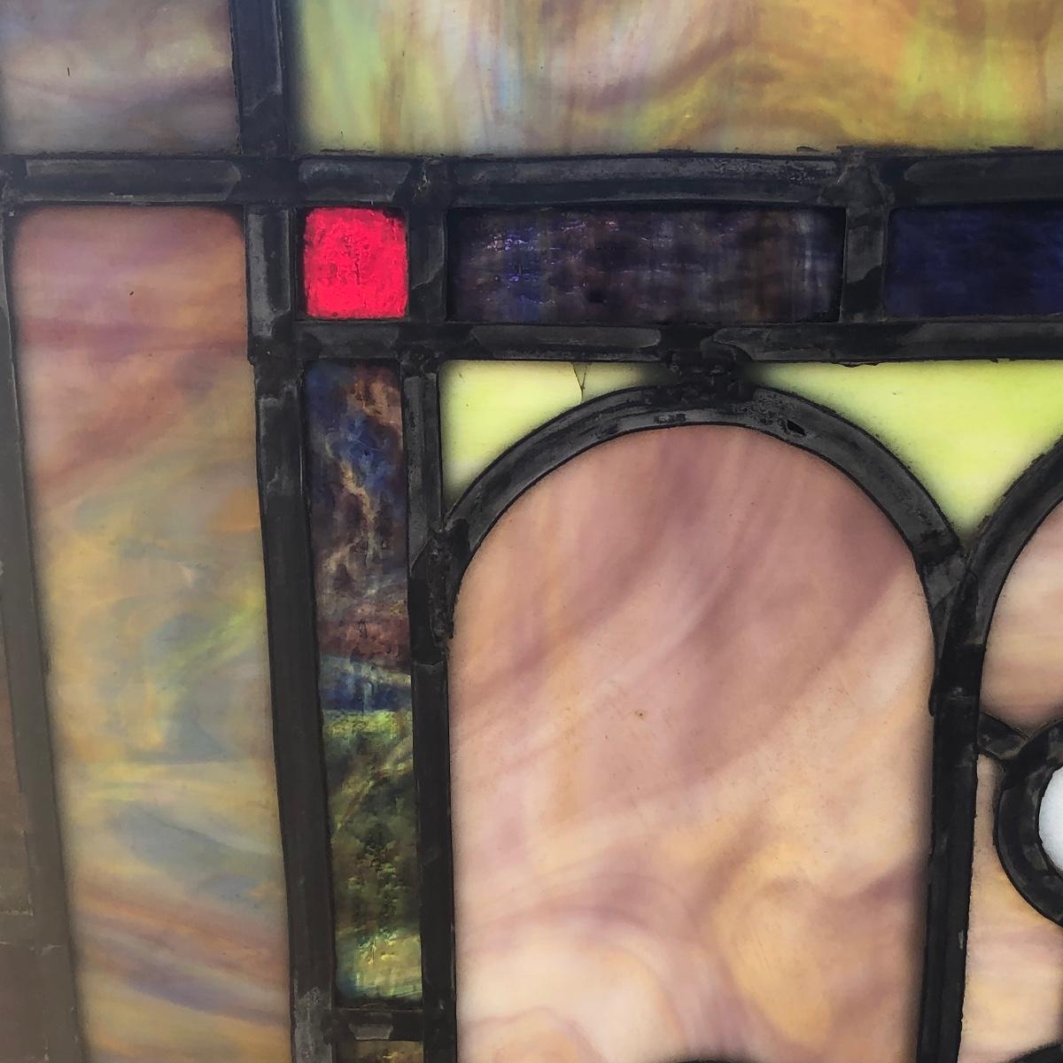 This stunning stained glass piece with lots of color and white cross in the middle is unlike our other stained glass lots, this one does not have a window frame and their is no way to hang it currently. It measures 24” x 37”.