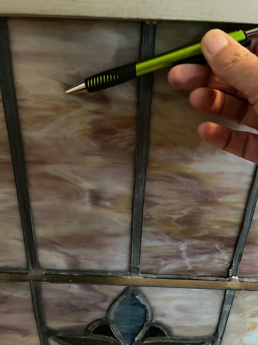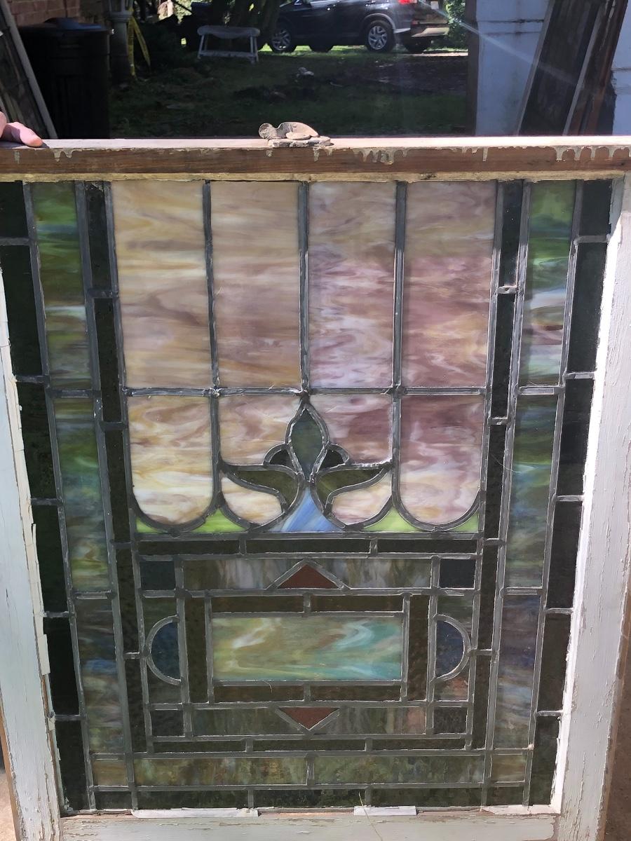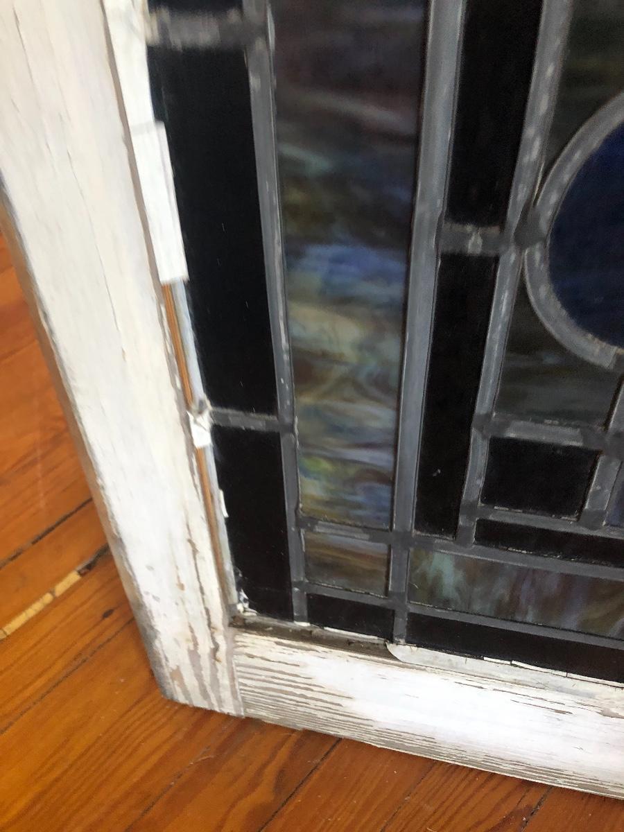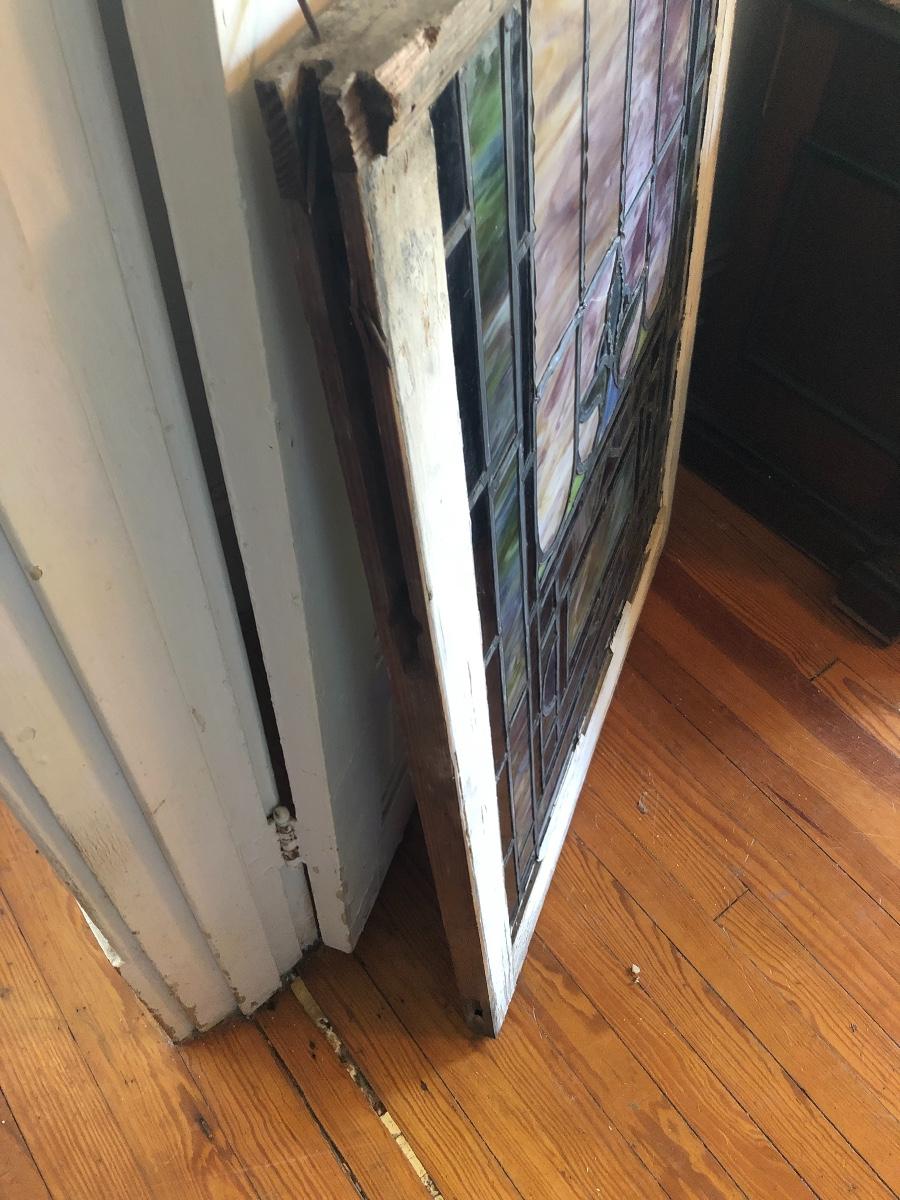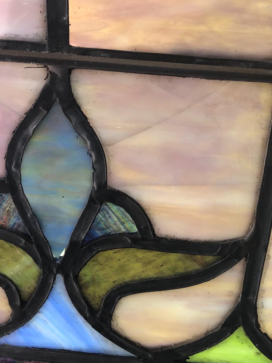Lot 4 of 10, this stained glass window came from a church and has a blank name panel just waiting for someone to add their family name to it. Some of the glazing is missing and it does have a crack in the glass; the crack is barely visible, it runs left to right in just one section approximately 4” total, see images.