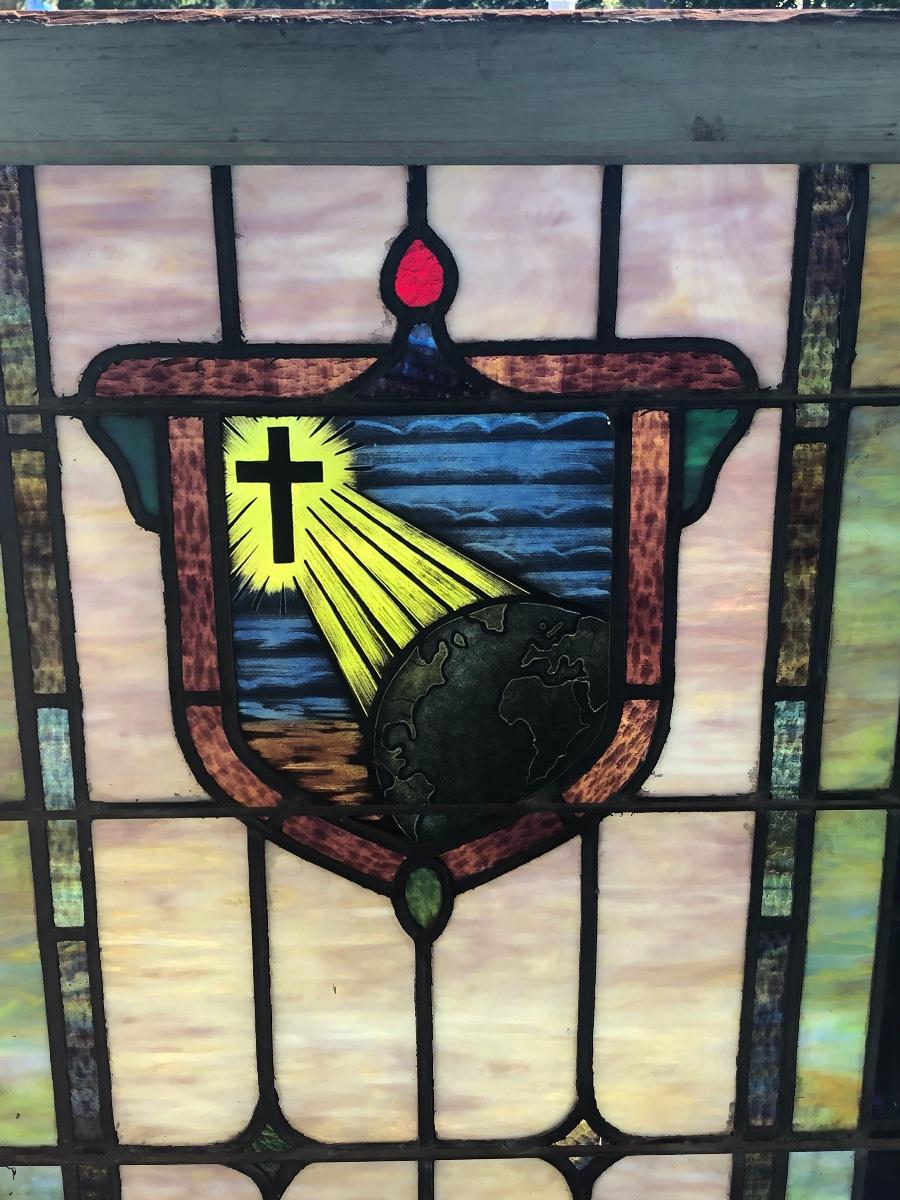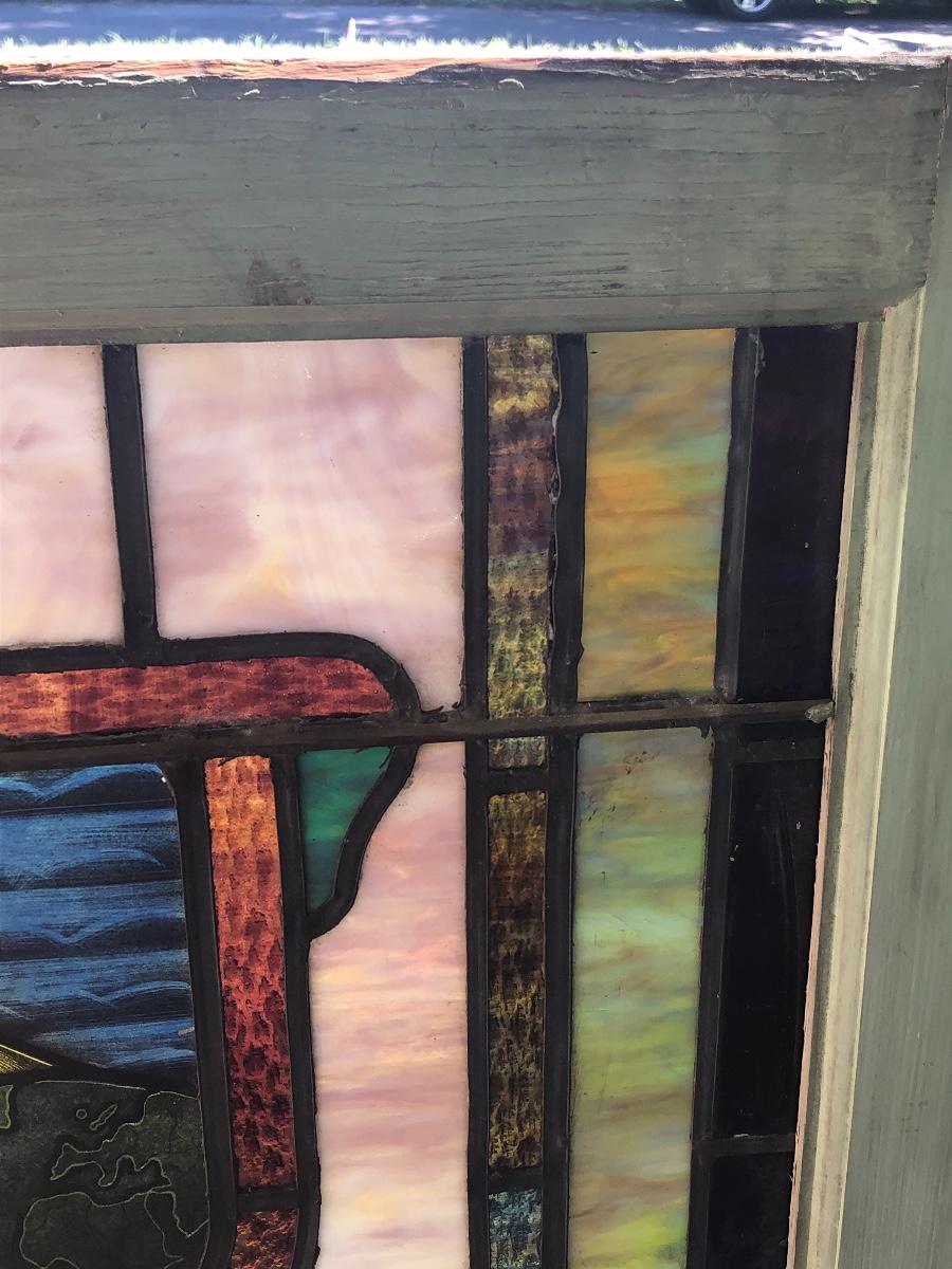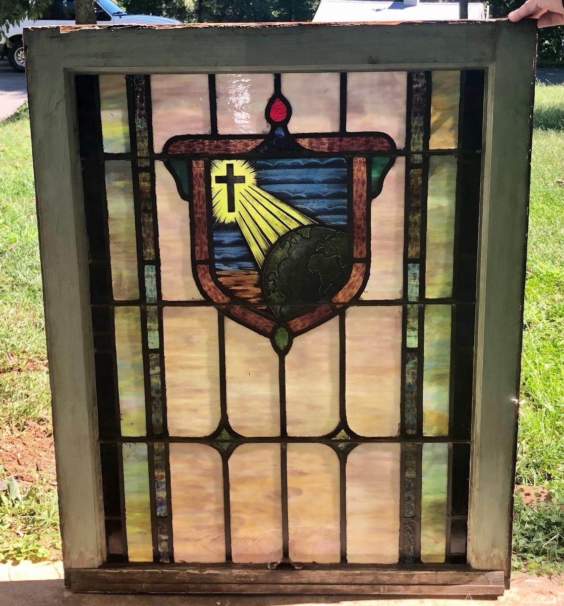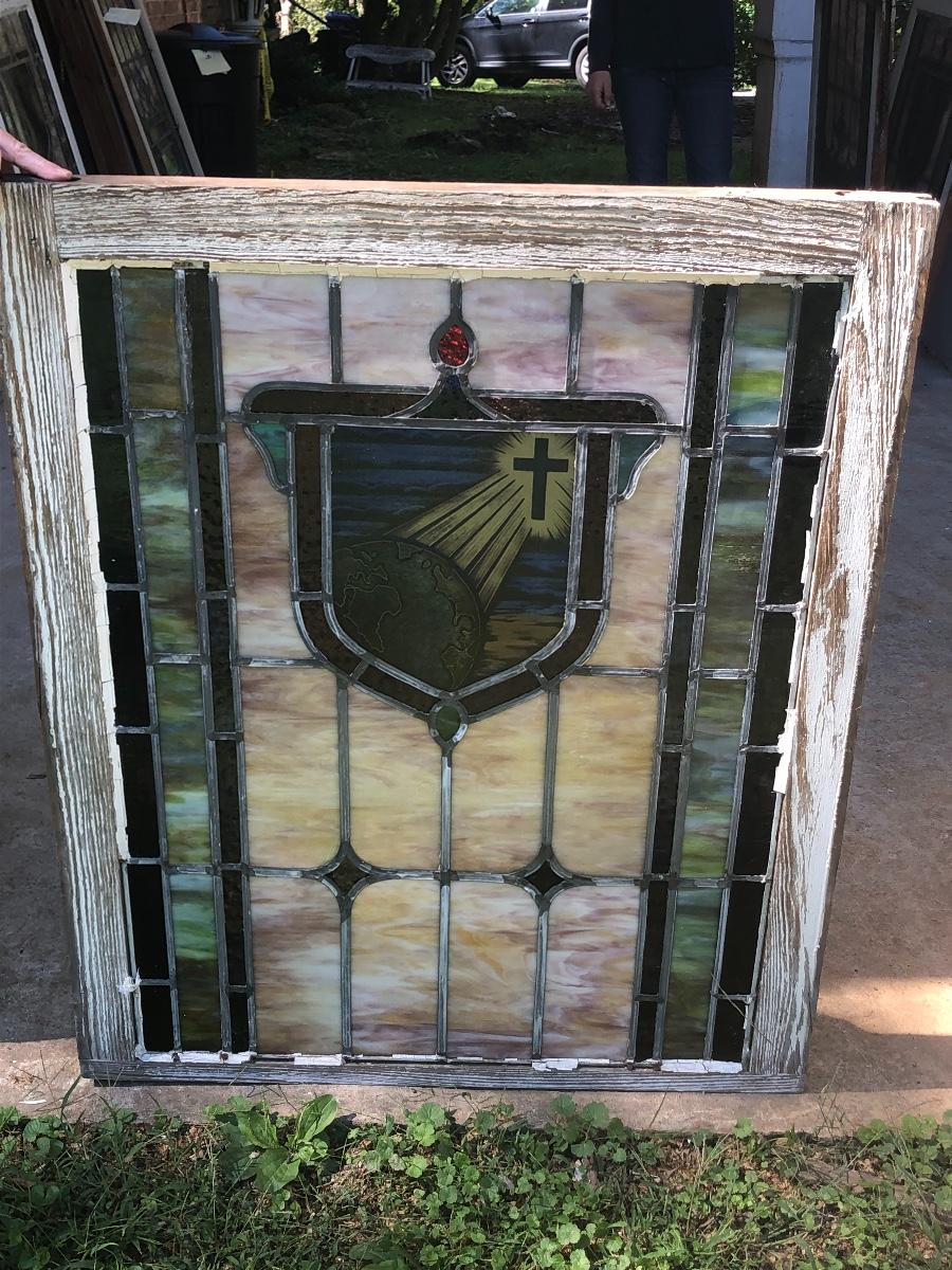 Lot 5 of 10, this stained glass window came from a church and has an image of a cross with sunbeams shining down on earth. Some of the glazing is missing but otherwise it’s in good condition.