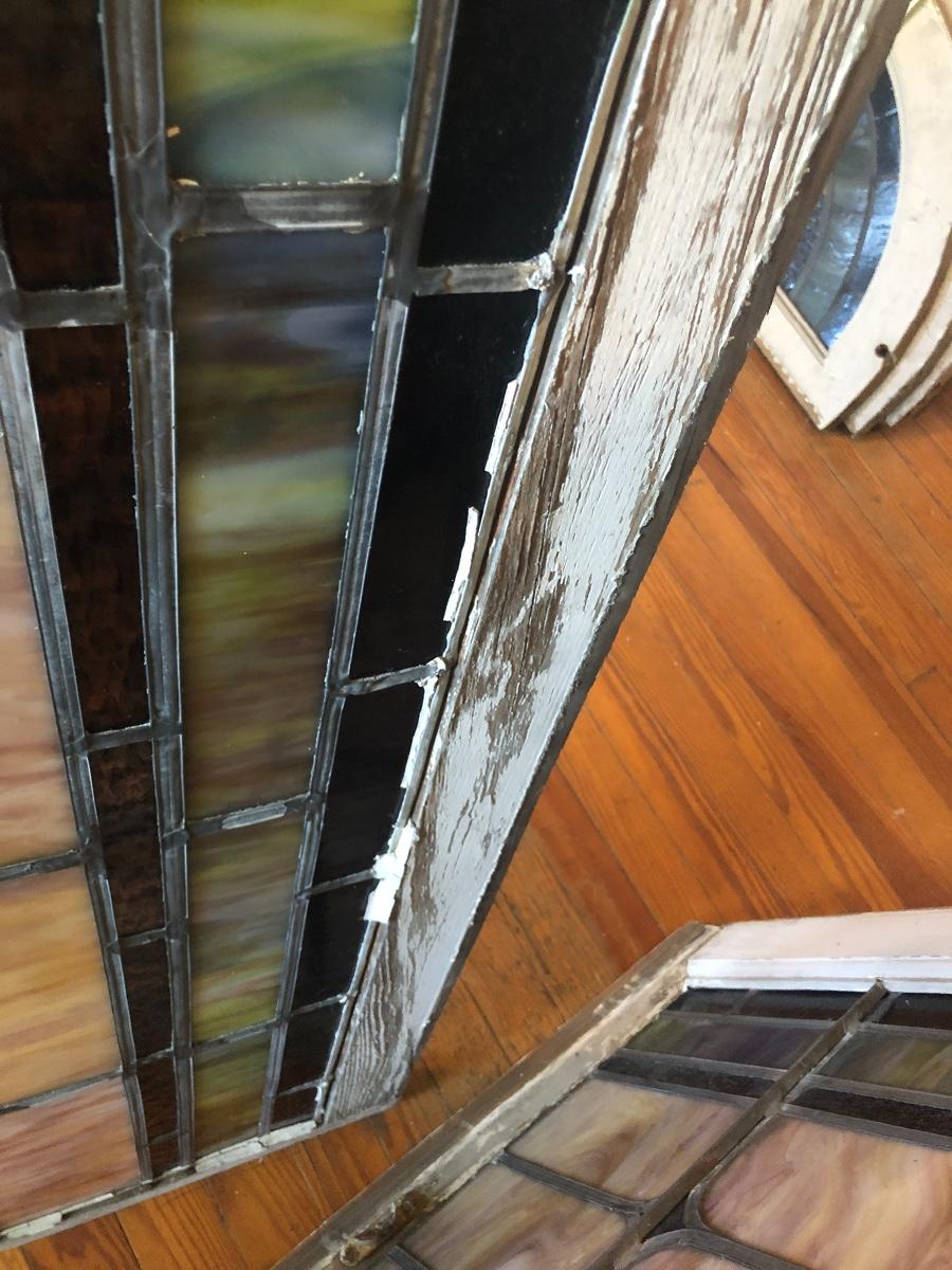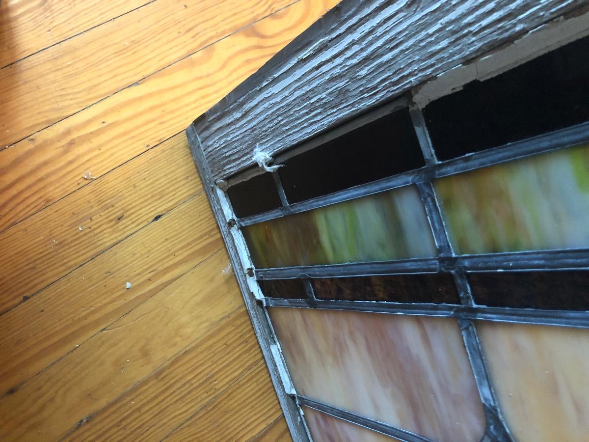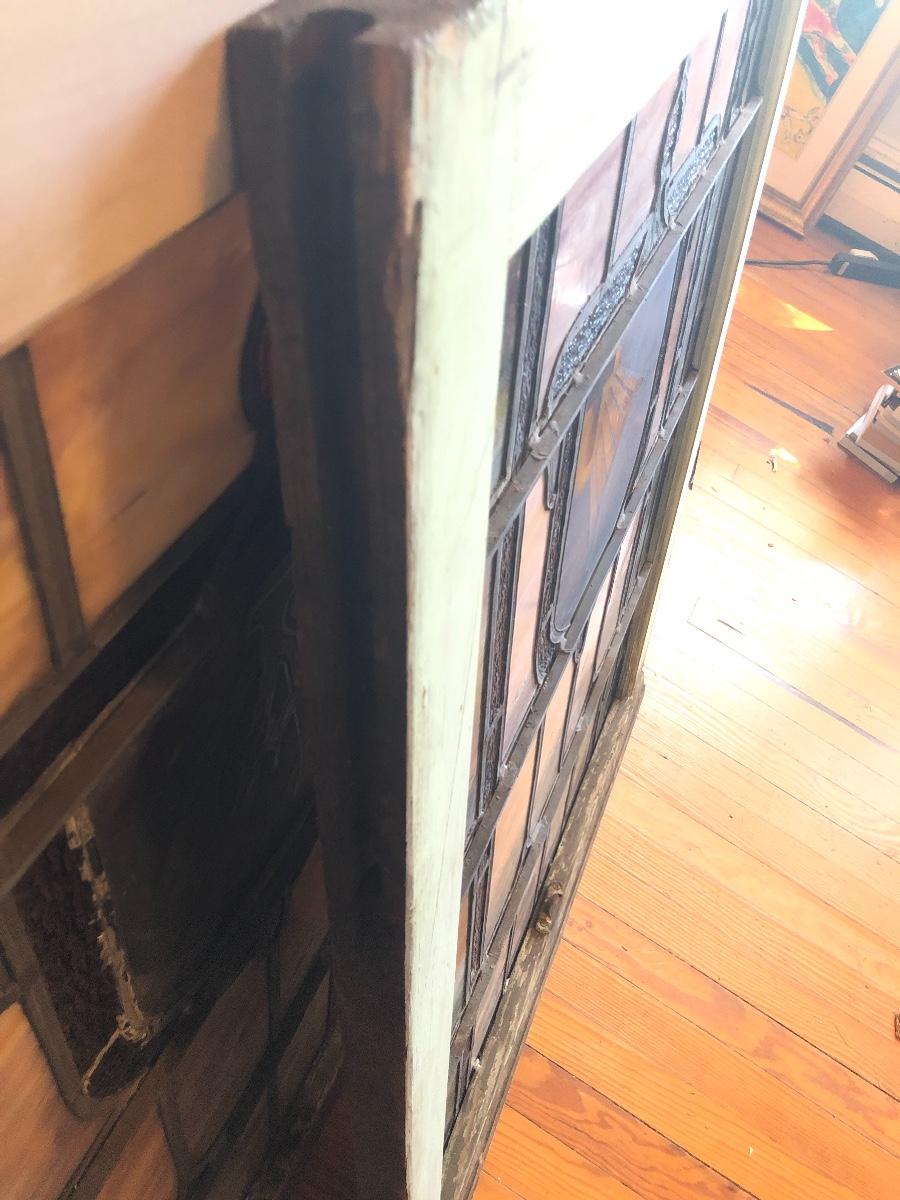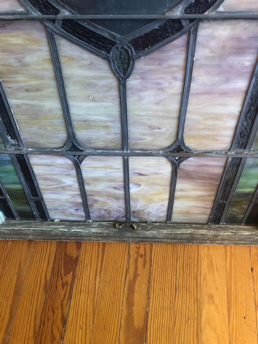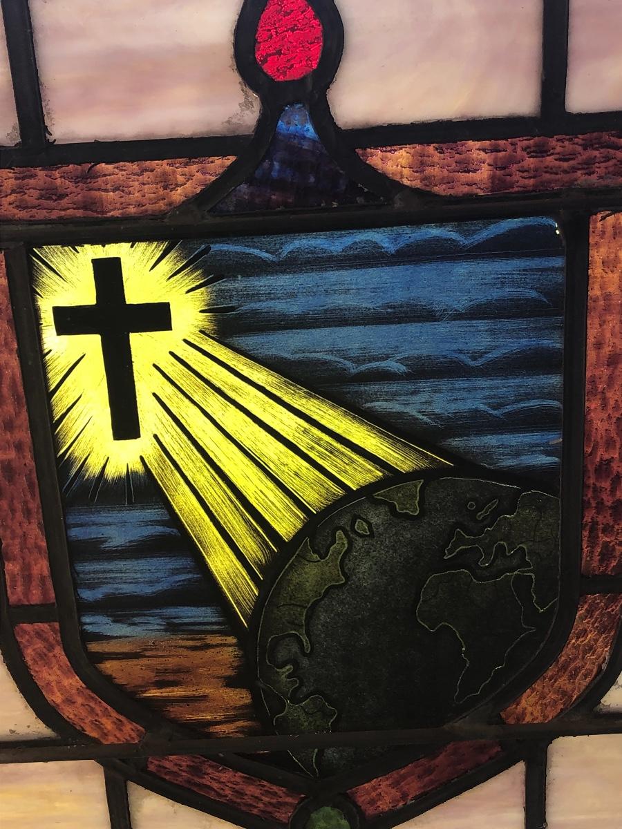 Lot 5 of 10, this stained glass window came from a church and has an image of a cross with sunbeams shining down on earth. Some of the glazing is missing but otherwise it’s in good condition.