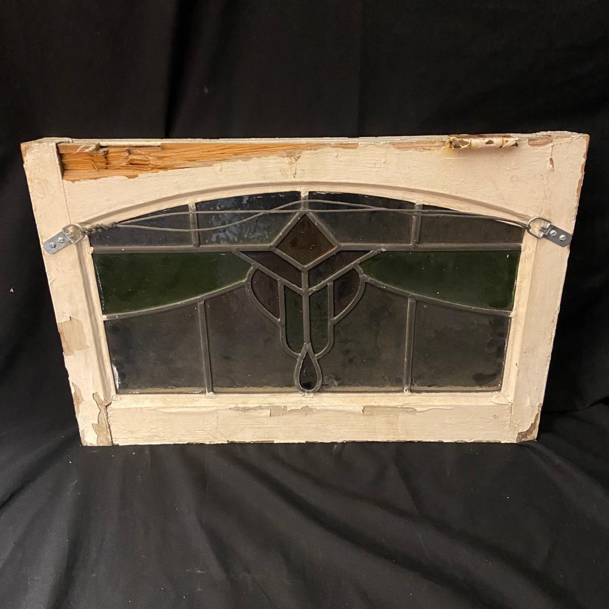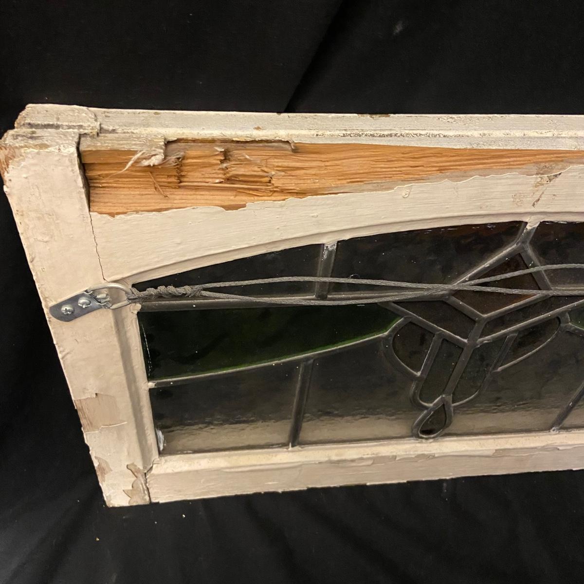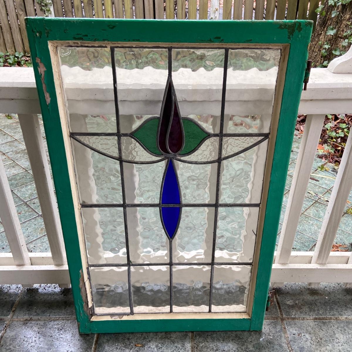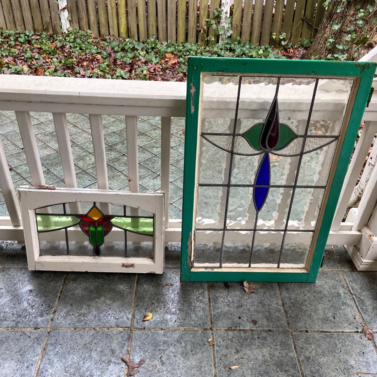 This lot includes two stained glass windows in wooden frames. The first stained glass is set in a white painted frame and measures 22.5” x 14.5”. The second is larger measuring 23.5” x 37” and is in a wooden frame painted green. There are some chips in the paint on both frames and the small white frame does have some damage on the back. Both pieces come equipped with hangers on back. Shipping available. Shipping can be costly. We suggest contacting our preferred local shipping provider, Postage Express, with dimensions and getting an estimate before bidding: (828) 255-9250 or shipping@postageexpressnc.com.