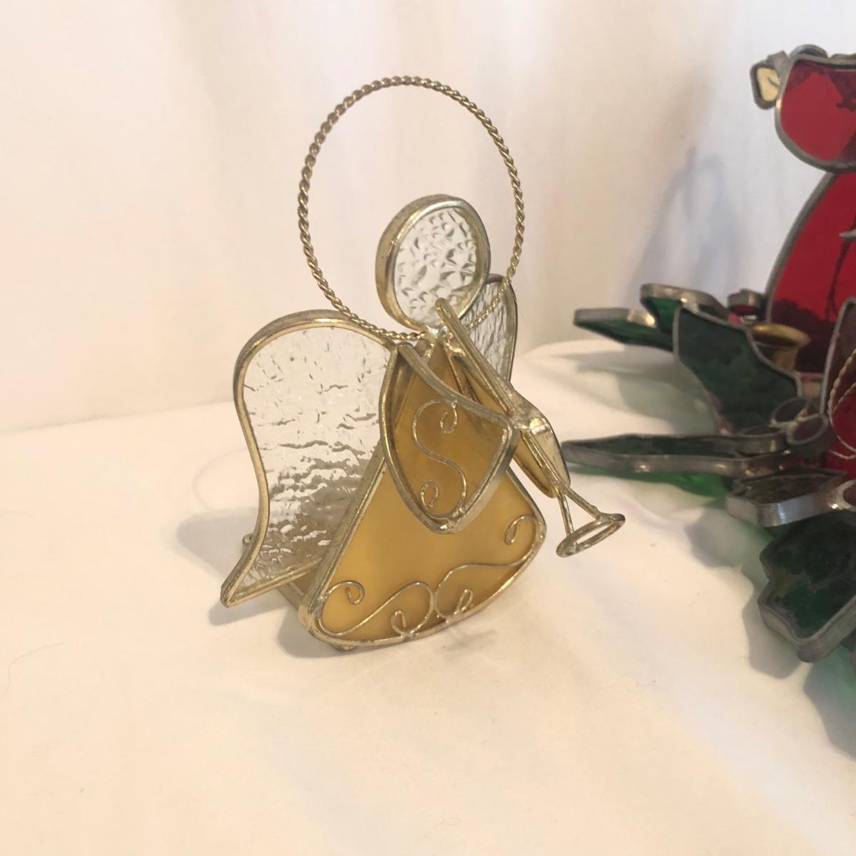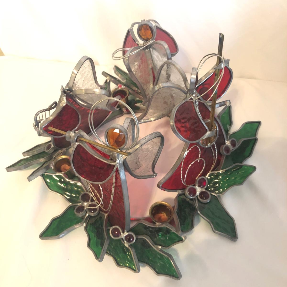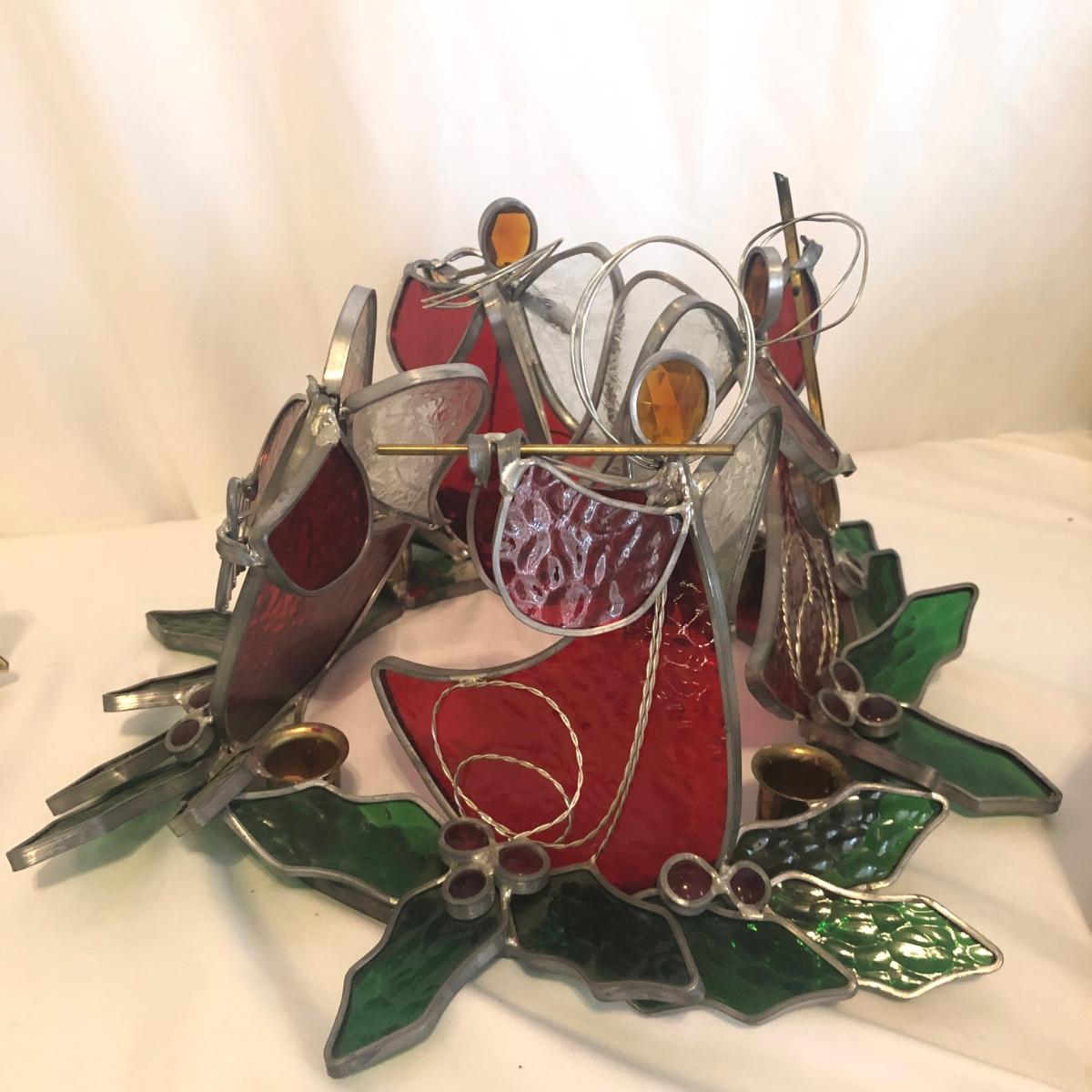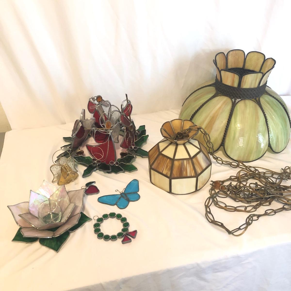 This stained glass collection features a green and brown lamp shade made with kiln slumped stained glass 8 panels that is 19” in diameter and 12” tall. An amber glass lamp shade with an 11’ cord and chain; it worked when plugged in. Other stained glass includes a circle of Christmas angels in green and red with candle holders that measures 14” in diameter and is 9” tall. In the Christmas theme there is also a gold tone angel with a horn and a small window Christmas wreath. Other items include a pink lotus flower candle holder with tea candle holder, a blue butterfly, and a strawberry. One of the angels in the Christmas circle is missing it’s amber gem head and the break in the solder line is clean, another angel’s crown is present but not attached. Shipping Available.