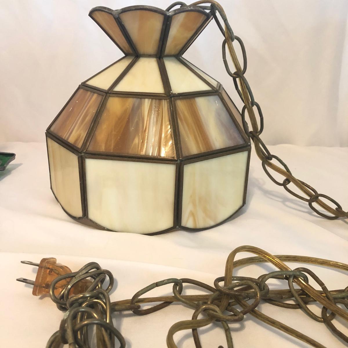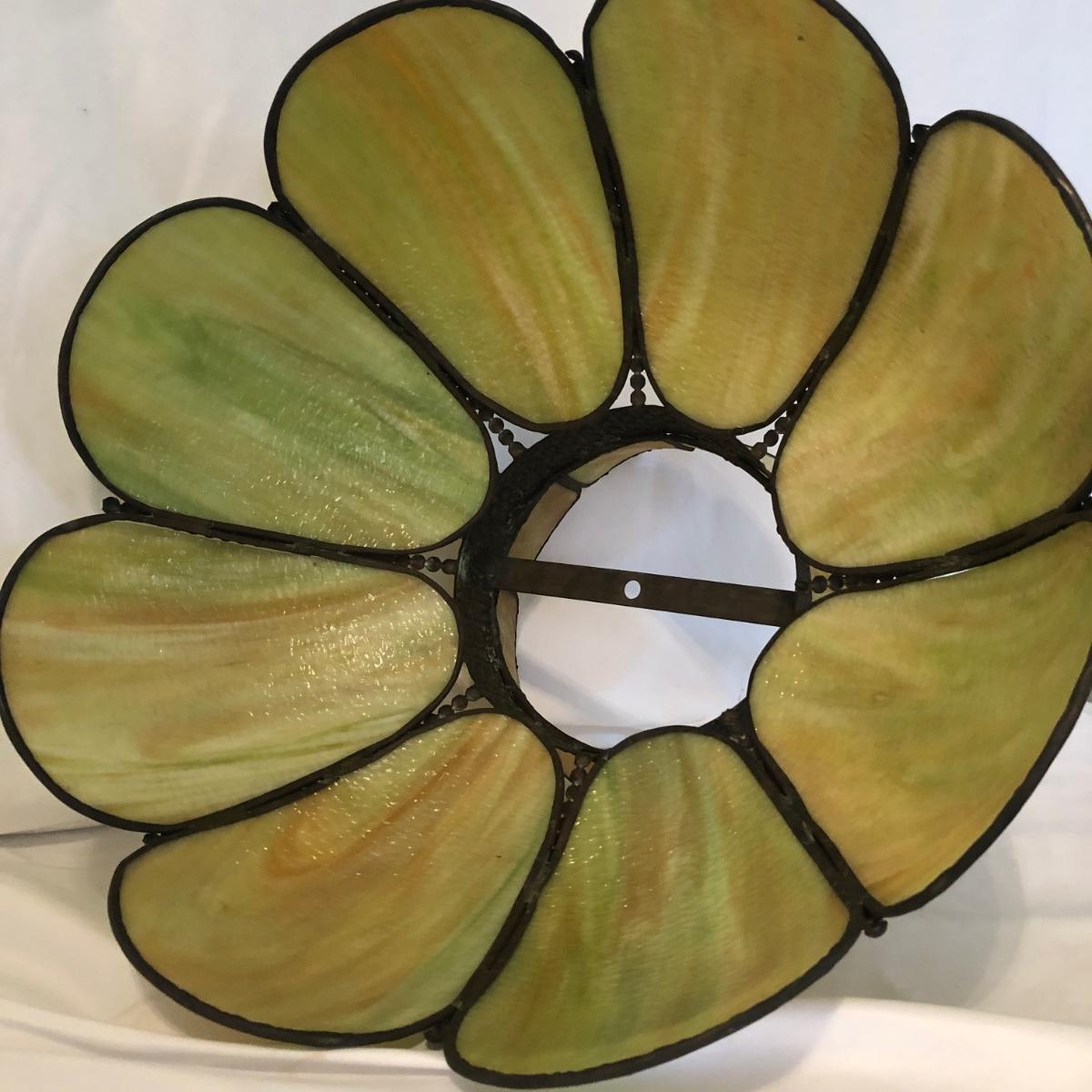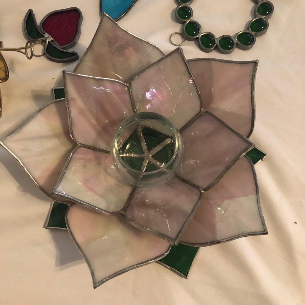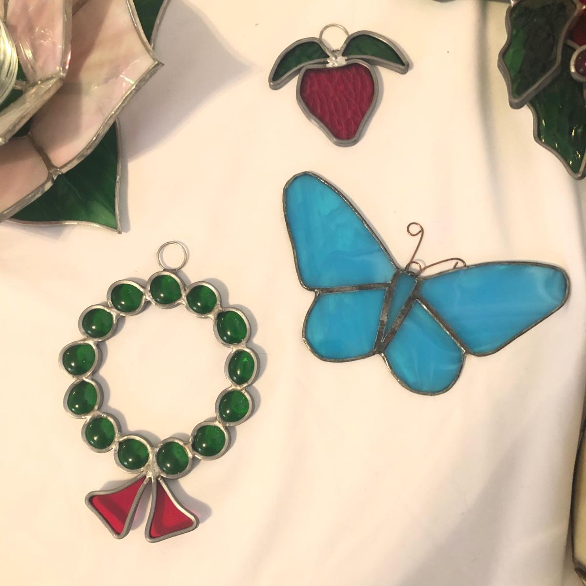 This stained glass collection features a green and brown lamp shade made with kiln slumped stained glass 8 panels that is 19” in diameter and 12” tall. An amber glass lamp shade with an 11’ cord and chain; it worked when plugged in. Other stained glass includes a circle of Christmas angels in green and red with candle holders that measures 14” in diameter and is 9” tall. In the Christmas theme there is also a gold tone angel with a horn and a small window Christmas wreath. Other items include a pink lotus flower candle holder with tea candle holder, a blue butterfly, and a strawberry. One of the angels in the Christmas circle is missing it’s amber gem head and the break in the solder line is clean, another angel’s crown is present but not attached. Shipping Available.