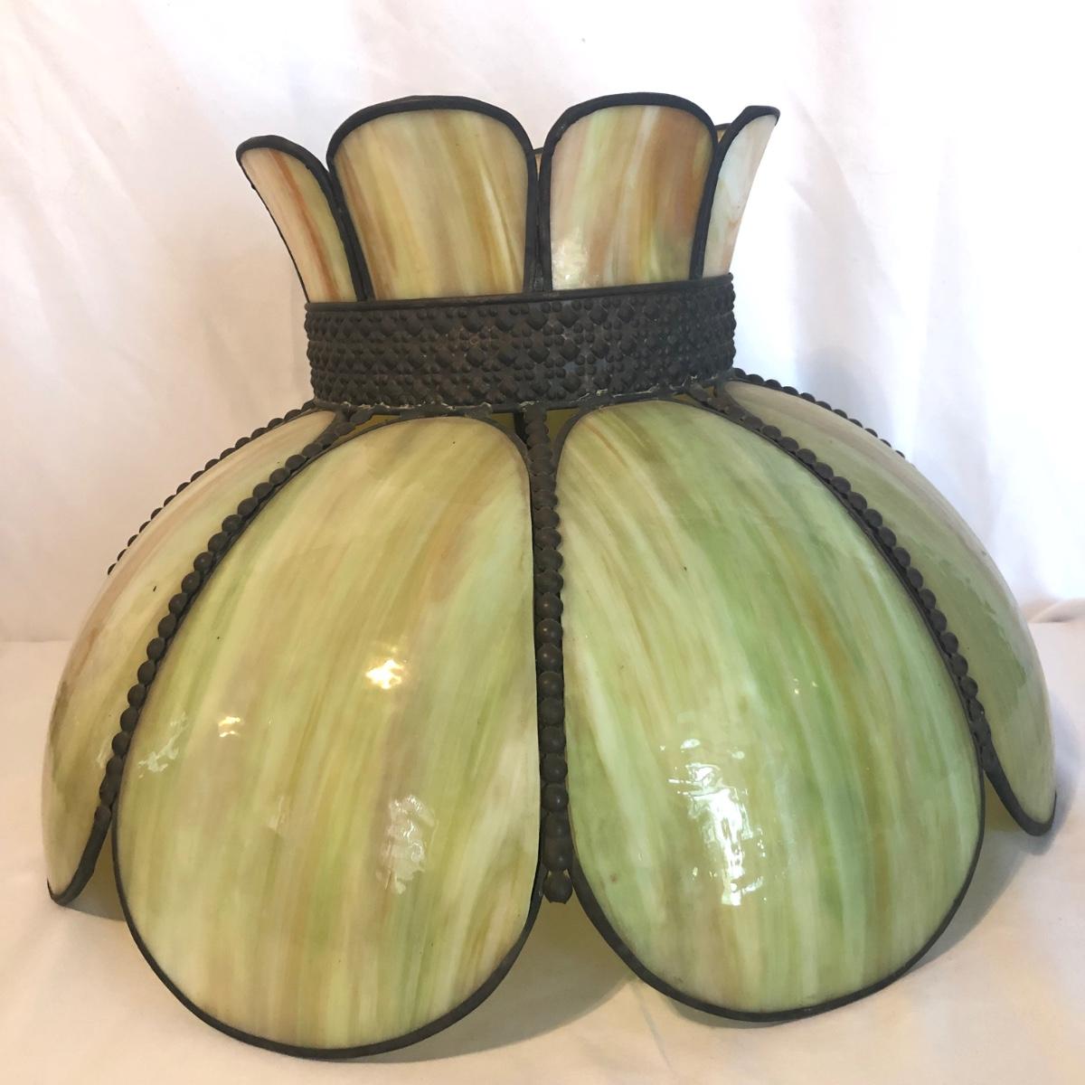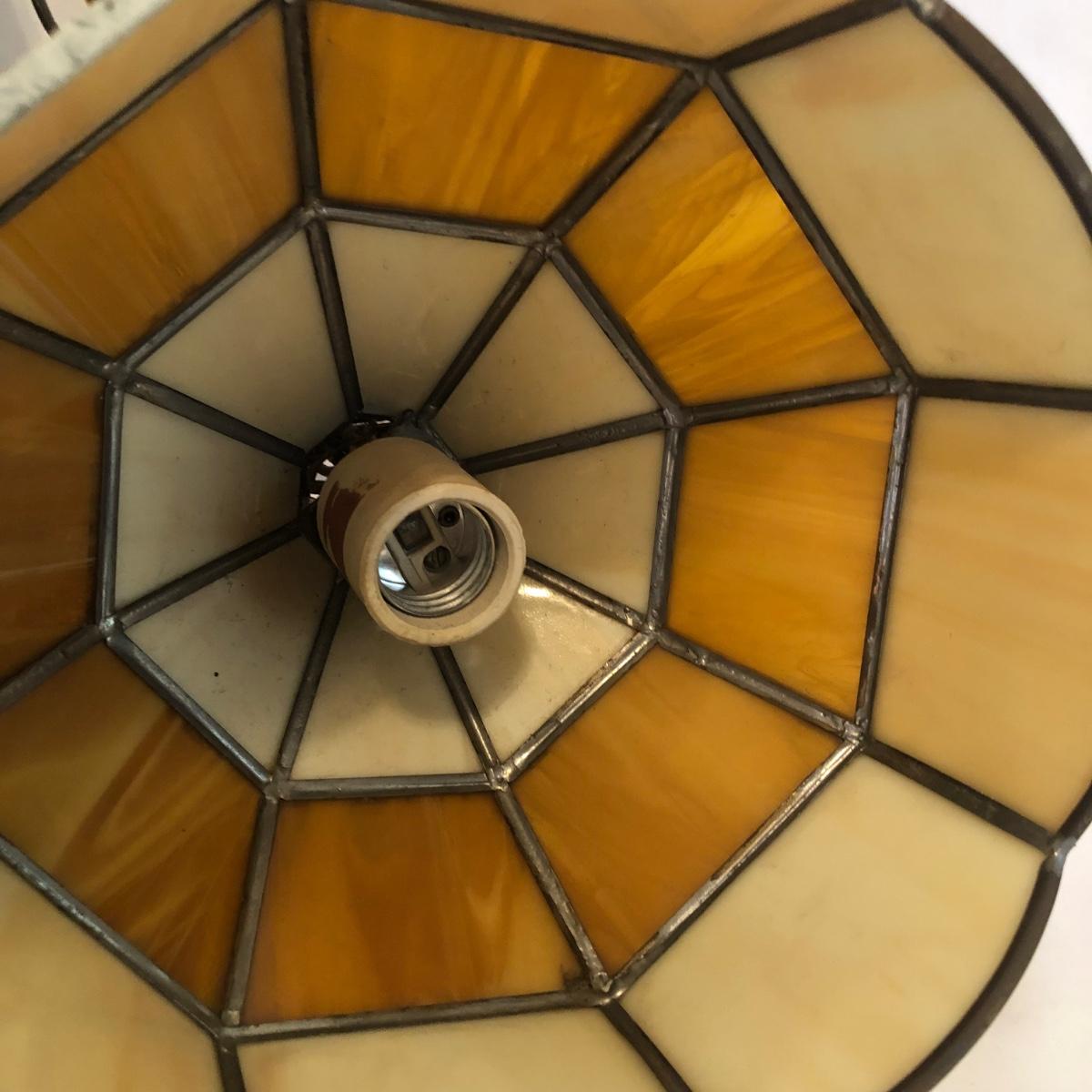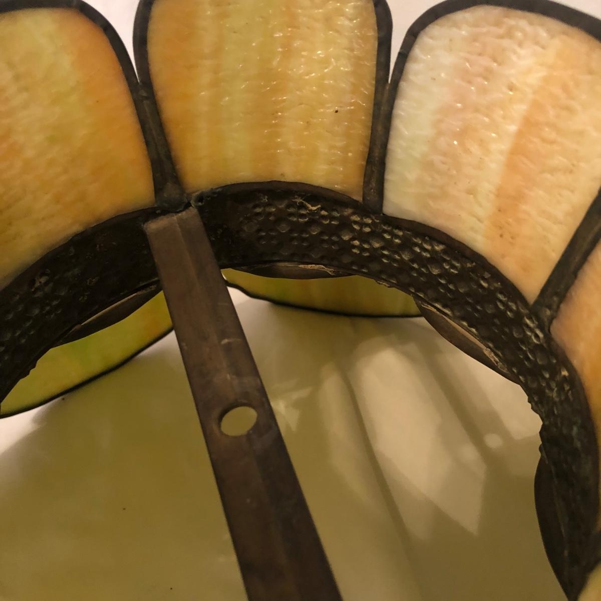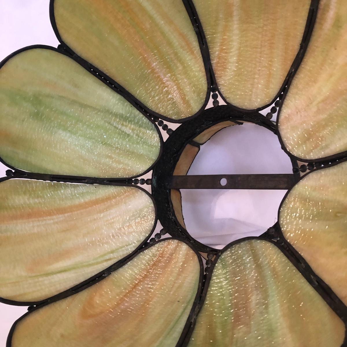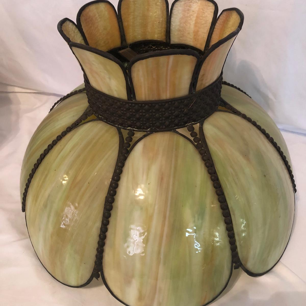 This stained glass collection features a green and brown lamp shade made with kiln slumped stained glass 8 panels that is 19” in diameter and 12” tall. An amber glass lamp shade with an 11’ cord and chain; it worked when plugged in. Other stained glass includes a circle of Christmas angels in green and red with candle holders that measures 14” in diameter and is 9” tall. In the Christmas theme there is also a gold tone angel with a horn and a small window Christmas wreath. Other items include a pink lotus flower candle holder with tea candle holder, a blue butterfly, and a strawberry. One of the angels in the Christmas circle is missing it’s amber gem head and the break in the solder line is clean, another angel’s crown is present but not attached. Shipping Available.