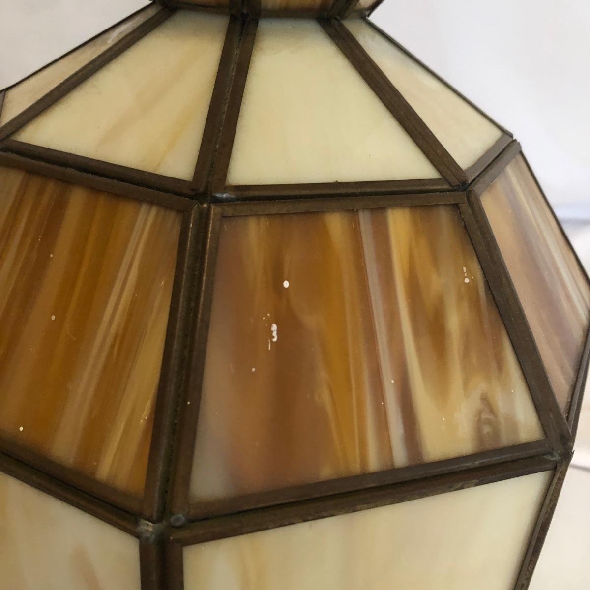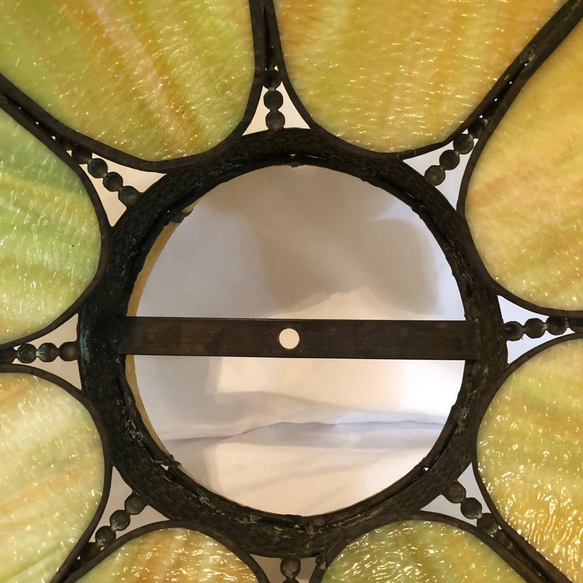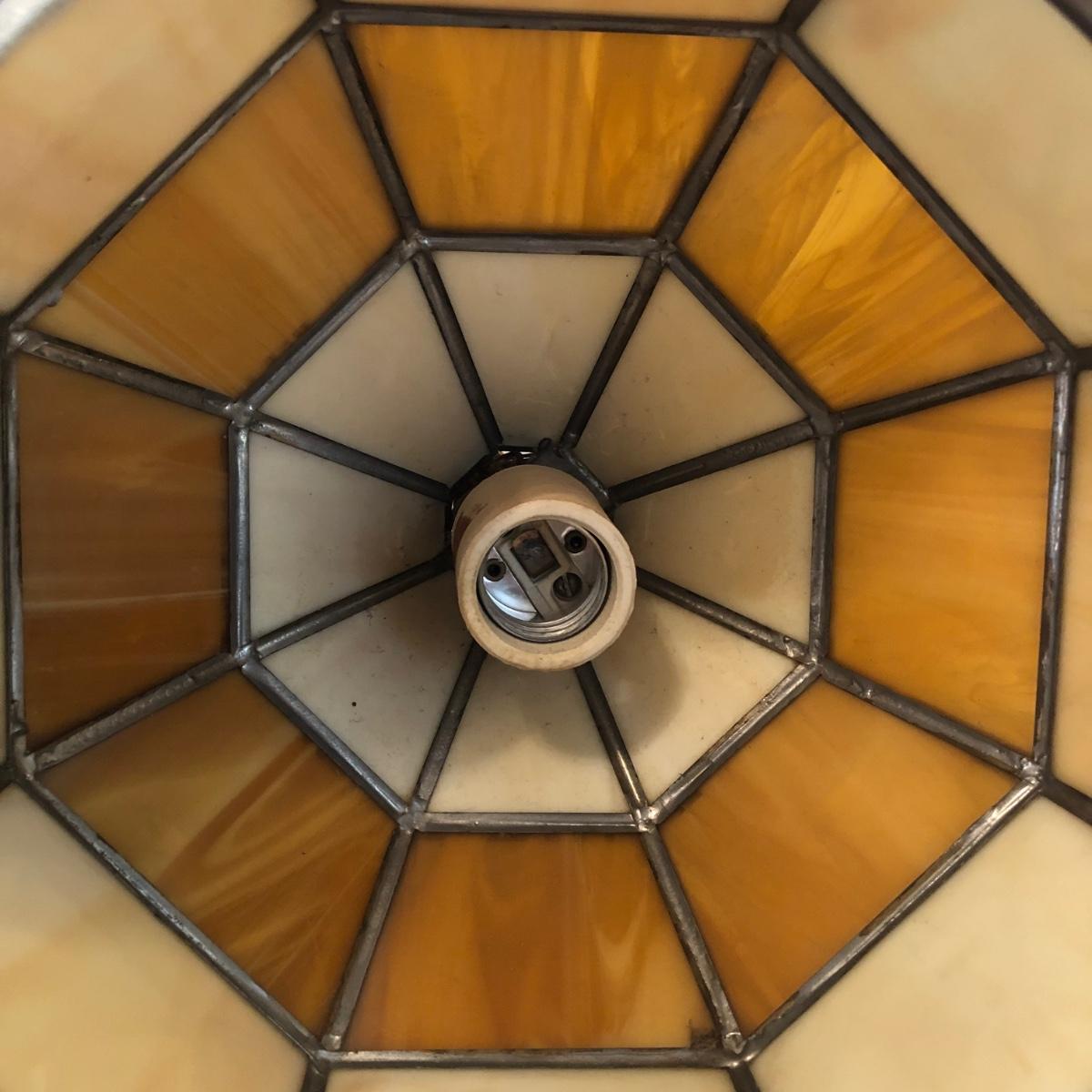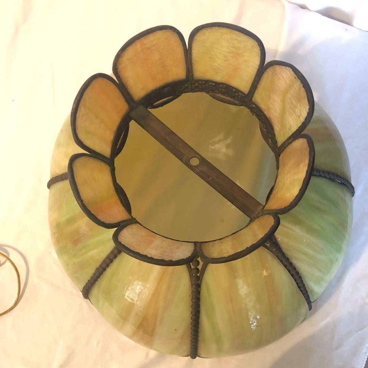This stained glass collection features a green and brown lamp shade made with kiln slumped stained glass 8 panels that is 19” in diameter and 12” tall. An amber glass lamp shade with an 11’ cord and chain; it worked when plugged in. Other stained glass includes a circle of Christmas angels in green and red with candle holders that measures 14” in diameter and is 9” tall. In the Christmas theme there is also a gold tone angel with a horn and a small window Christmas wreath. Other items include a pink lotus flower candle holder with tea candle holder, a blue butterfly, and a strawberry. One of the angels in the Christmas circle is missing it’s amber gem head and the break in the solder line is clean, another angel’s crown is present but not attached. Shipping Available.