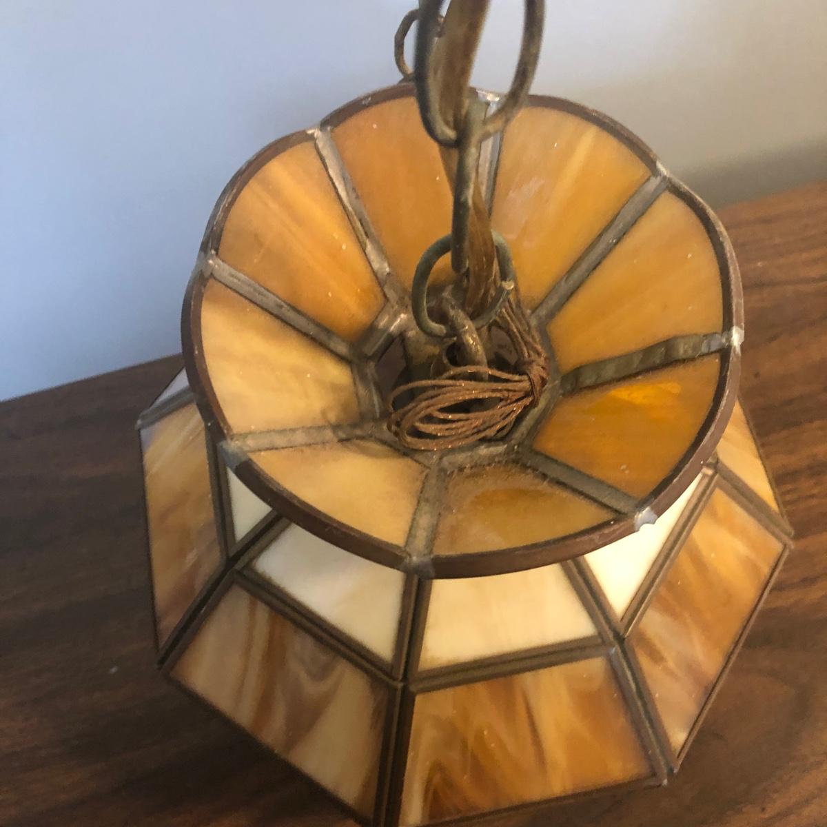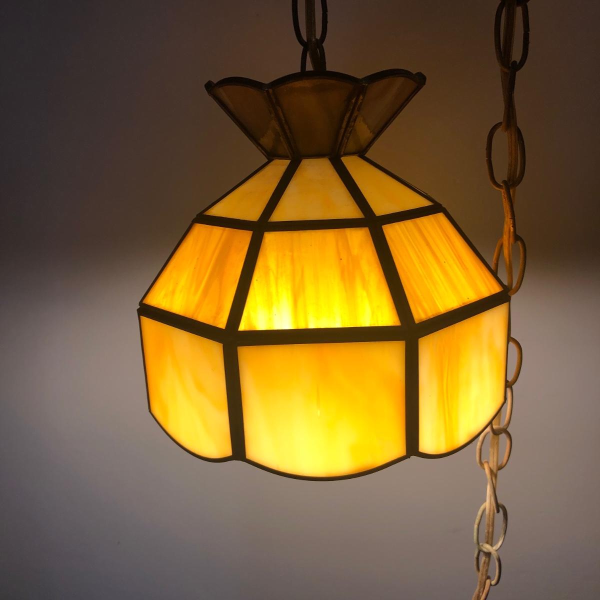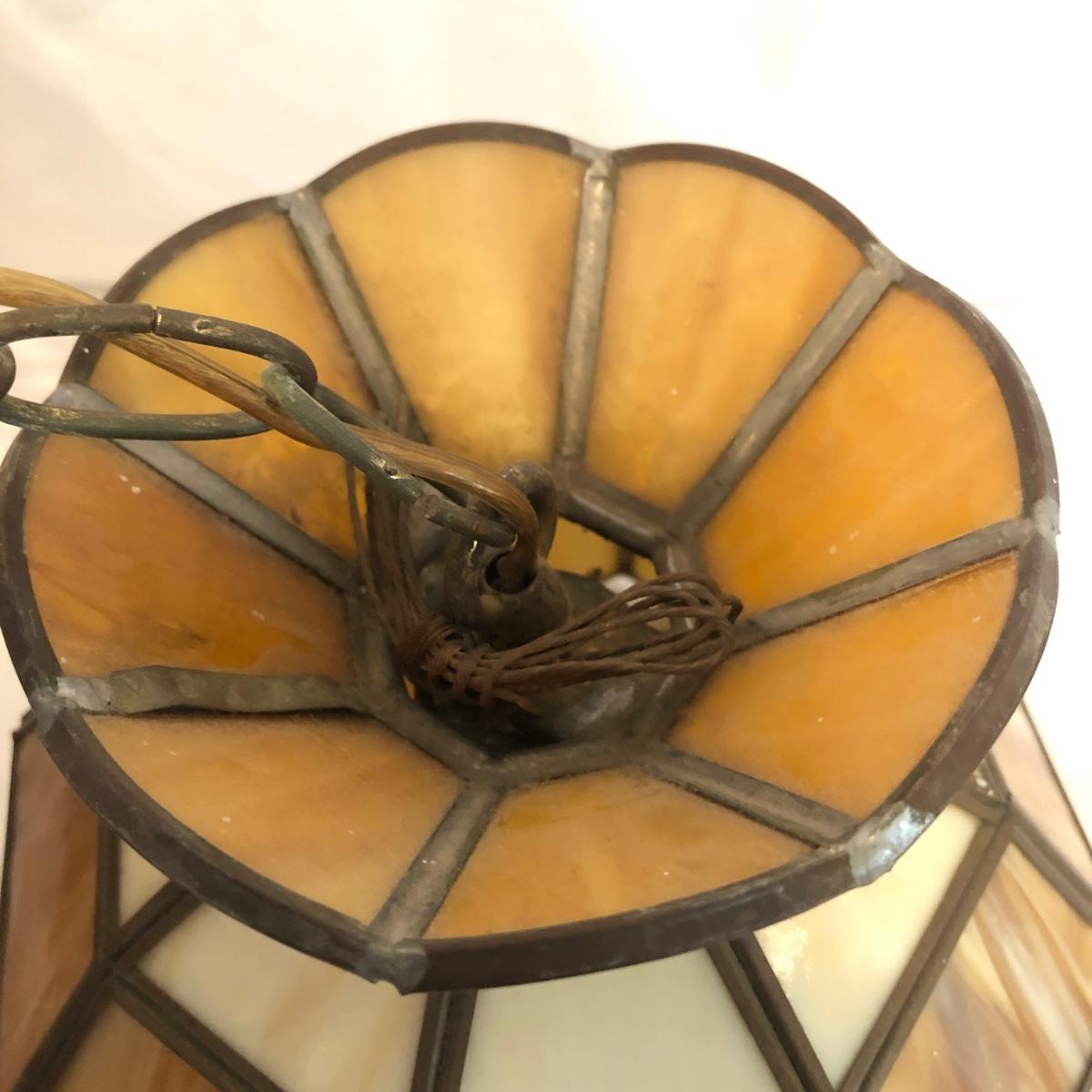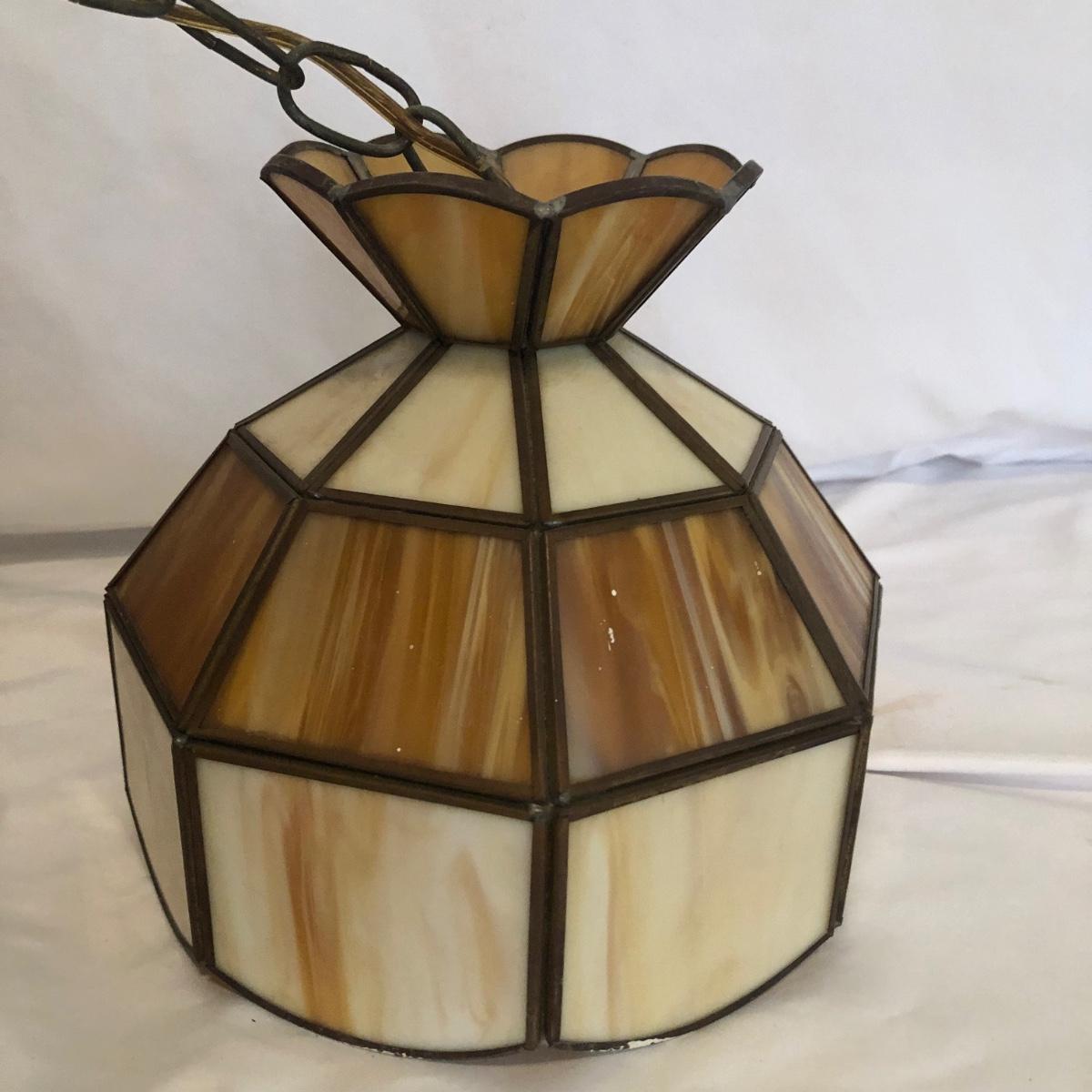 This stained glass collection features a green and brown lamp shade made with kiln slumped stained glass 8 panels that is 19” in diameter and 12” tall. An amber glass lamp shade with an 11’ cord and chain; it worked when plugged in. Other stained glass includes a circle of Christmas angels in green and red with candle holders that measures 14” in diameter and is 9” tall. In the Christmas theme there is also a gold tone angel with a horn and a small window Christmas wreath. Other items include a pink lotus flower candle holder with tea candle holder, a blue butterfly, and a strawberry. One of the angels in the Christmas circle is missing it’s amber gem head and the break in the solder line is clean, another angel’s crown is present but not attached. Shipping Available.