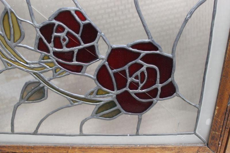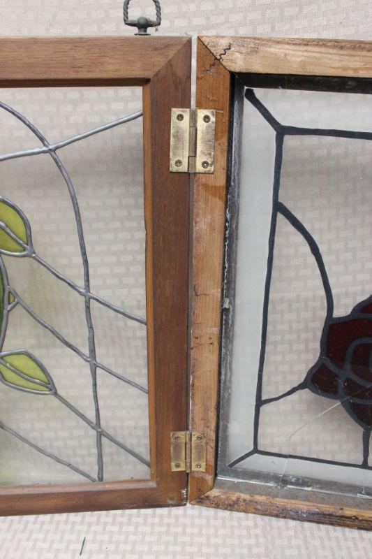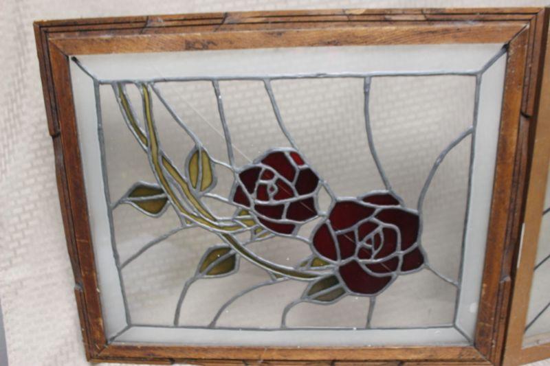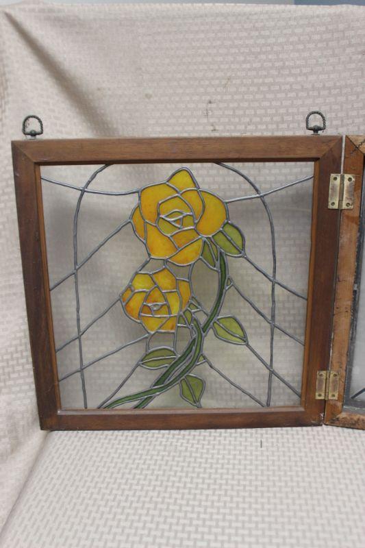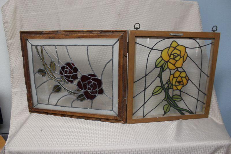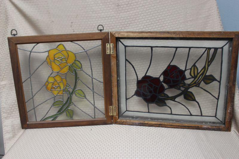 Pair of Framed Stainglass Art Pieces. Yellow roses and red roses. The yellow roses are in great condition. Unfortunately, the red roses have a crack in the glass, but can still be displayed. They are joined together by hinges, unsure why they are hinged together, but can be separated. Yellow measures roughly 18x18 and the red 22x18.