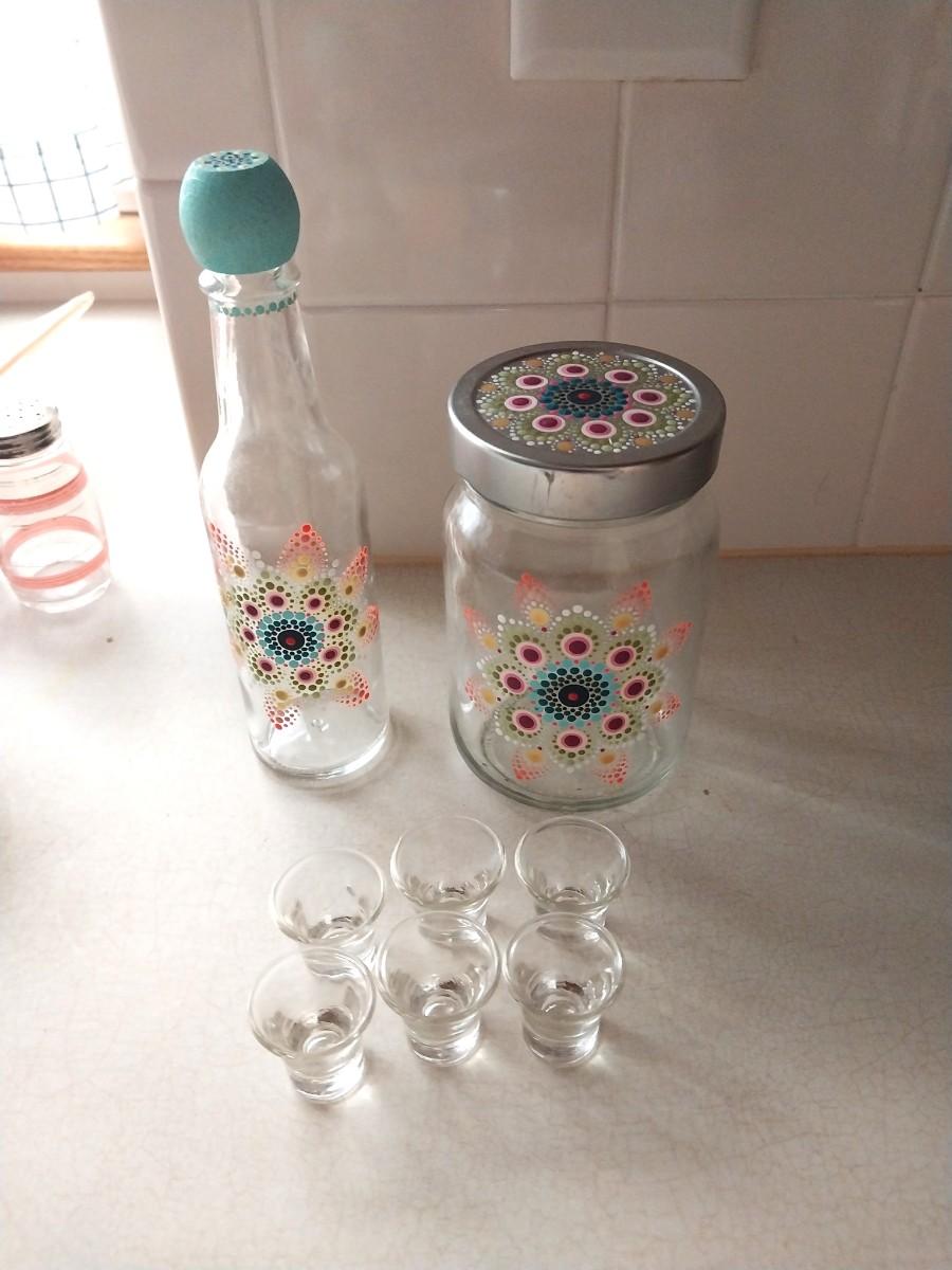 STAINGLASS SWANE-VINTAGE SALT & PEPPER SHAKERS-HAND PAINTED JAR & BOTTLE-VINTAGE TABLECLOTH