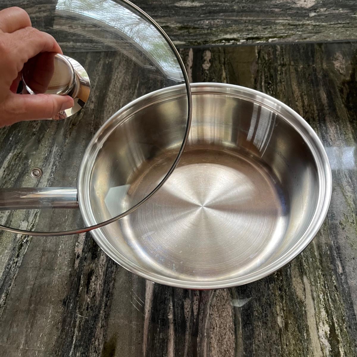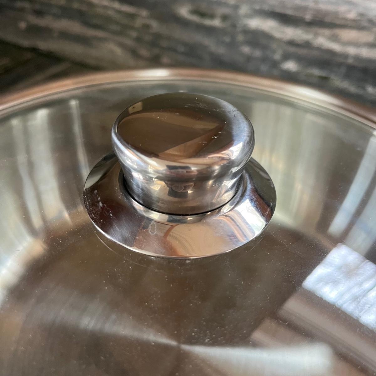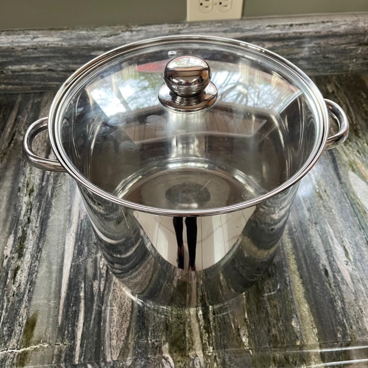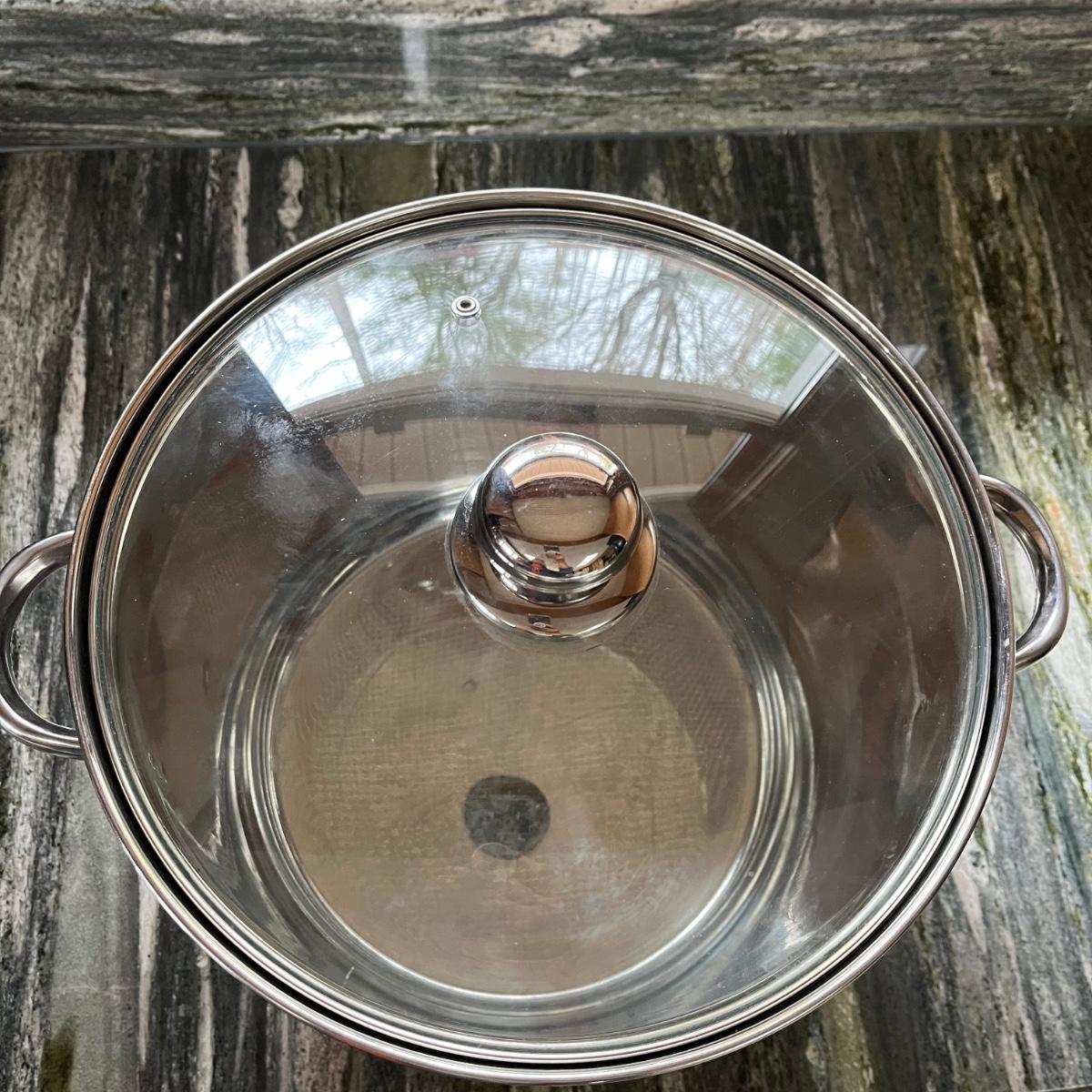 This collection contains six items. One large stock pot with glass lid measuring 12”D x 12”H to top of handle. one sauté pan with glass lid, a Presto traditional pressure cooker, two strainers and a folding splatter shield. Signs of wear. Shipping available.