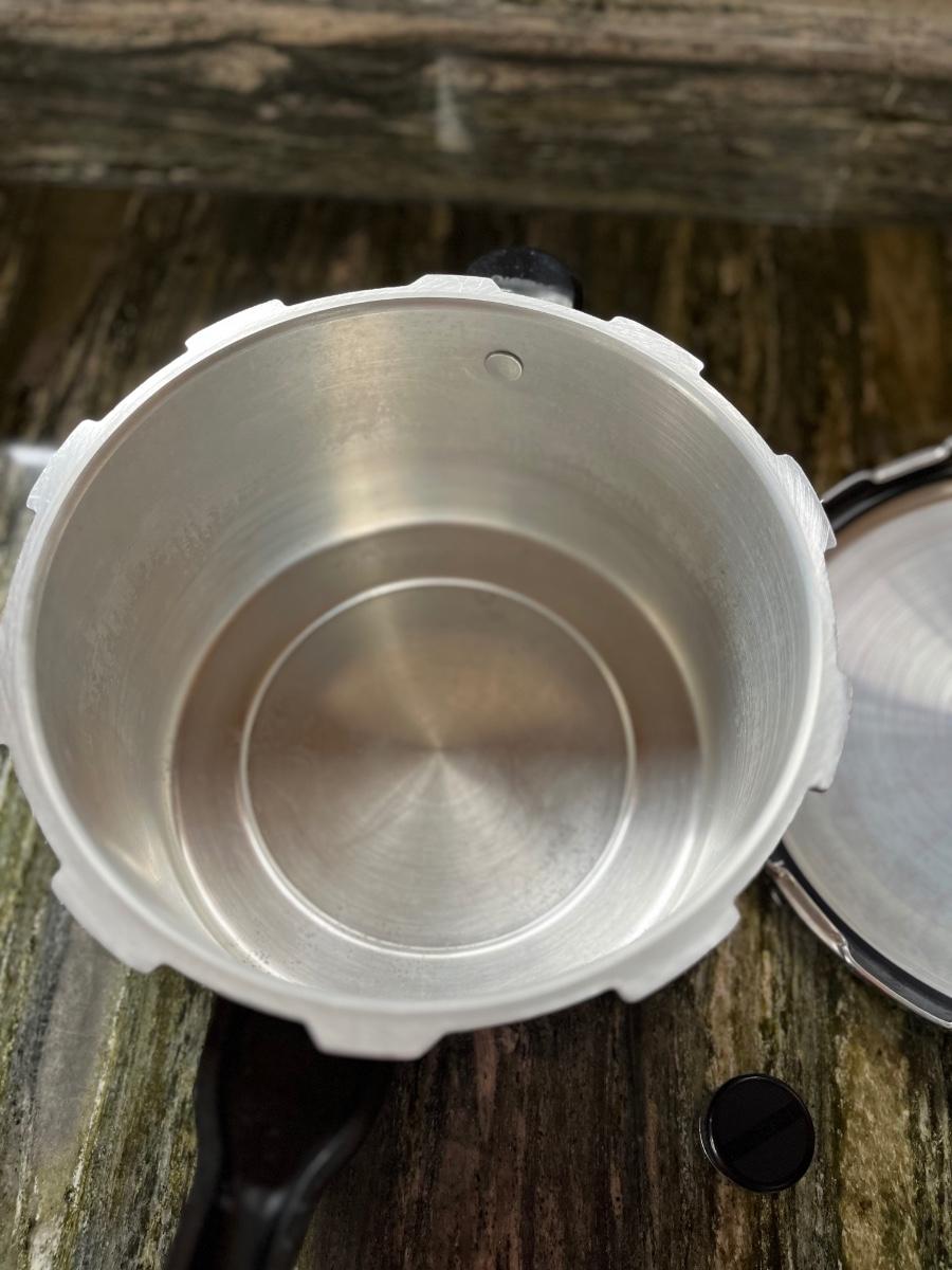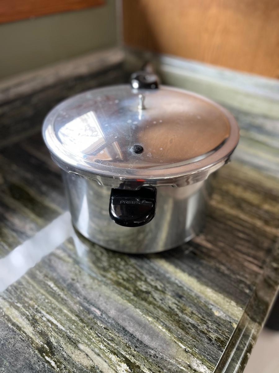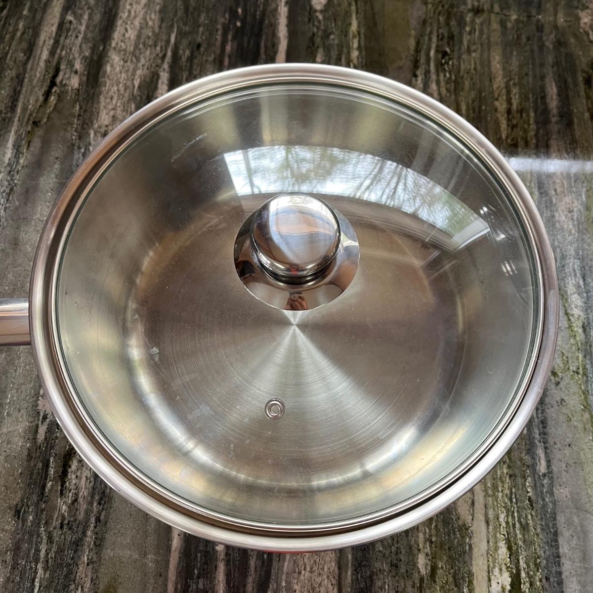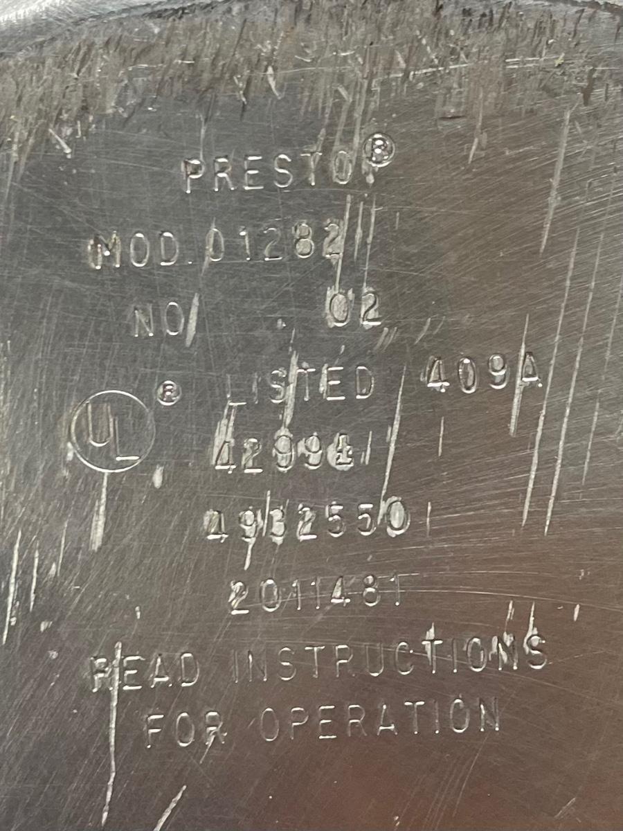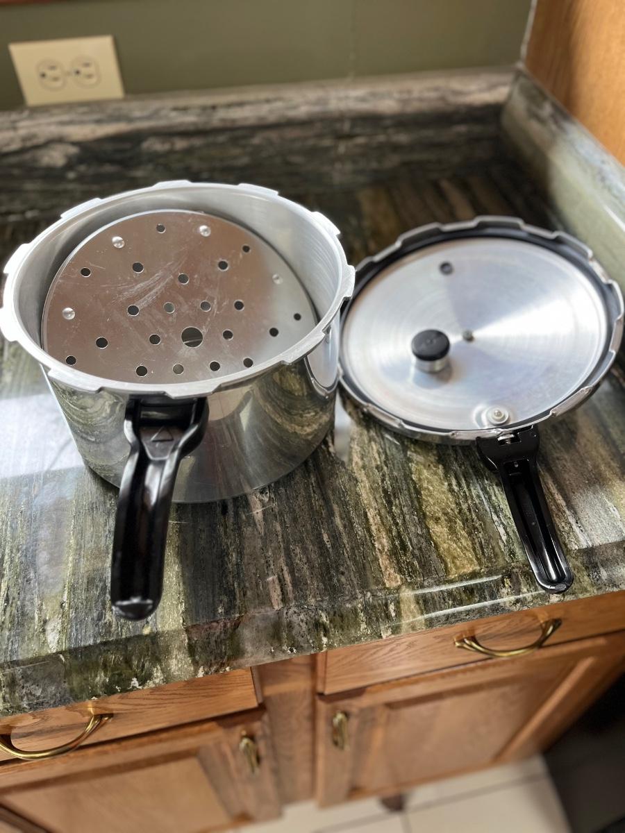 This collection contains six items. One large stock pot with glass lid measuring 12”D x 12”H to top of handle. one sauté pan with glass lid, a Presto traditional pressure cooker, two strainers and a folding splatter shield. Signs of wear. Shipping available.