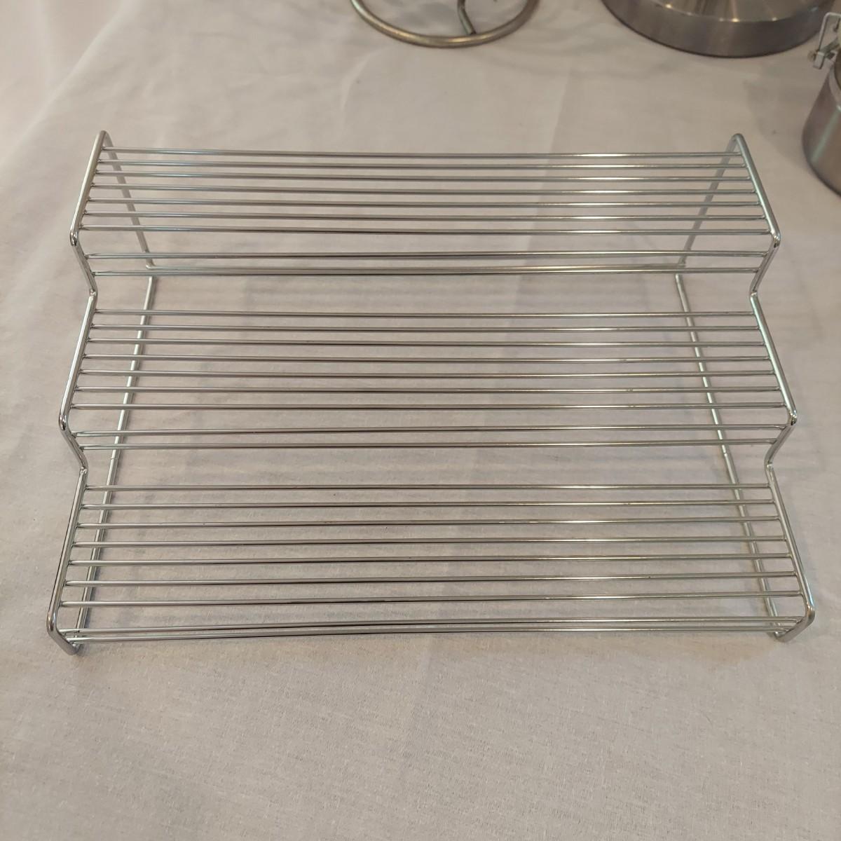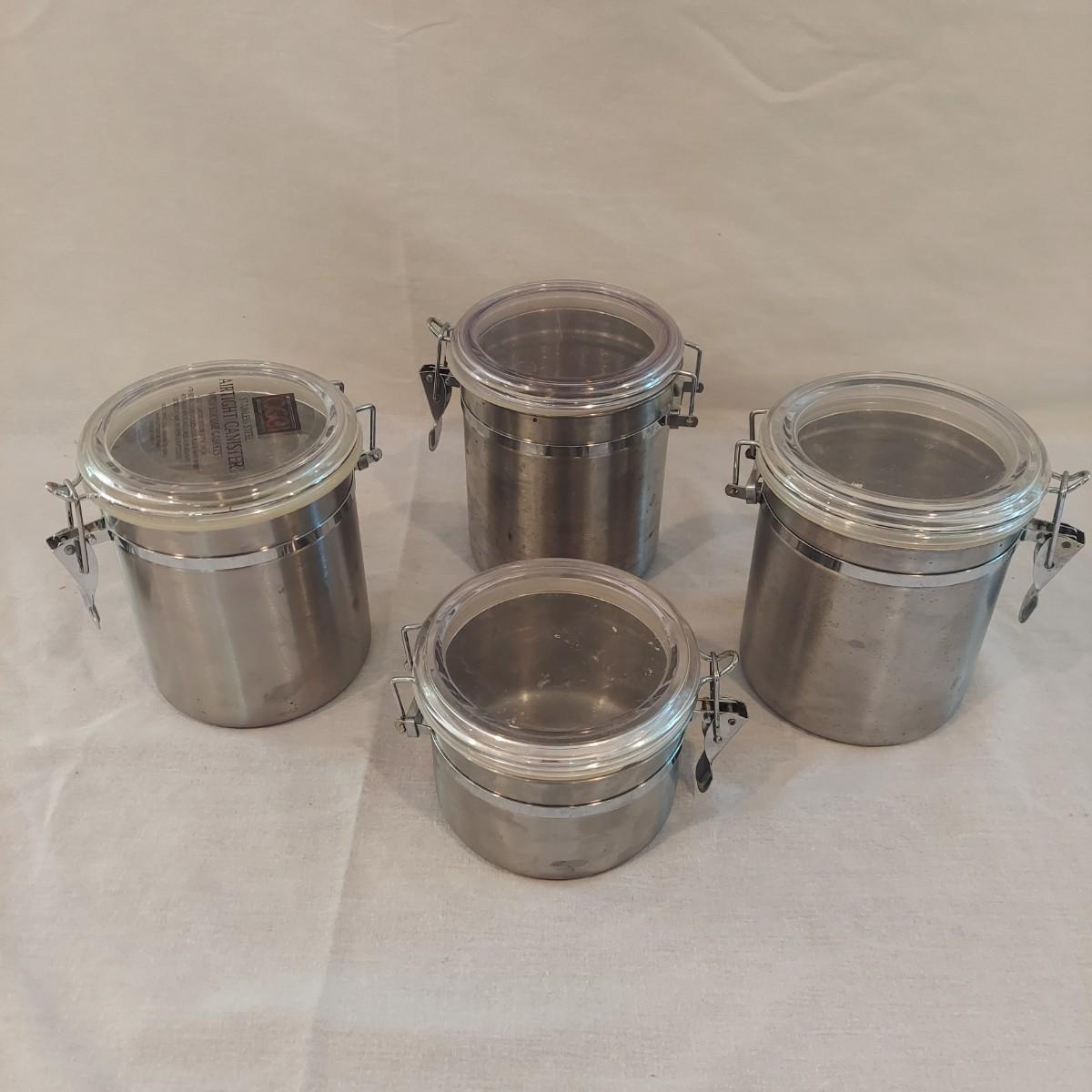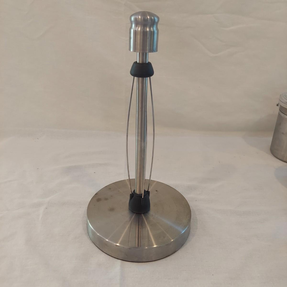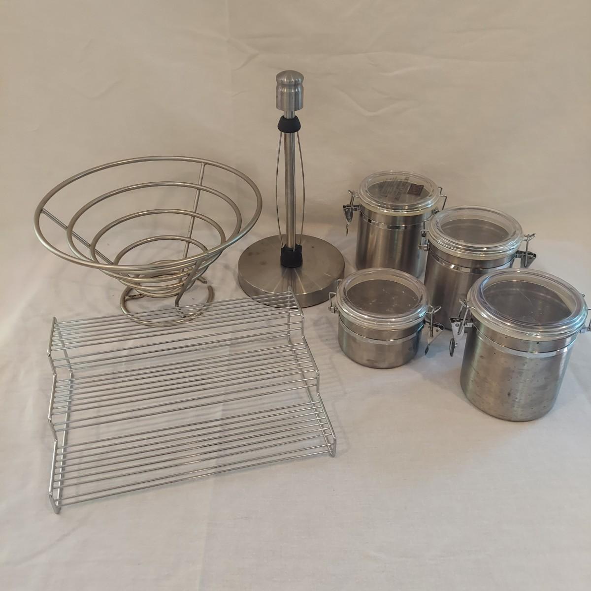 This lot includes a Perfect Tear Paper towel holder, four airtight canisters, a fruit bowl and a spice rack. The bowl measures 12"D and 7"H. Some items will need to be cleaned up. Shipping available