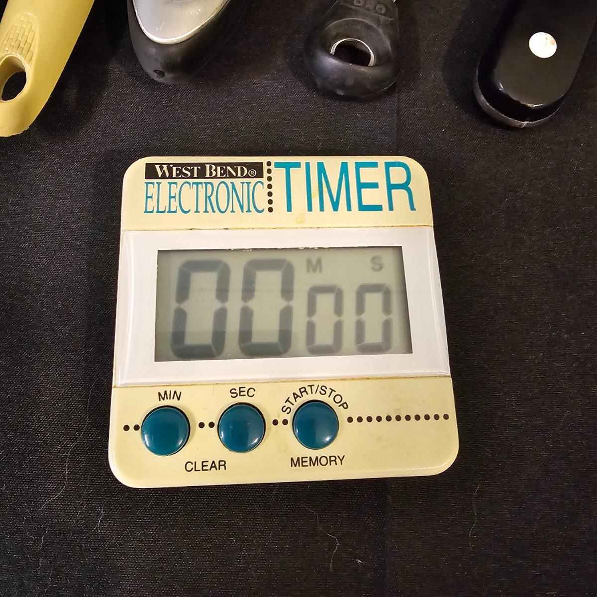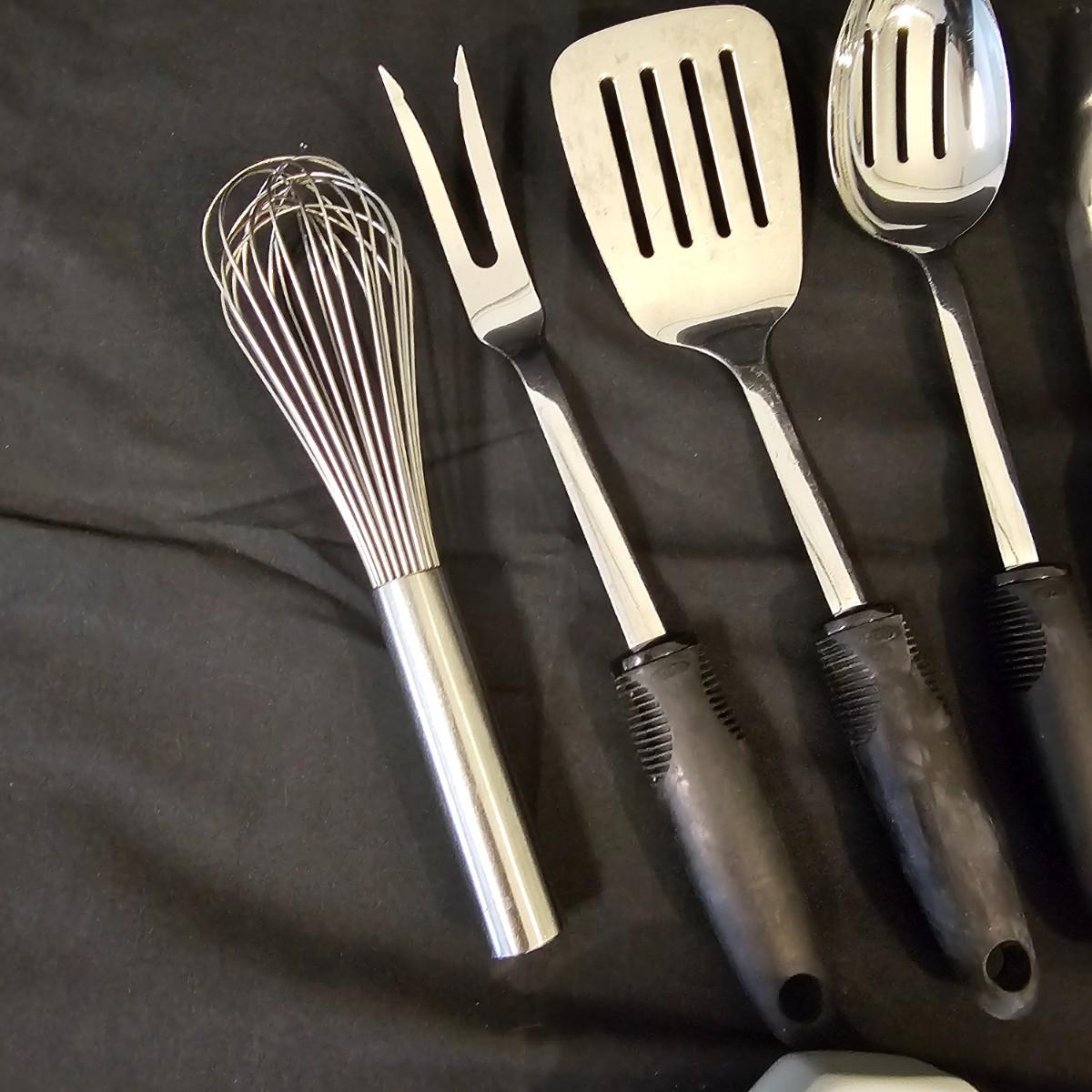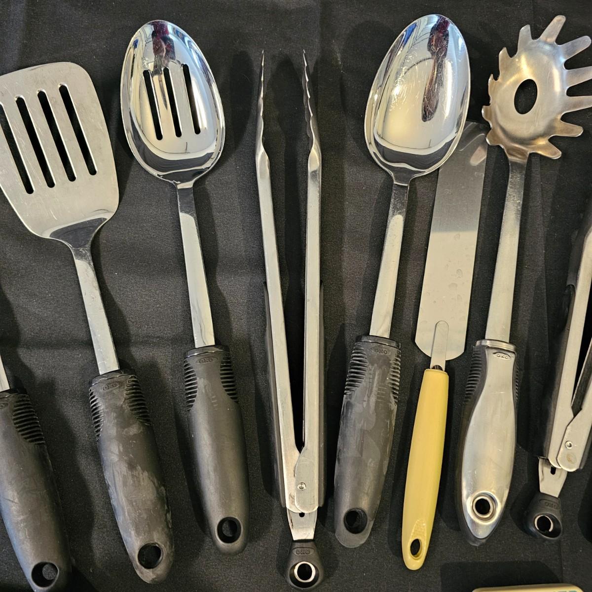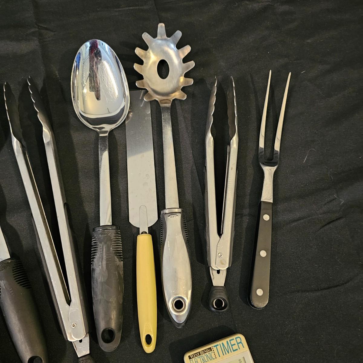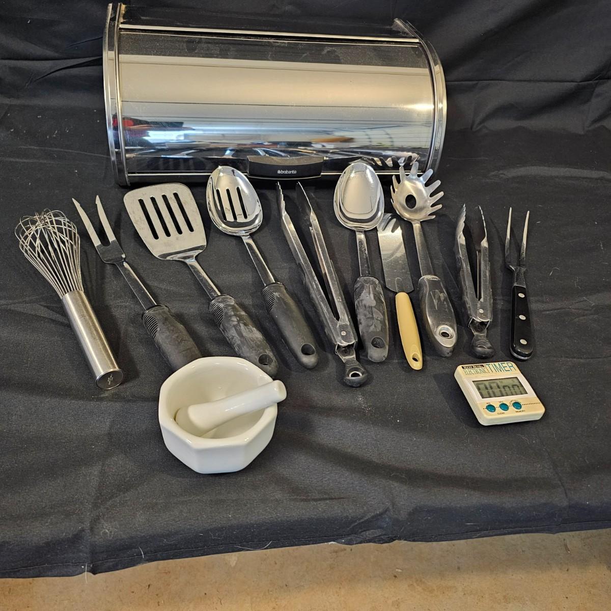 Ten different kitchen tools/utensils for cooking, serving, etc. Items by Oxo, Ecko and others. Longest piece is 13". Also includes a Brabantia toll top stainless bread box, measures 10" x 18" x 7"H. One ceramic mortar & pestle, 3.5"D, and one West Bend digital timer. See photos for details. Shipping available.