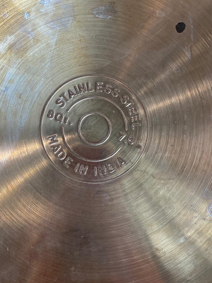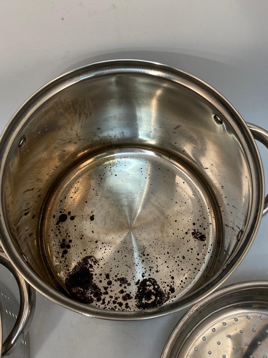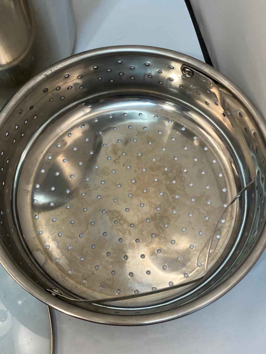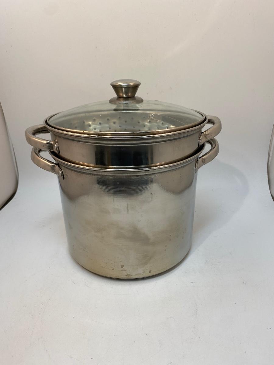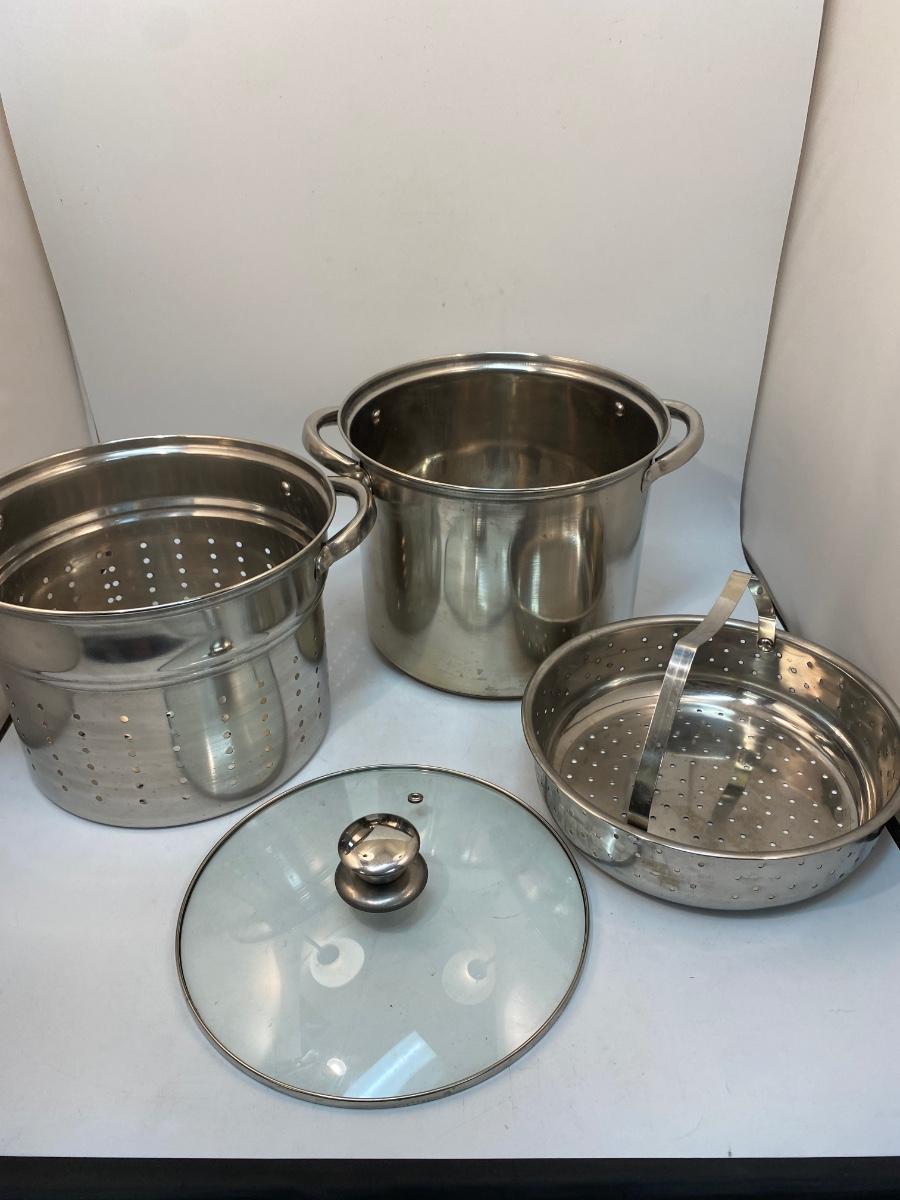 Stainless Steel 8qt Stock Pot with Steamer Basket & Colander Insert. Multi use pot with the added inserts for draining and steaming all at the same time. The stock pot itself looks like something was over cooked inside and needs a good cleaning. Unbranded.