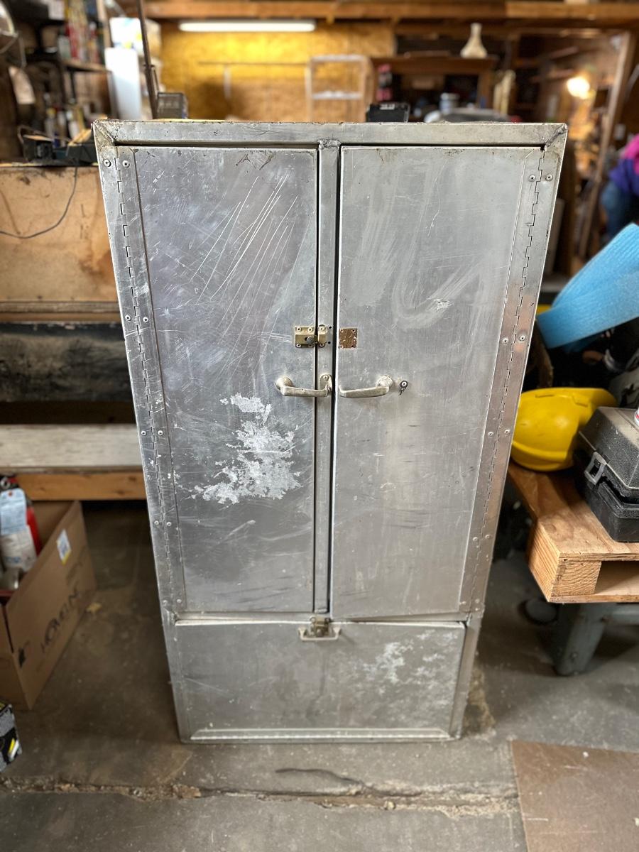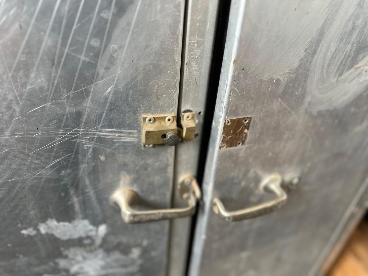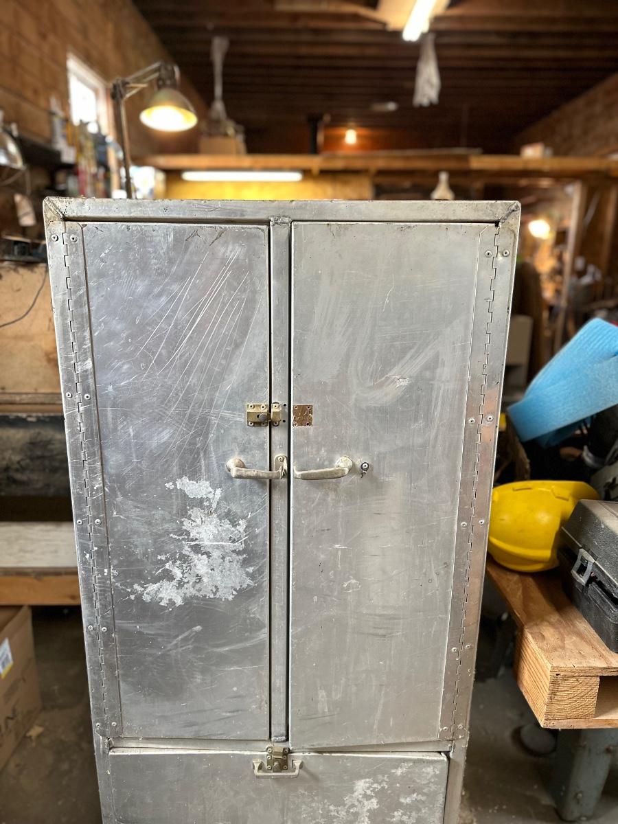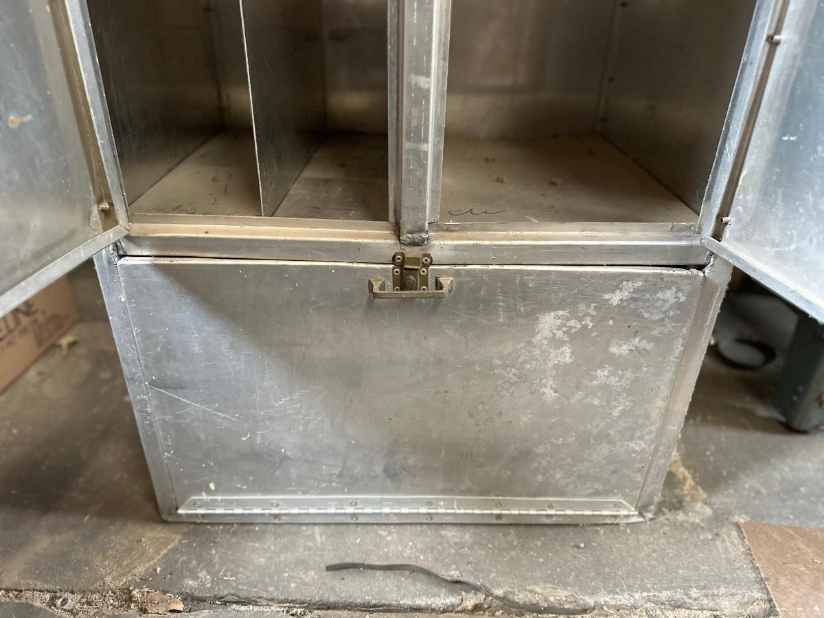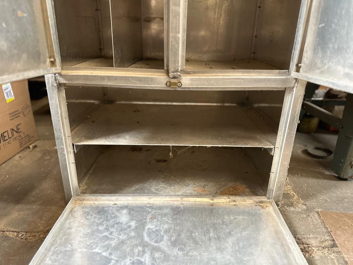 Stainless steel cabinet with shelving. One of the doors is missing the latch.