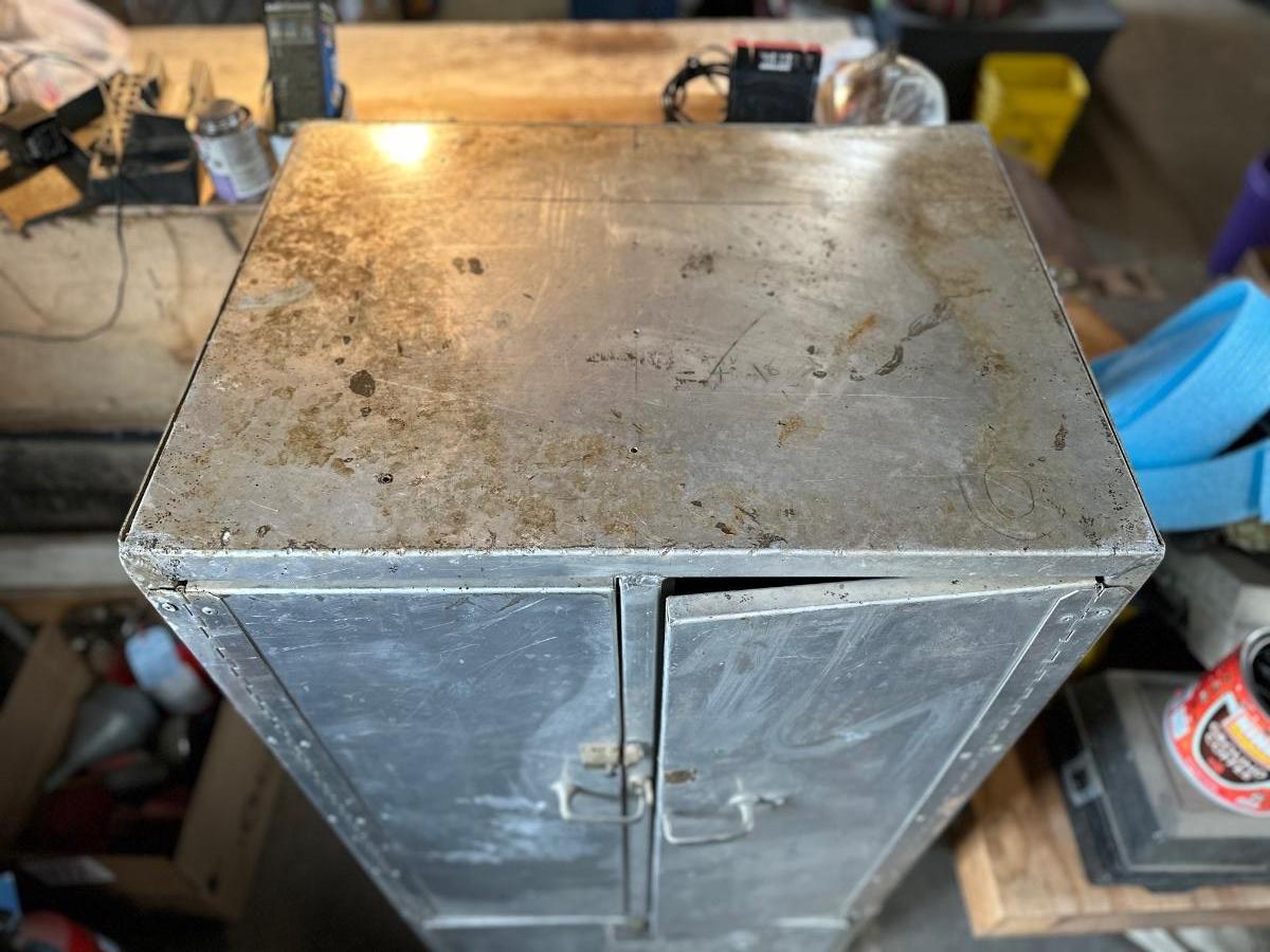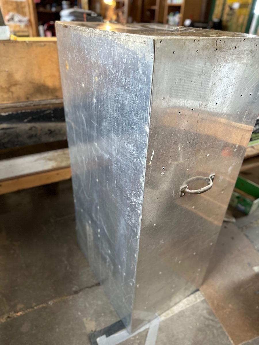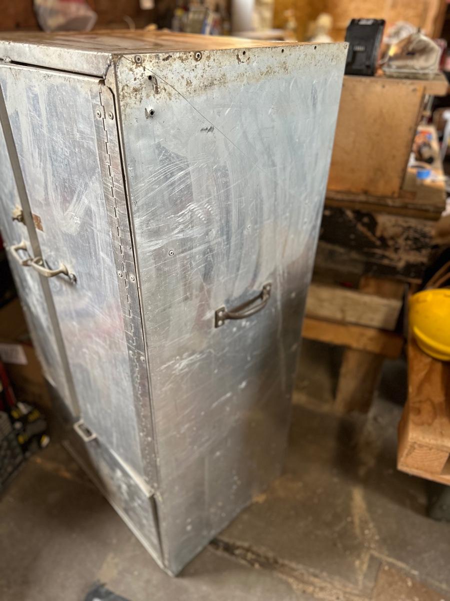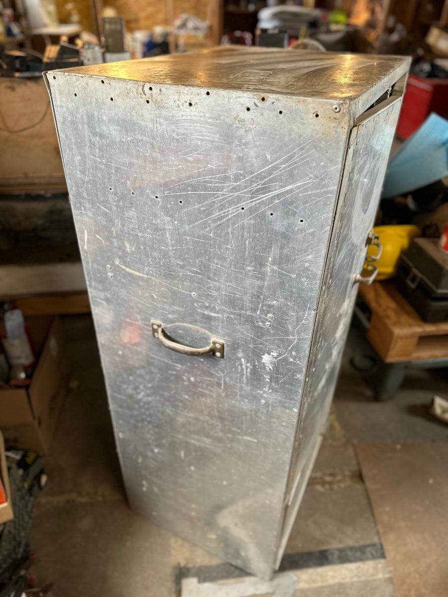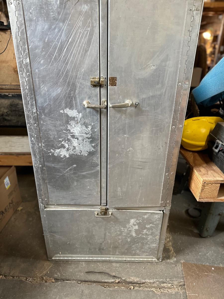Stainless steel cabinet with shelving. One of the doors is missing the latch.