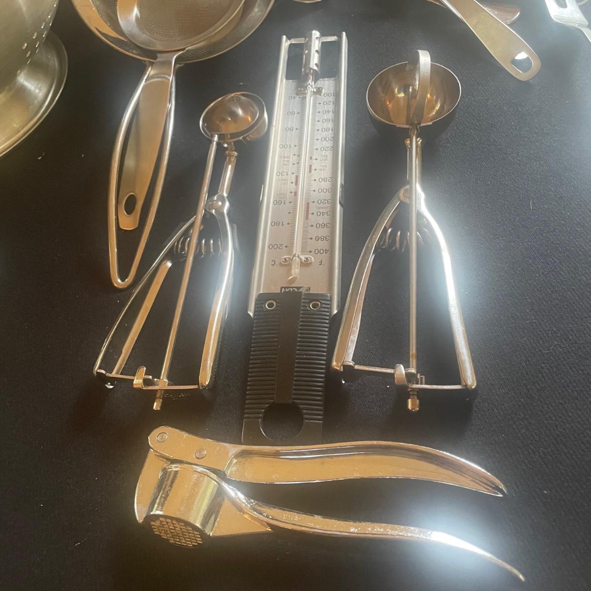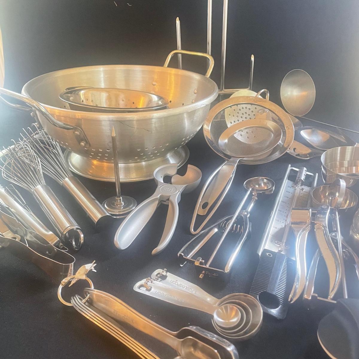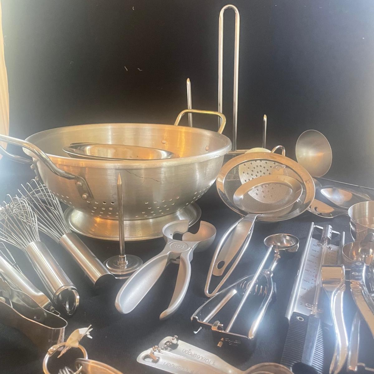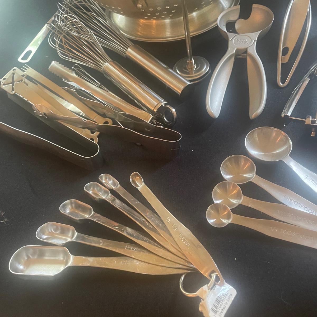 A nice assortment of stainless steel utensils that includes Cook’s Club, Faberware & more, see images. Includes colanders, whisks, strainers, measuring spoons, and much more!