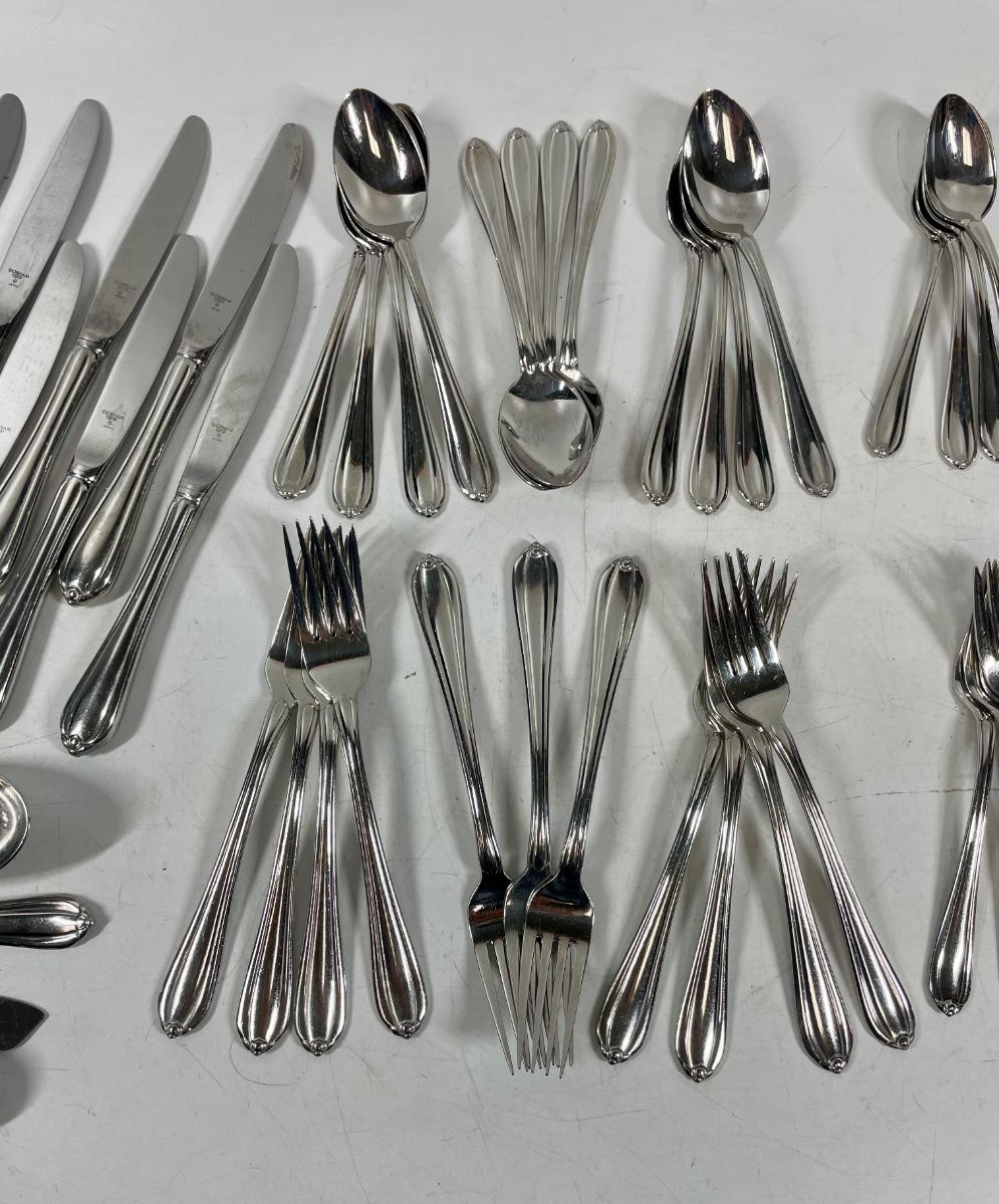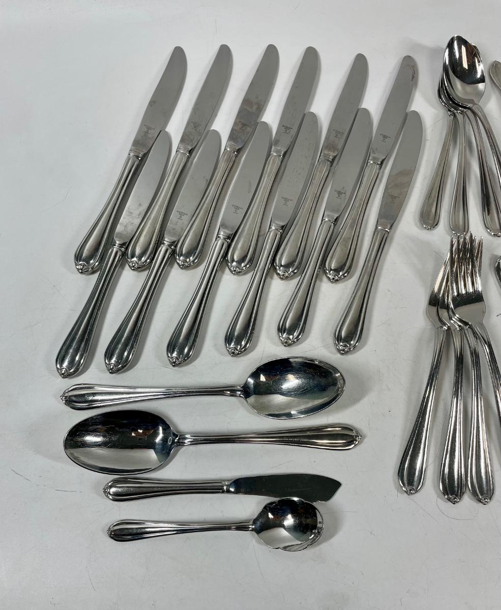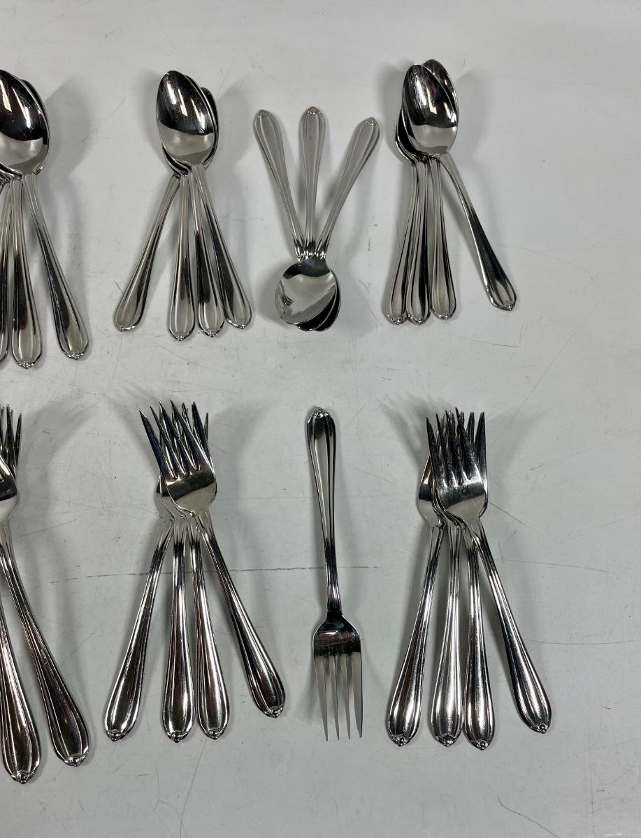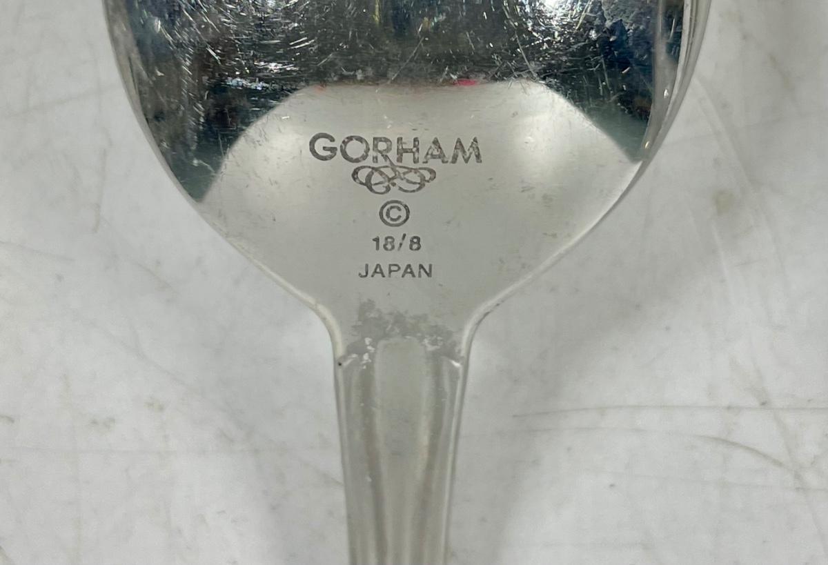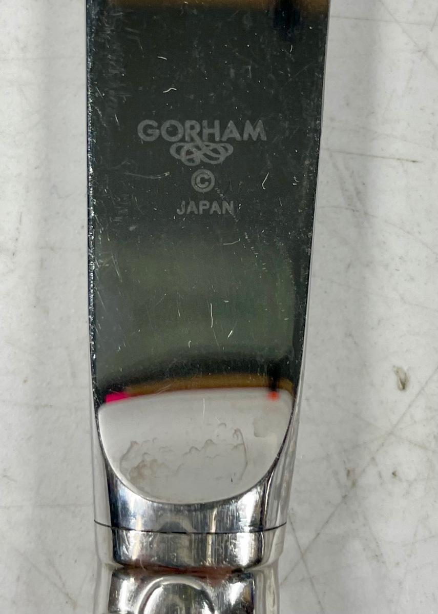 Made by Gorham, 18/8 stainless steel, pattern is Melon Bud. Includes 12 knives, 12 Soup Spoons, 11 Tea Spoons, 11 Dinner Forks, 9 Salad Forks, 2 large Servings Spoons, small butter knife and condiment spoon. Missing 1 teaspoon, 1 dinner fork, and 3 salad forks.