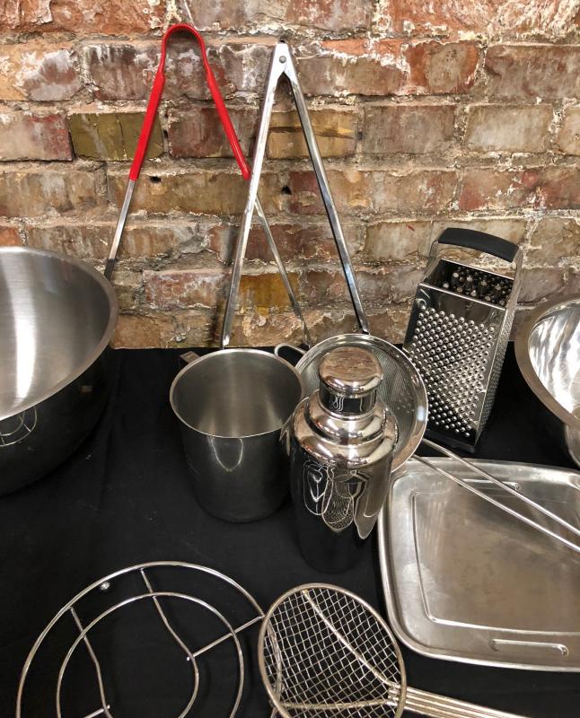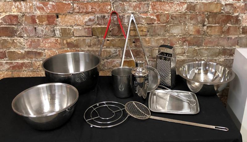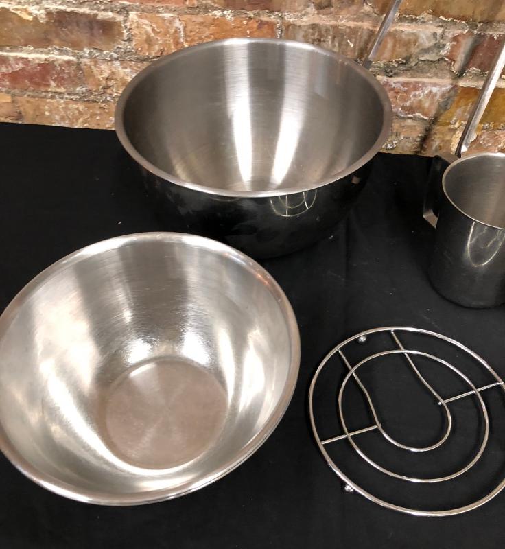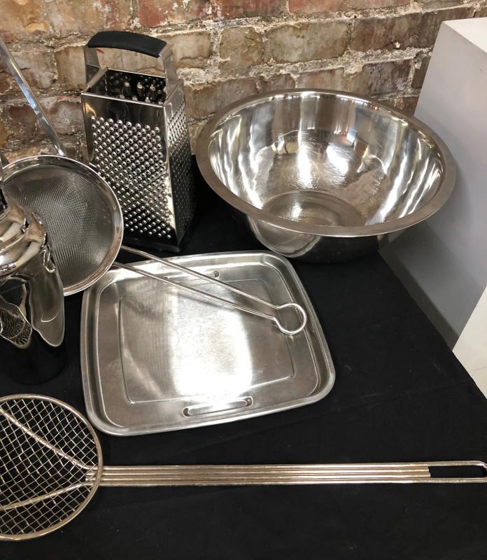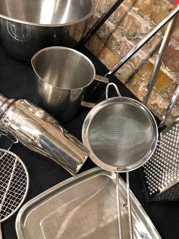 Strainers..mixing bowls..grater..cocktail shaker..tongs in this Stainless kitchen tool lot...