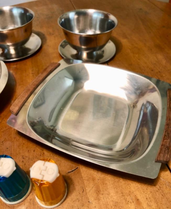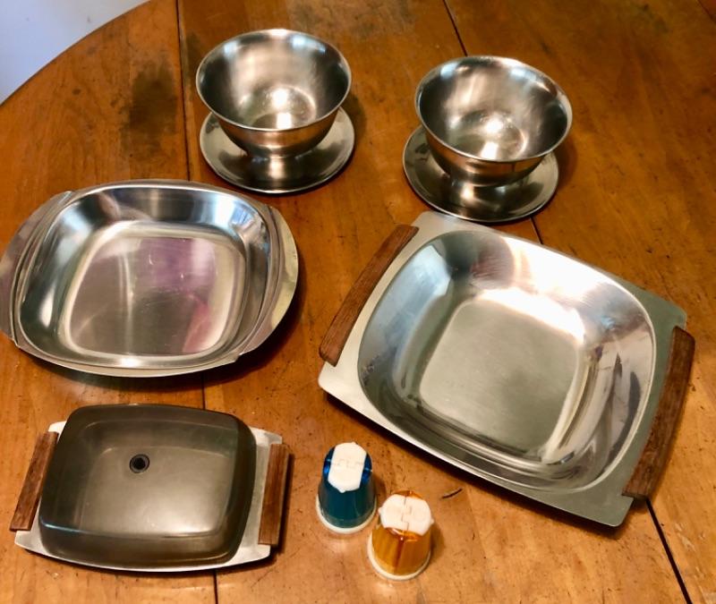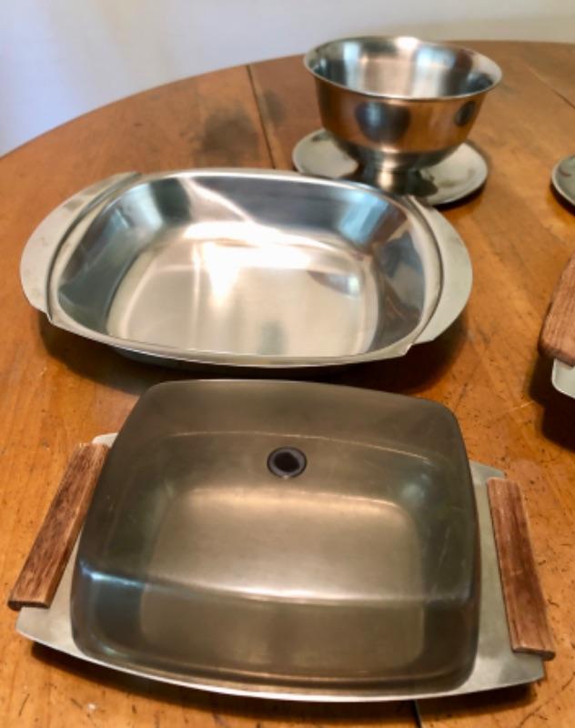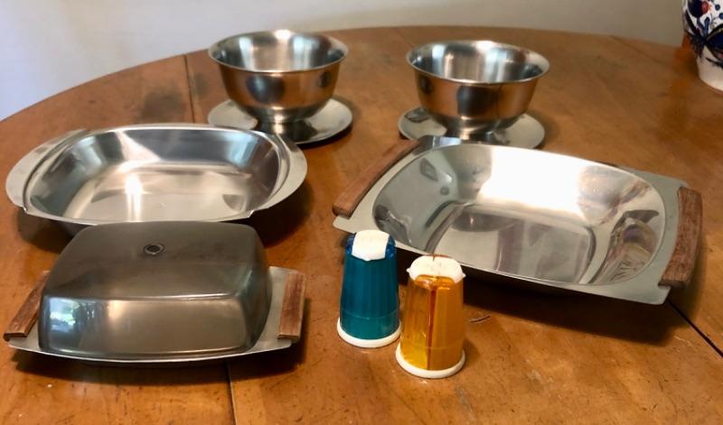 Stainless steel kitchen lot. 2 Bowls, 2 serving bowls, covered plate. Included are 2 plastic dual shakers. Salt on one side pepper on the other.