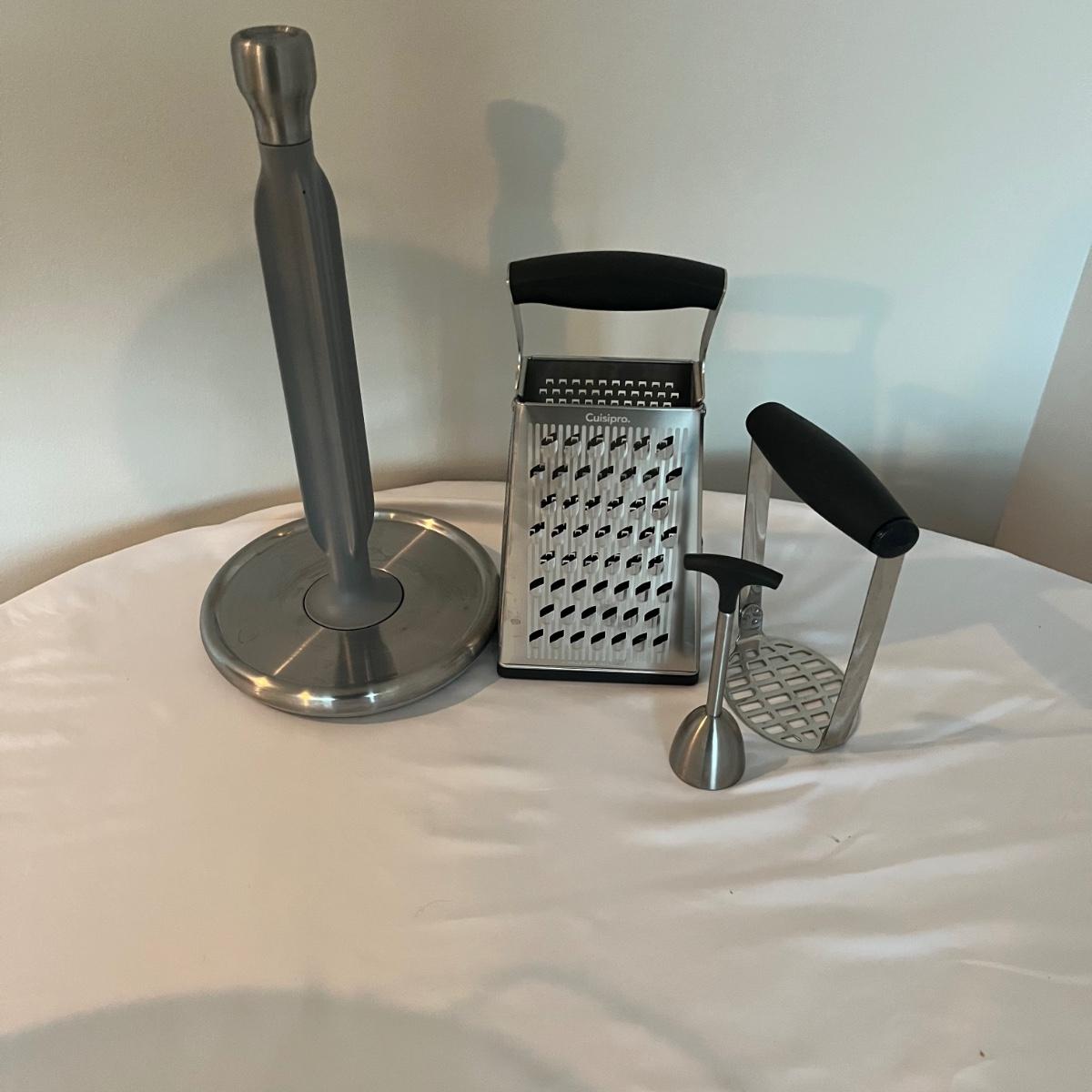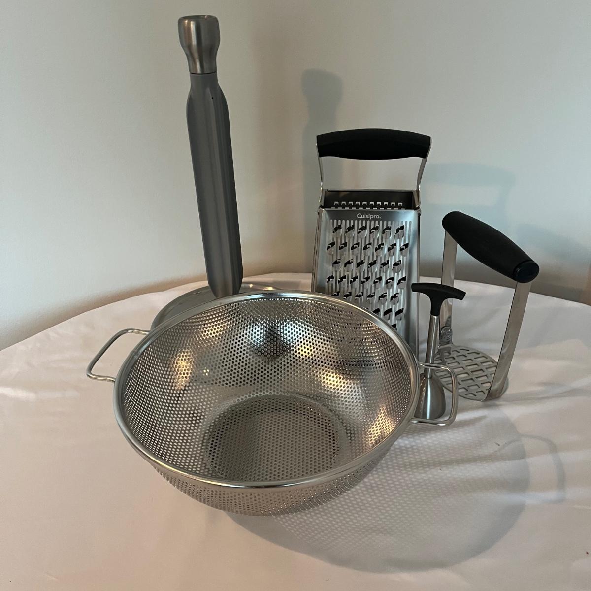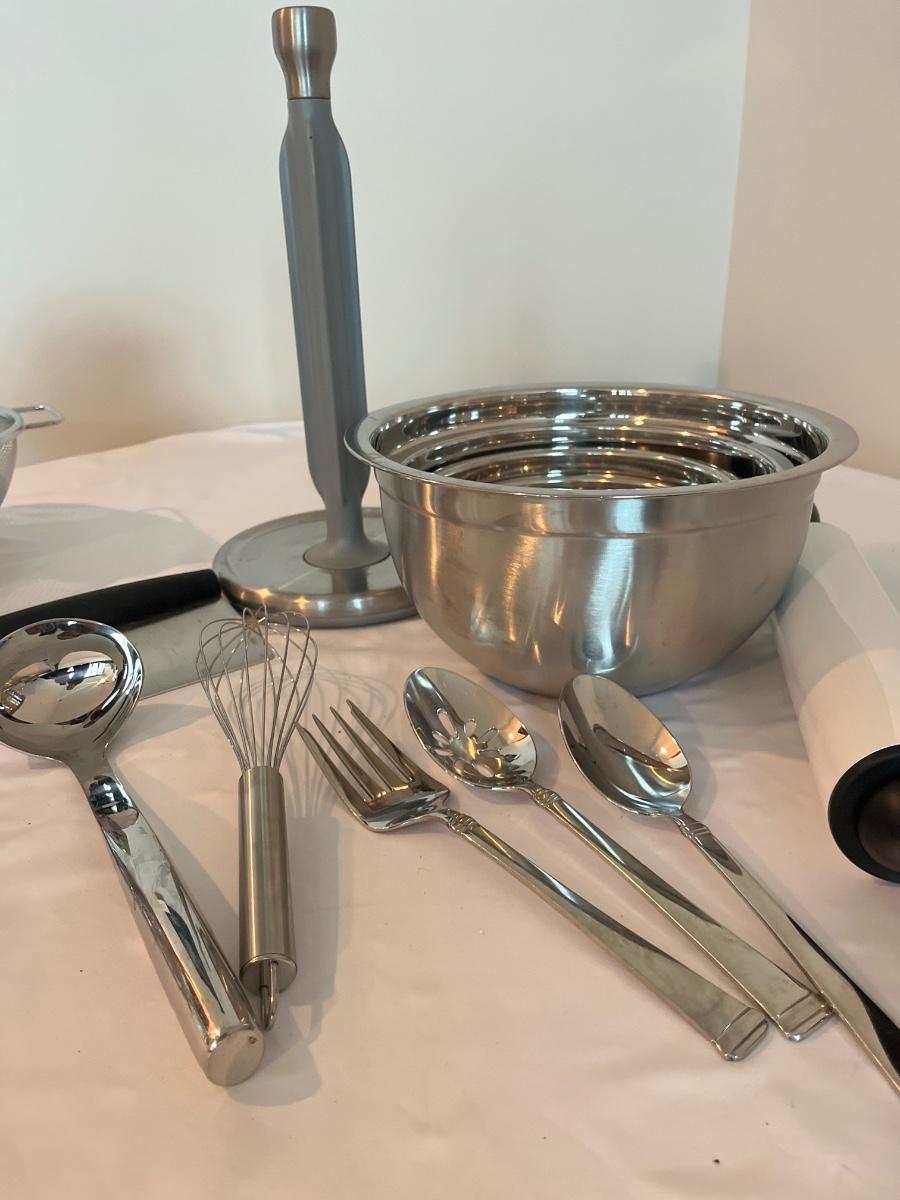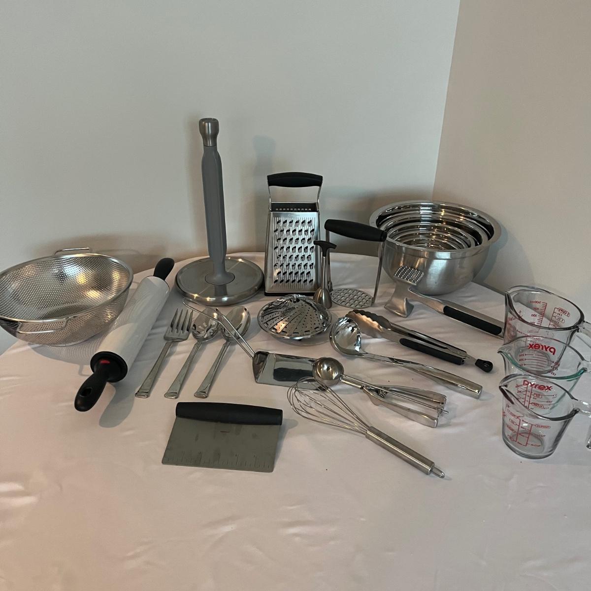 Lot includes five piece stainless steel nesting bowls, grater, colander, rolling pin, steamer, Pyrex and Anchor glass measuring cups, paper towel holder, meat tenderizer and more.