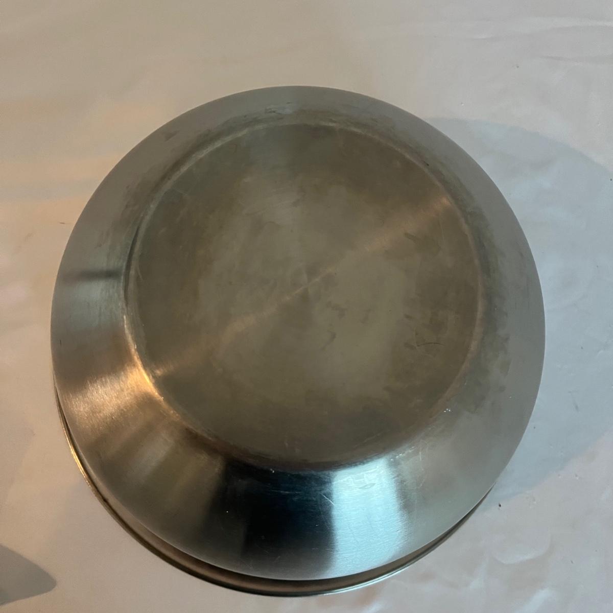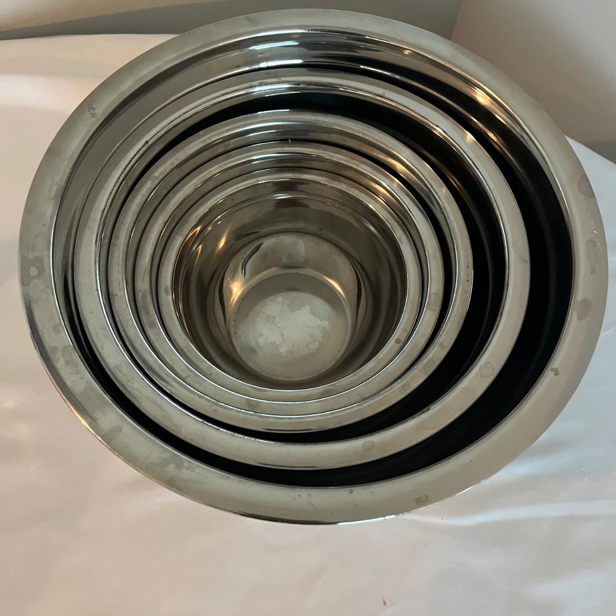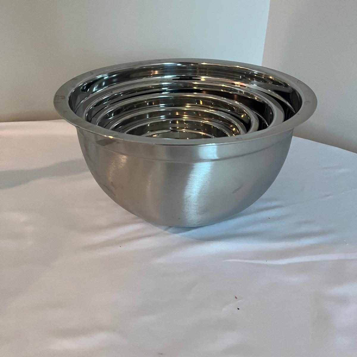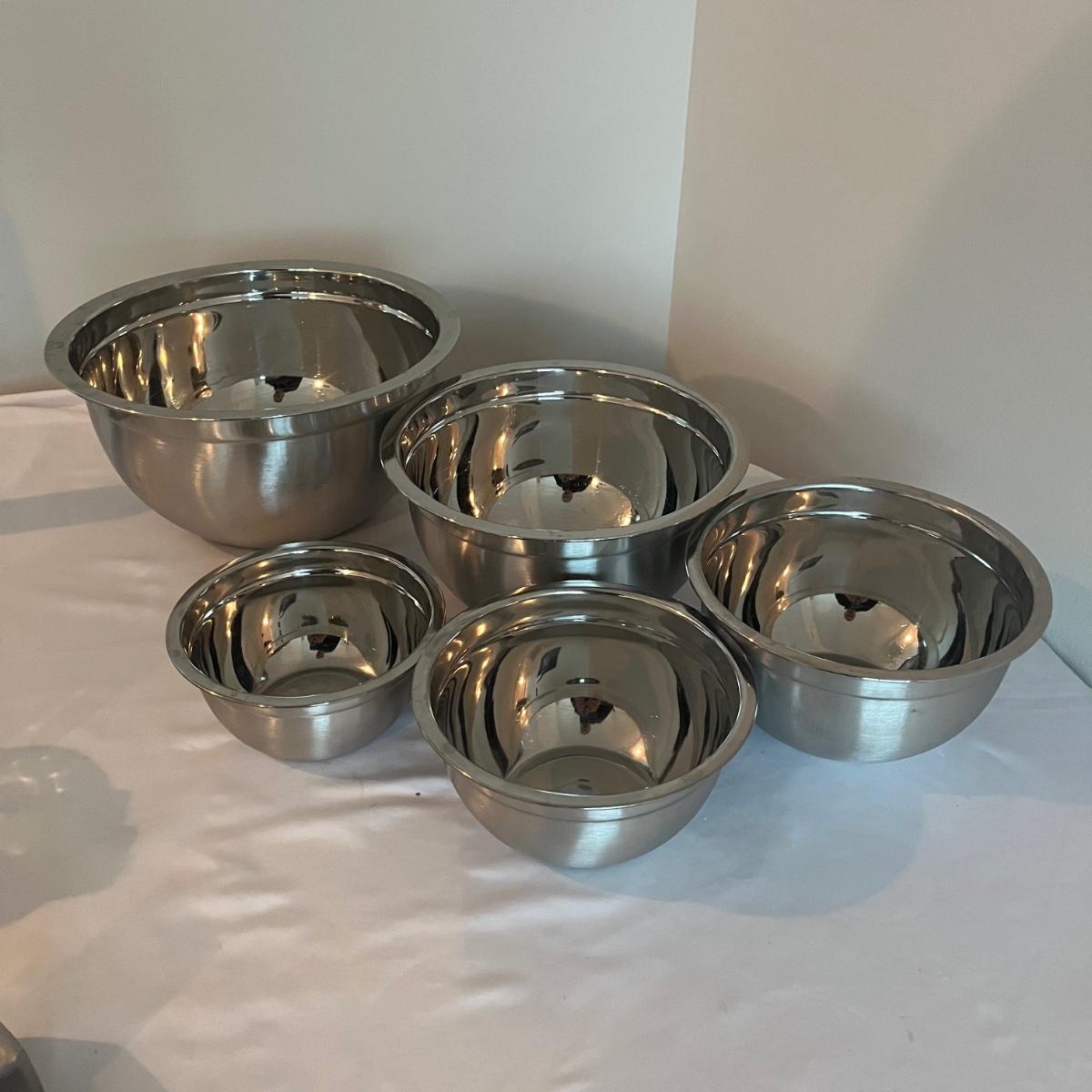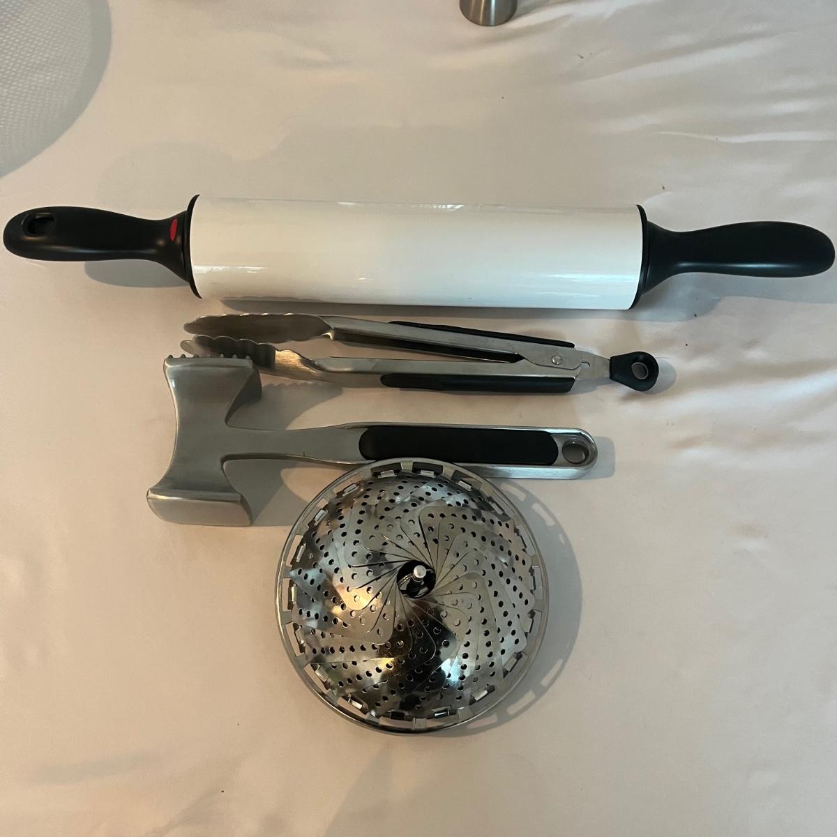 Lot includes five piece stainless steel nesting bowls, grater, colander, rolling pin, steamer, Pyrex and Anchor glass measuring cups, paper towel holder, meat tenderizer and more.