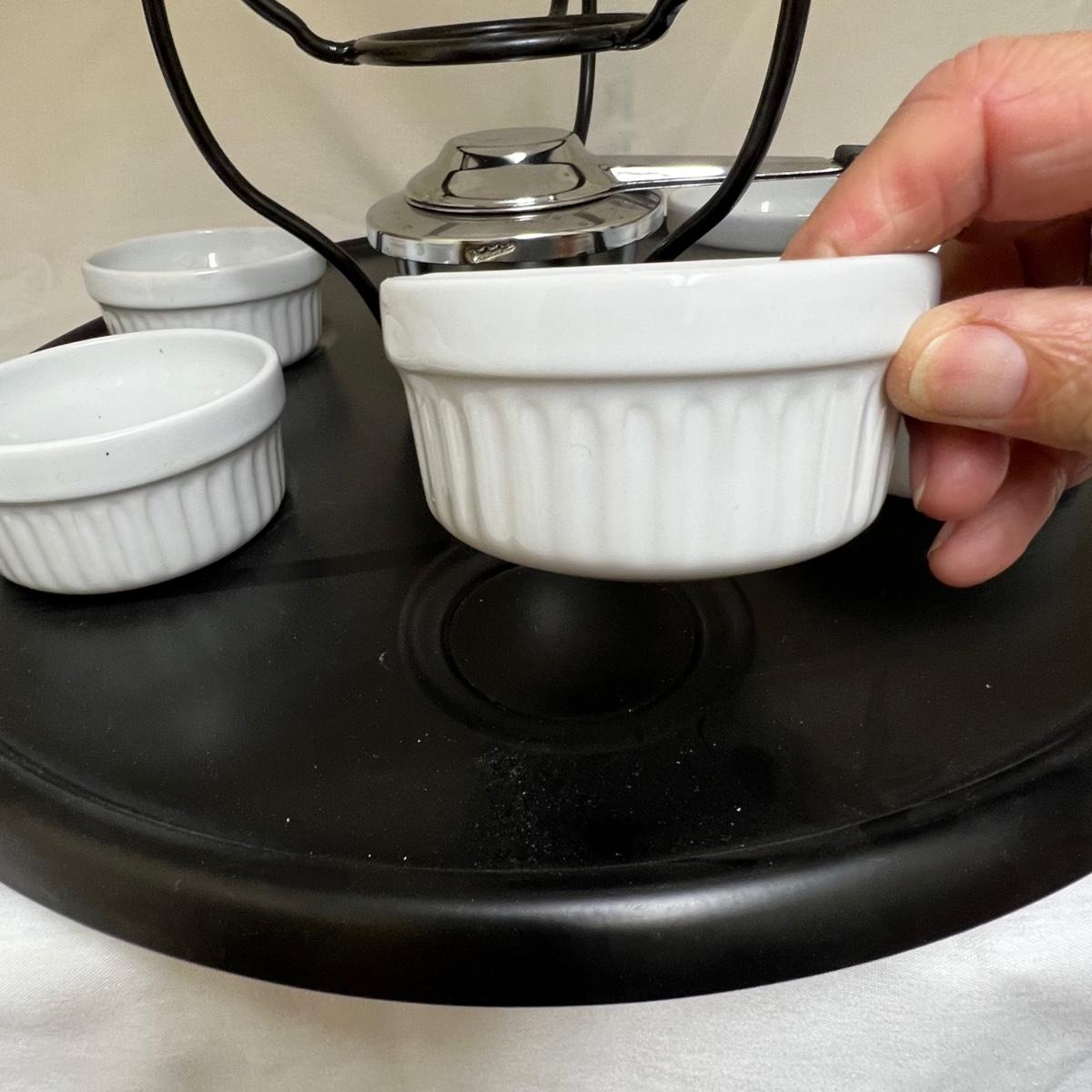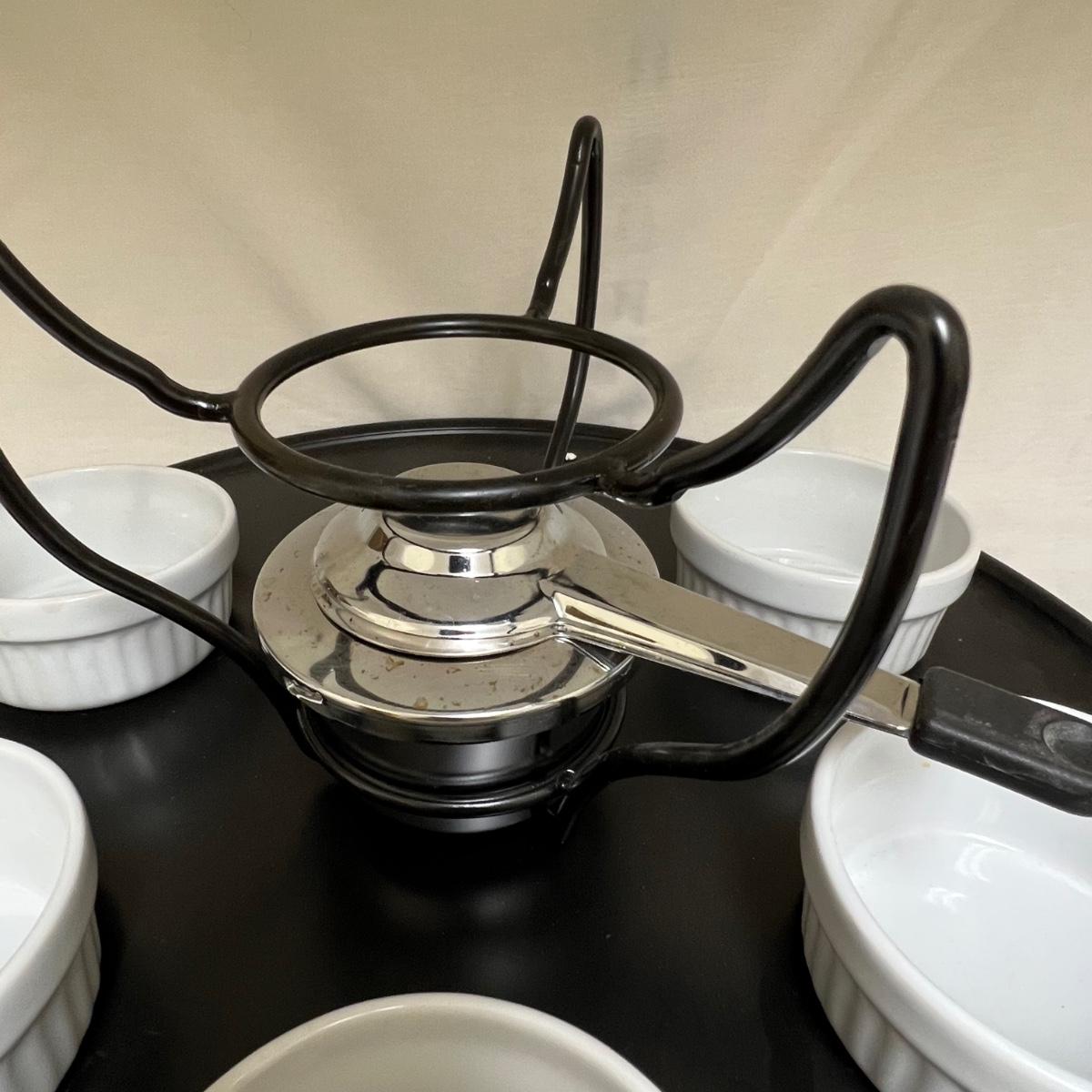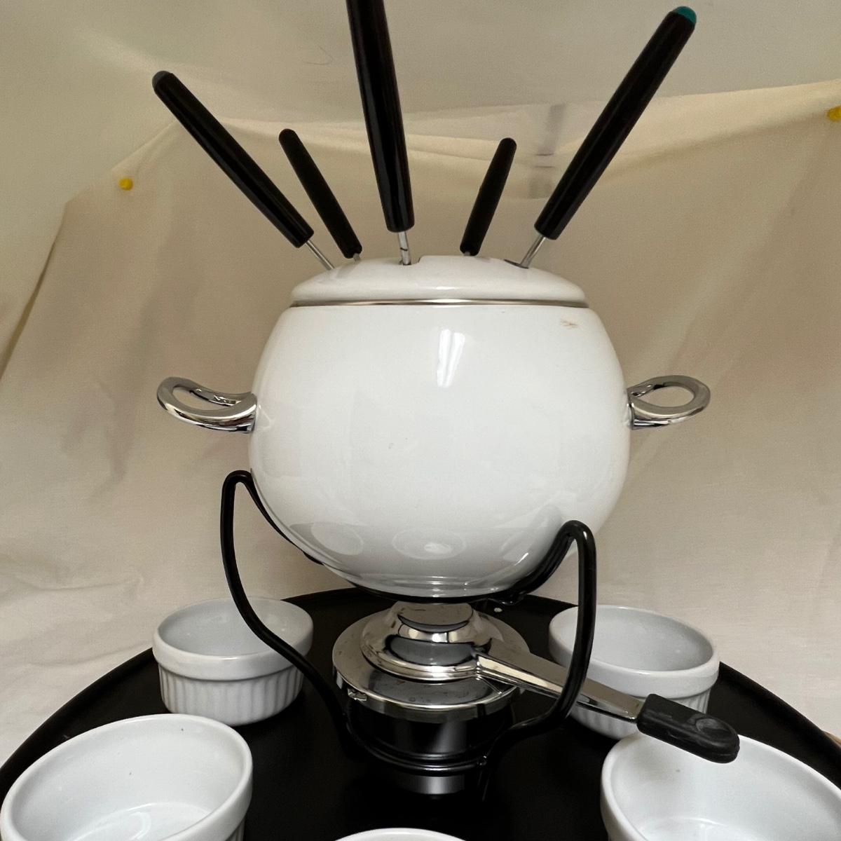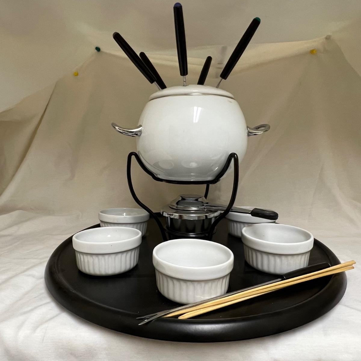 This white fondue has a black metal lazy Susan base with six forks plus a pair of chopsticks. There are five ceramic condiment terrines, note that set should have six but one is missing. There are a few candle wax drips present, see image.