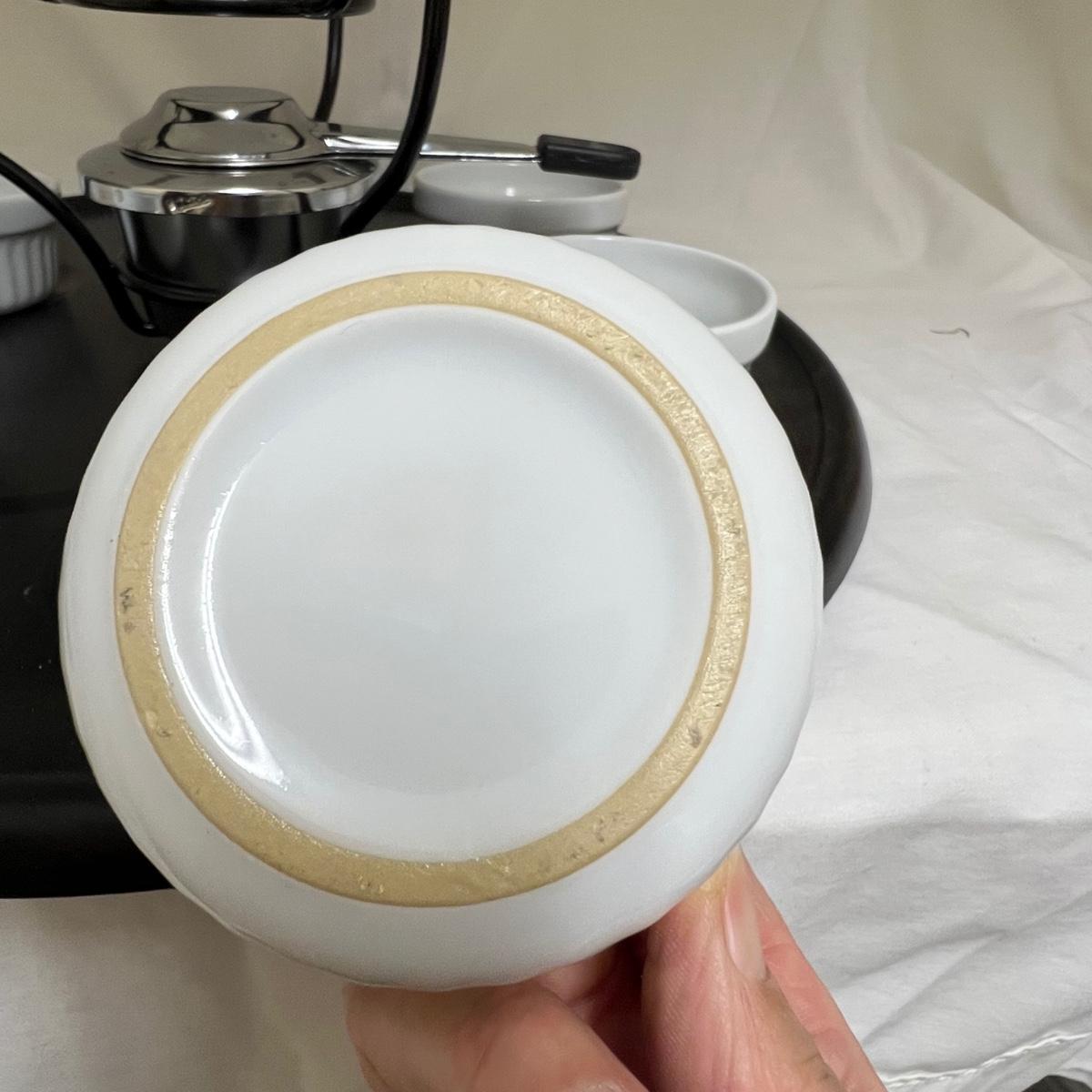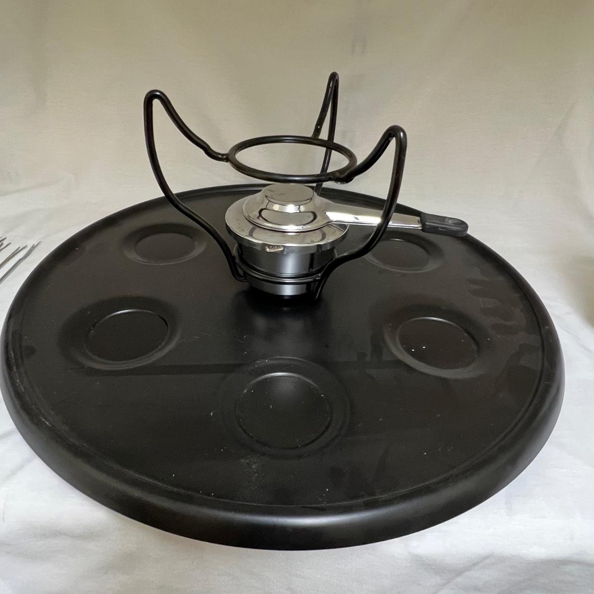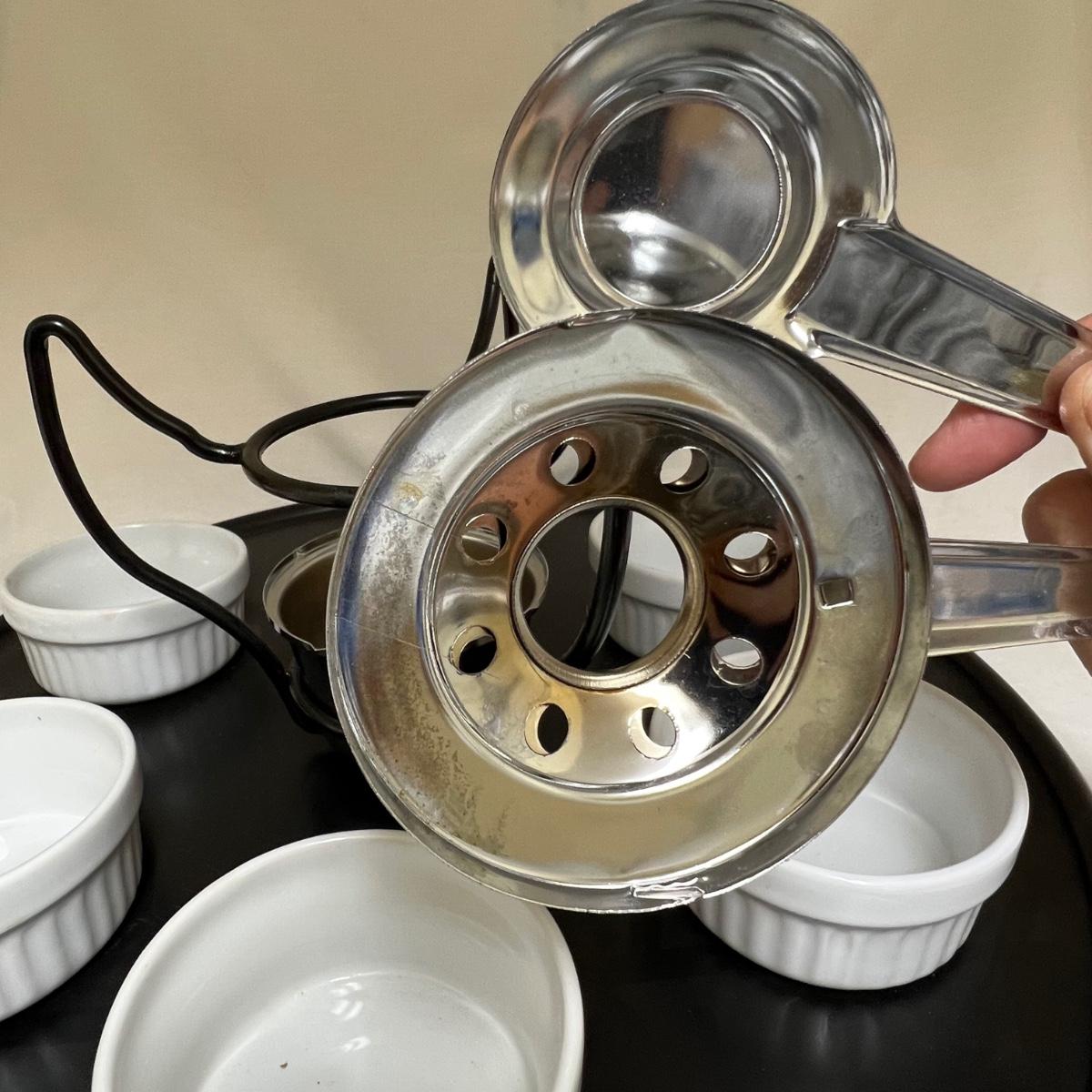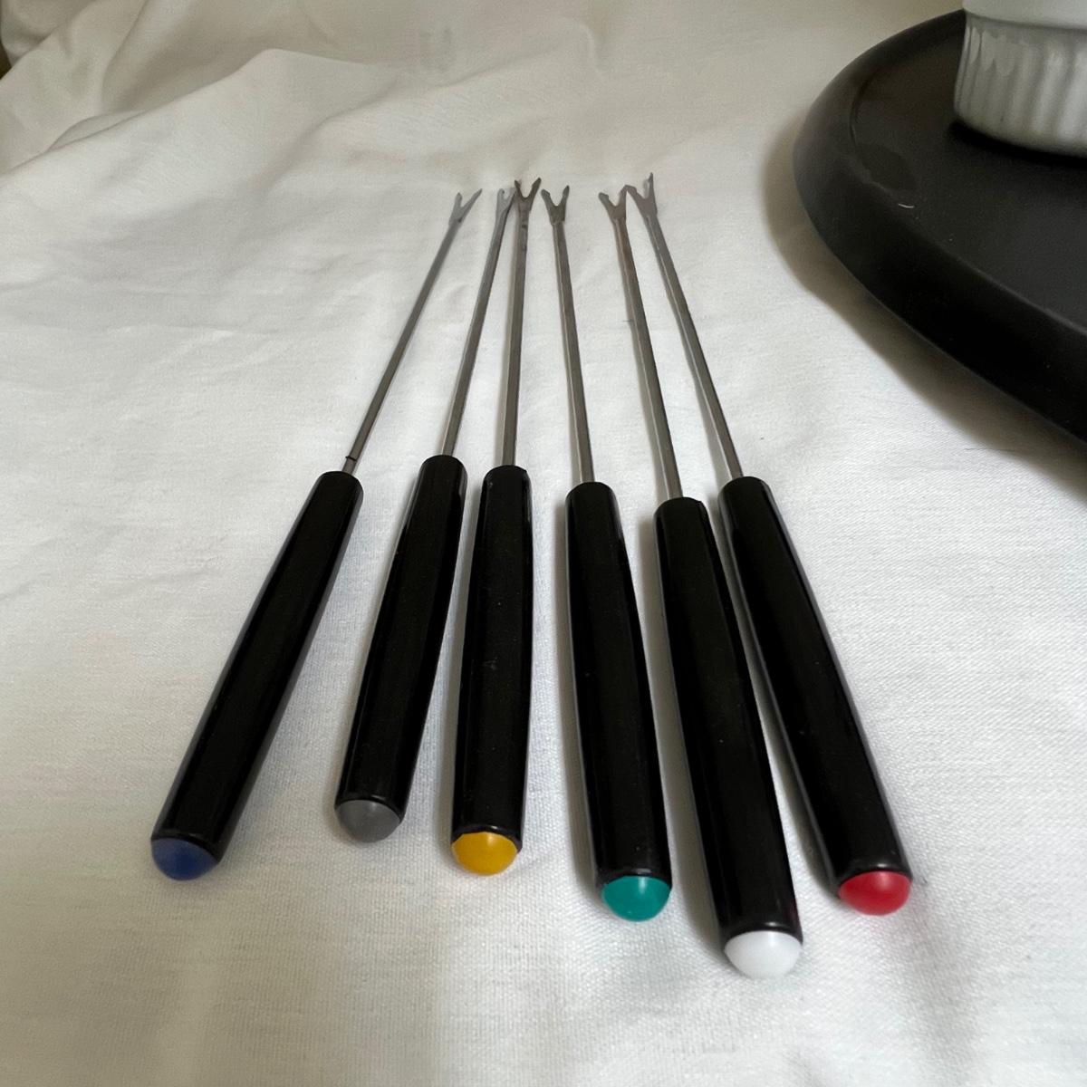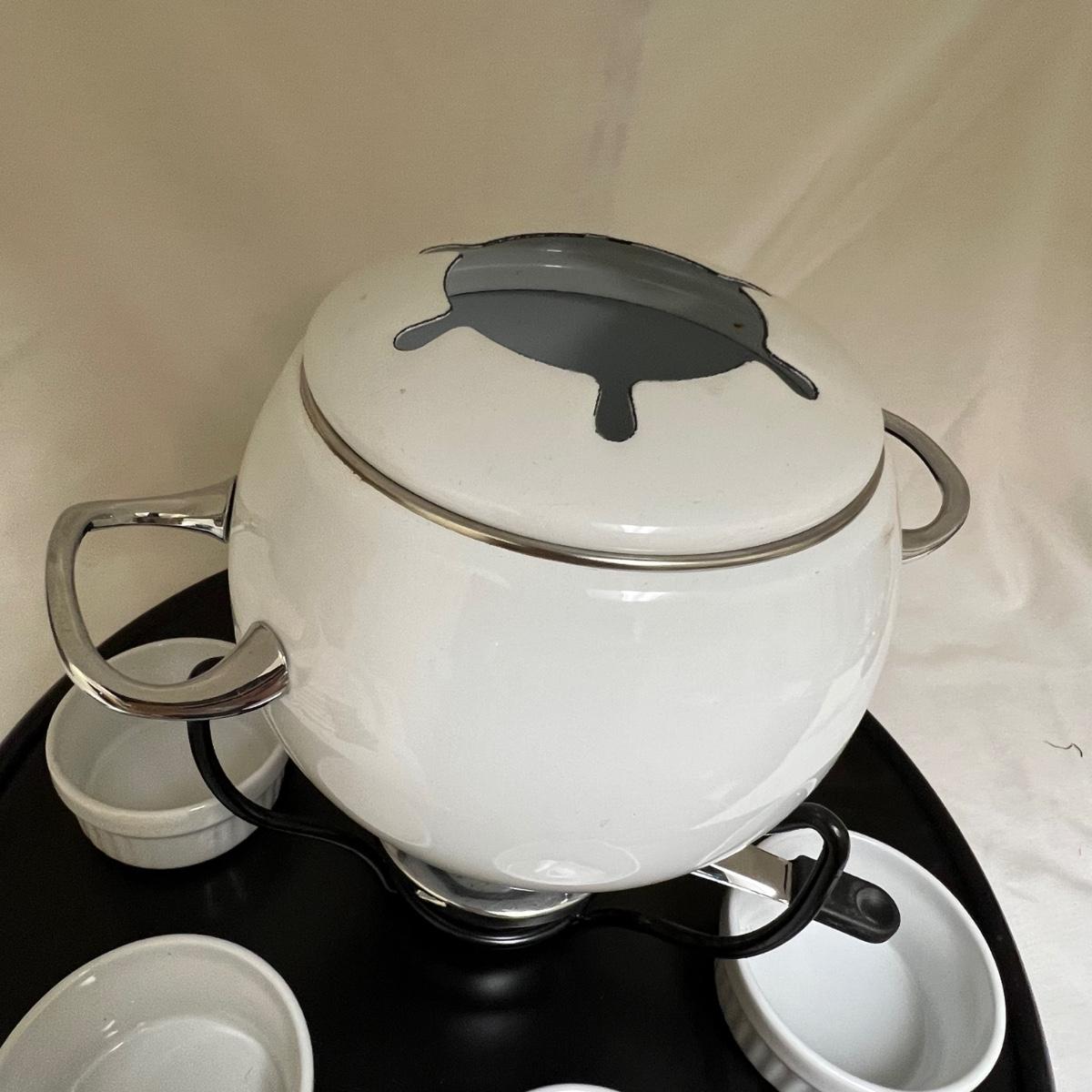 This white fondue has a black metal lazy Susan base with six forks plus a pair of chopsticks. There are five ceramic condiment terrines, note that set should have six but one is missing. There are a few candle wax drips present, see image.