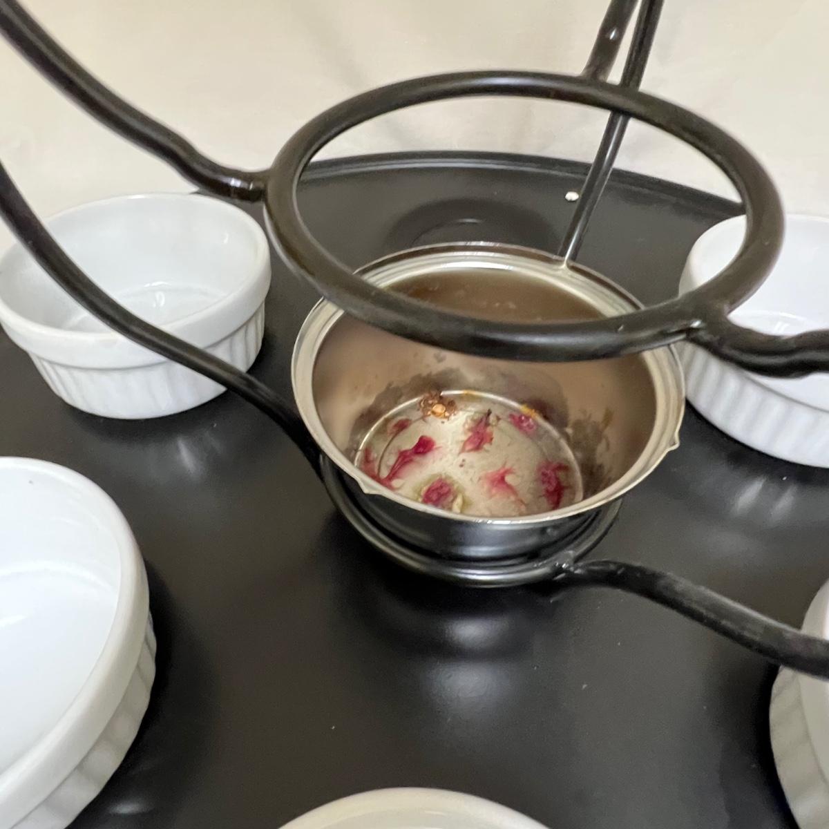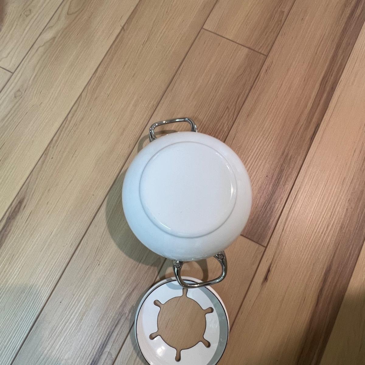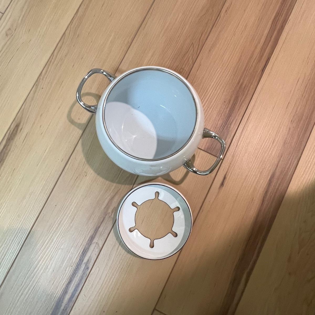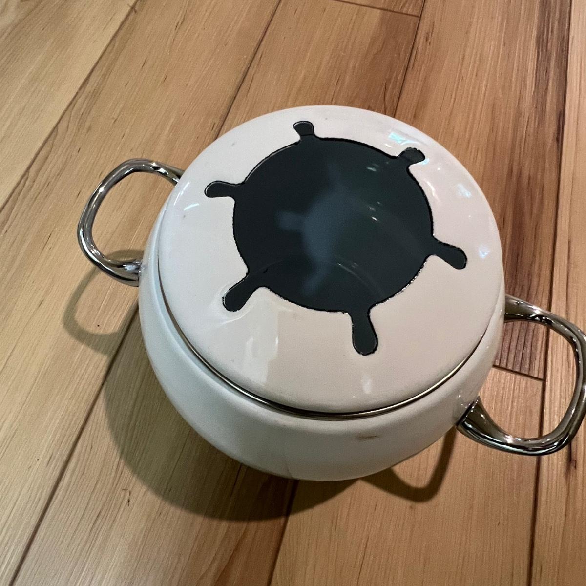 This white fondue has a black metal lazy Susan base with six forks plus a pair of chopsticks. There are five ceramic condiment terrines, note that set should have six but one is missing. There are a few candle wax drips present, see image.