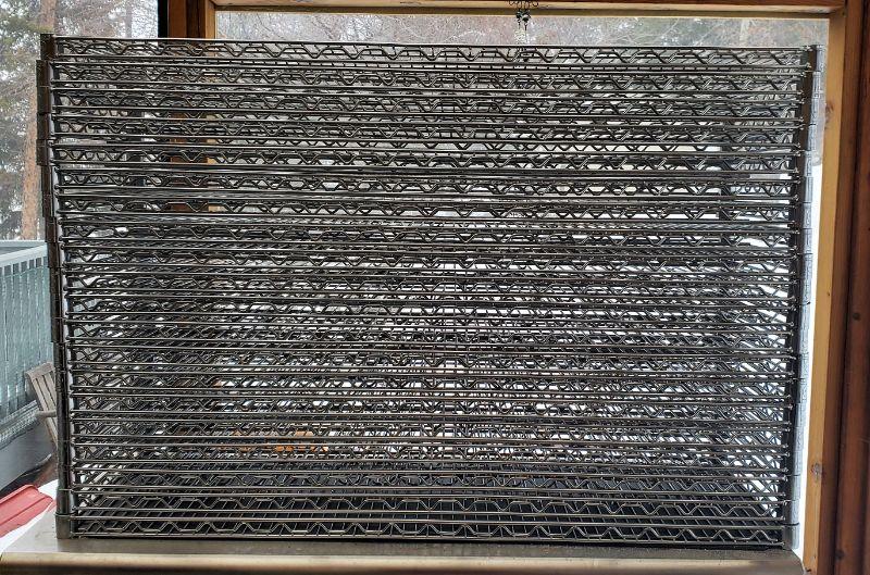 Set of NFS Certified Stainless Steel Shelves(21), Wheeled Legs(16), Single Countertop, and Black Plastic Connectors (Counter: 50"x44", Shelves: 45.5"x16")
