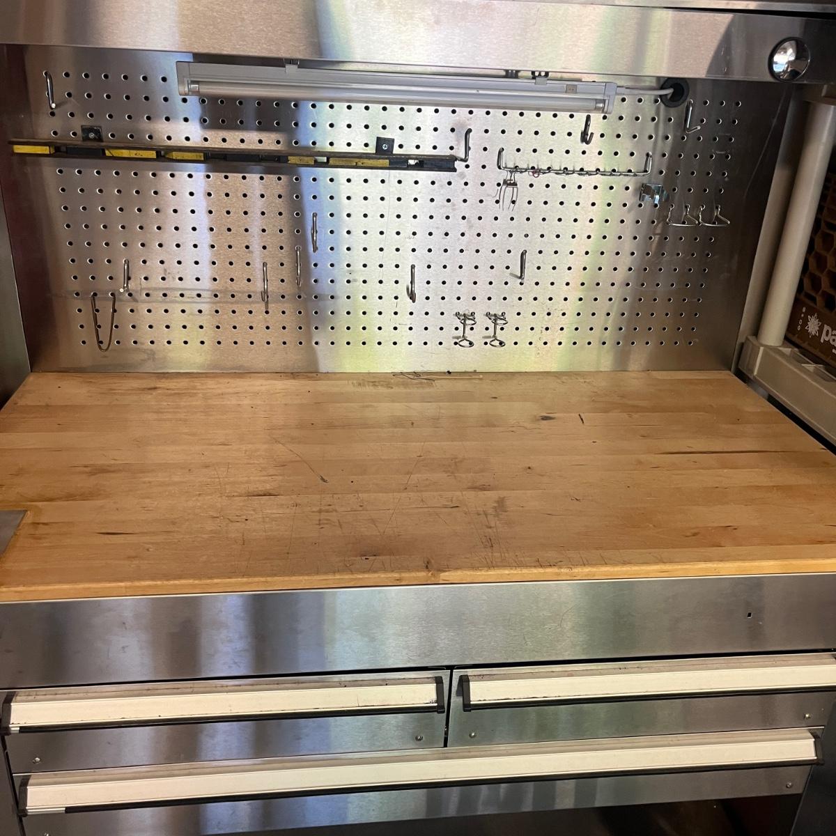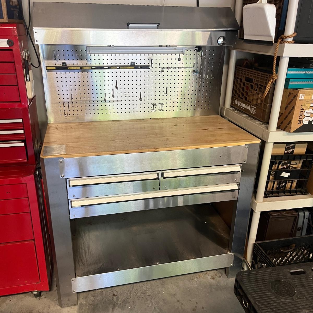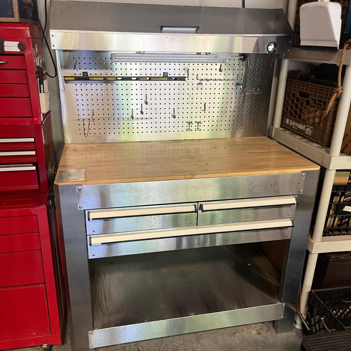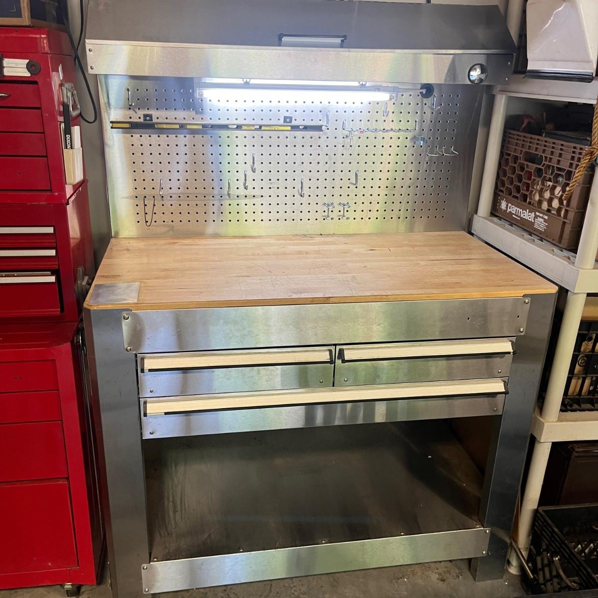 Lot includes a stainless steel workbench with light, storage bin up top, three drawers with shelf underneath and a stainless steel pegboard. Bench measures 45” x 24” x 62”H. Toolbox and shelf are not included.