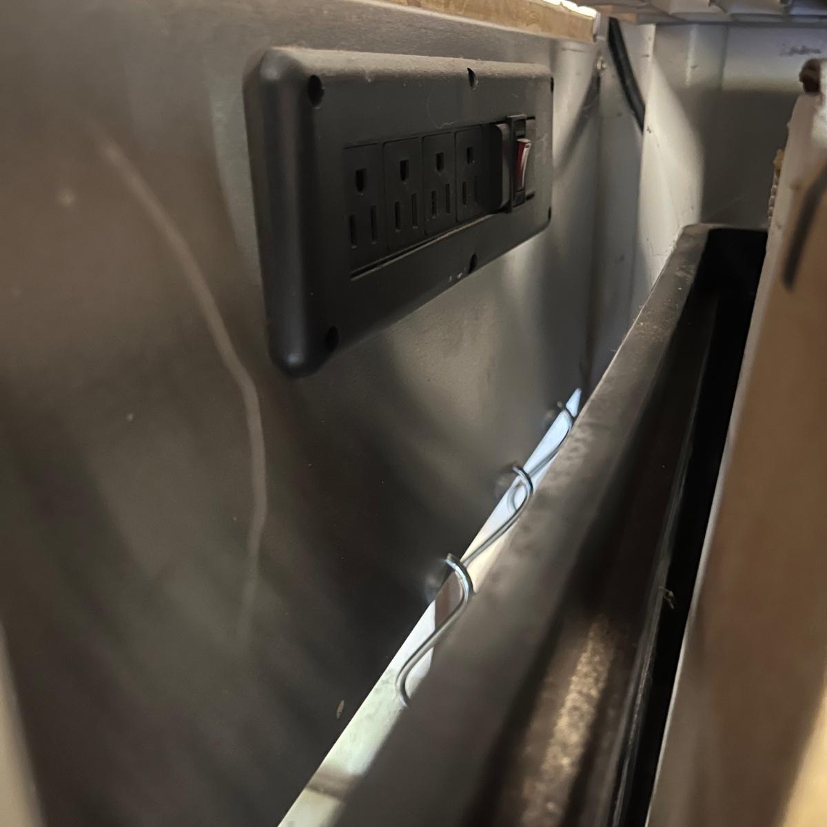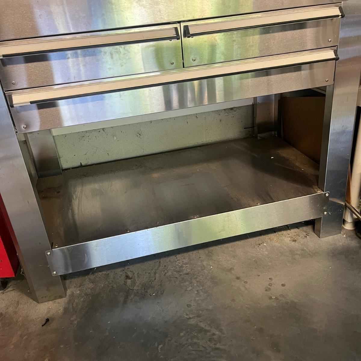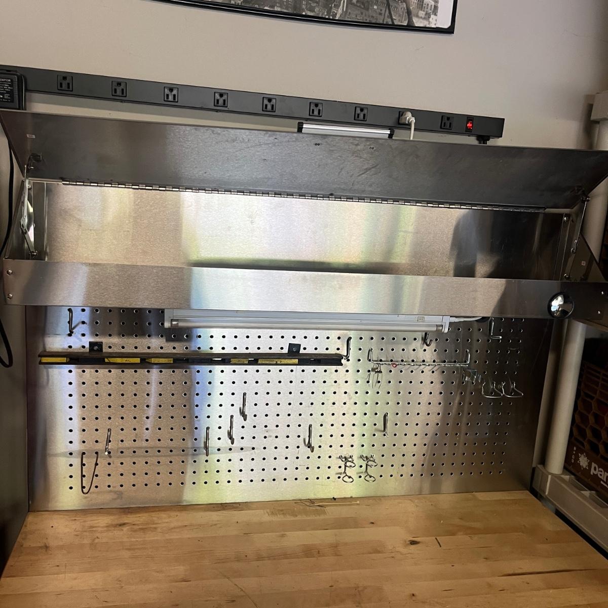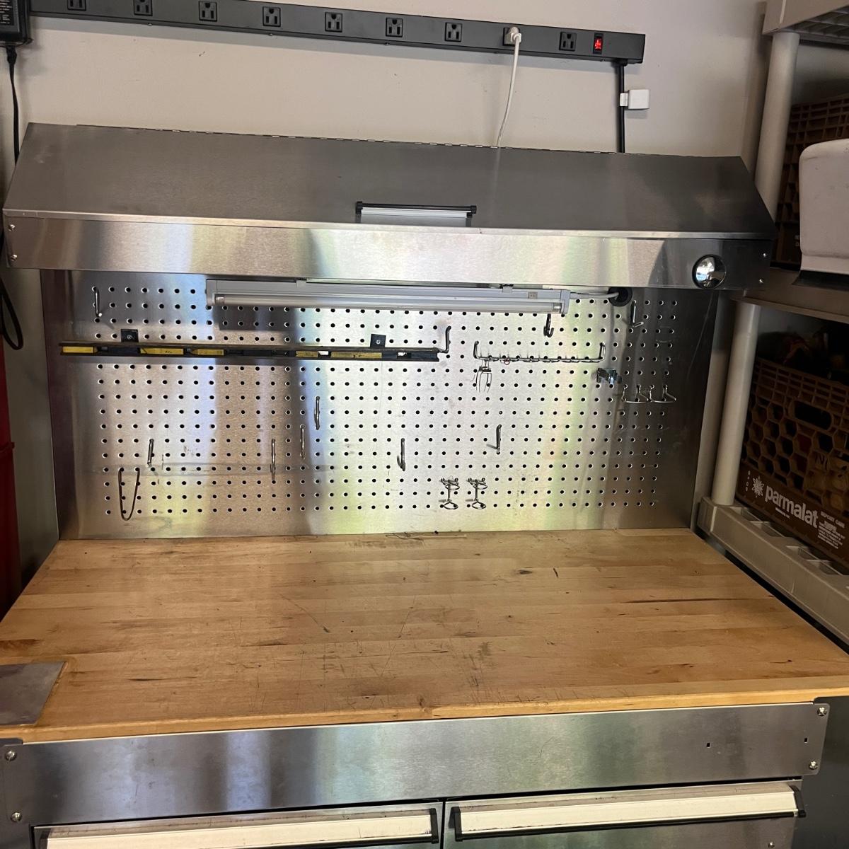 Lot includes a stainless steel workbench with light, storage bin up top, three drawers with shelf underneath and a stainless steel pegboard. Bench measures 45” x 24” x 62”H. Toolbox and shelf are not included.