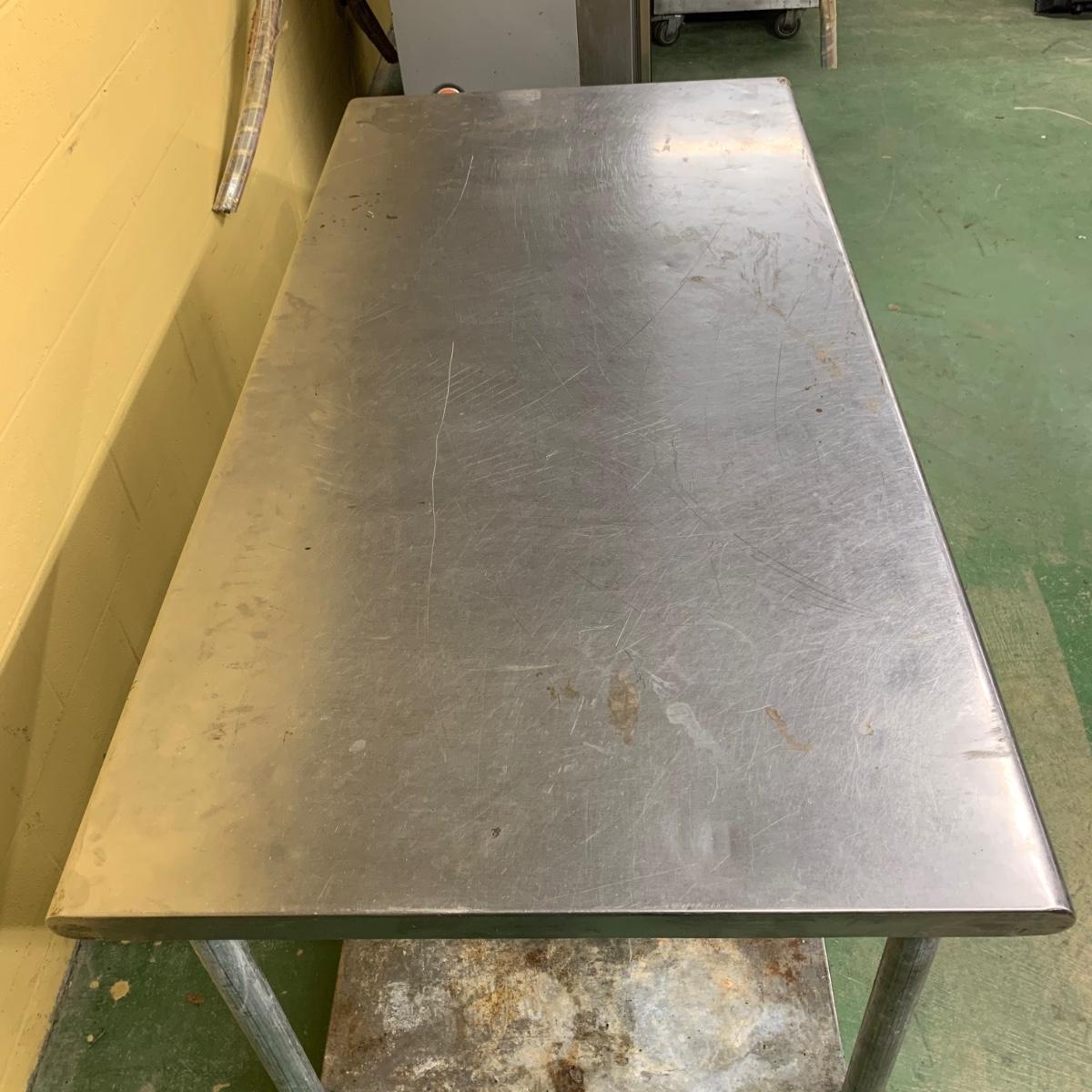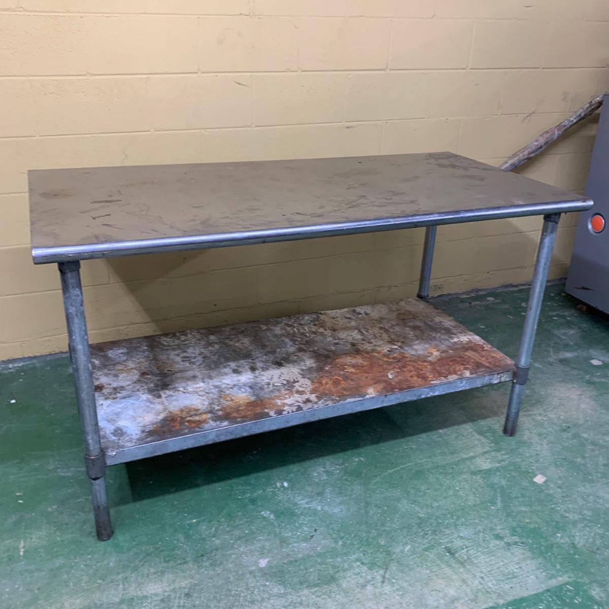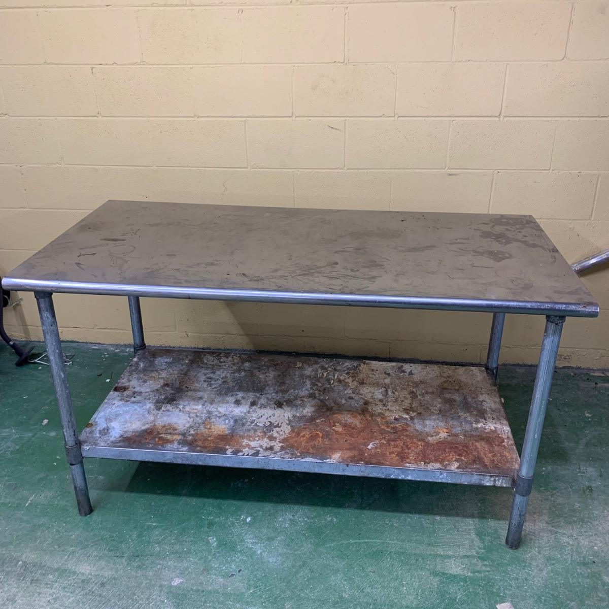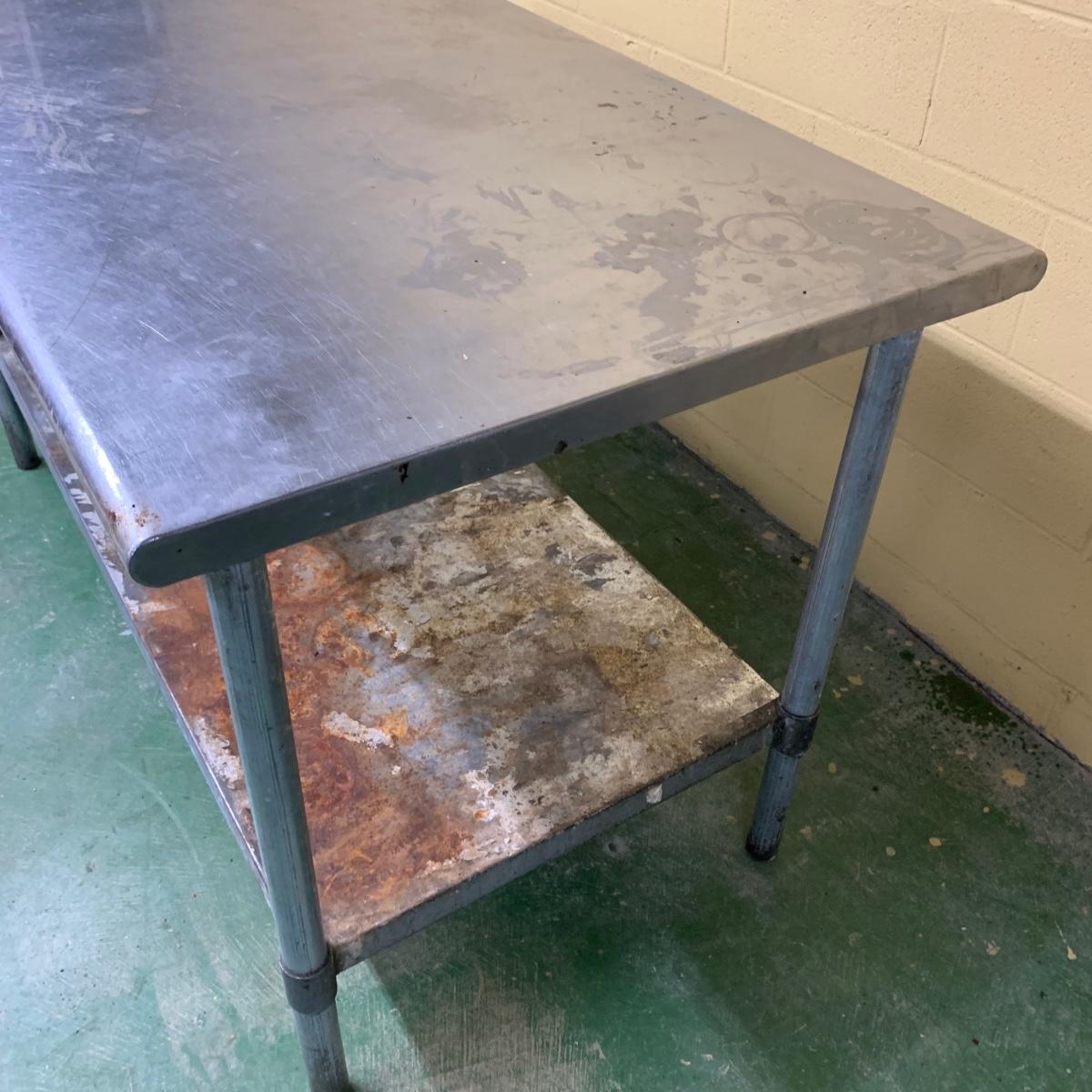 This stainless steel works top table measures 60” x 30” x 34.5”. According to the previous owner, the table has a 304 stainless top and a 430 stainless bottom. The top surface has some scratches and stains, most of which appear to be cleanable. The surface of the bottom shelf has quite a bit of peeling and rust. Structurally, the table is in very good solid condition. Local pickup only. There is easy access to load this item into your vehicle through a door in the room it is located in to the parking lot. It will not have to be moved up or down any stairs. The winning bidder will need to bring help to load this item.