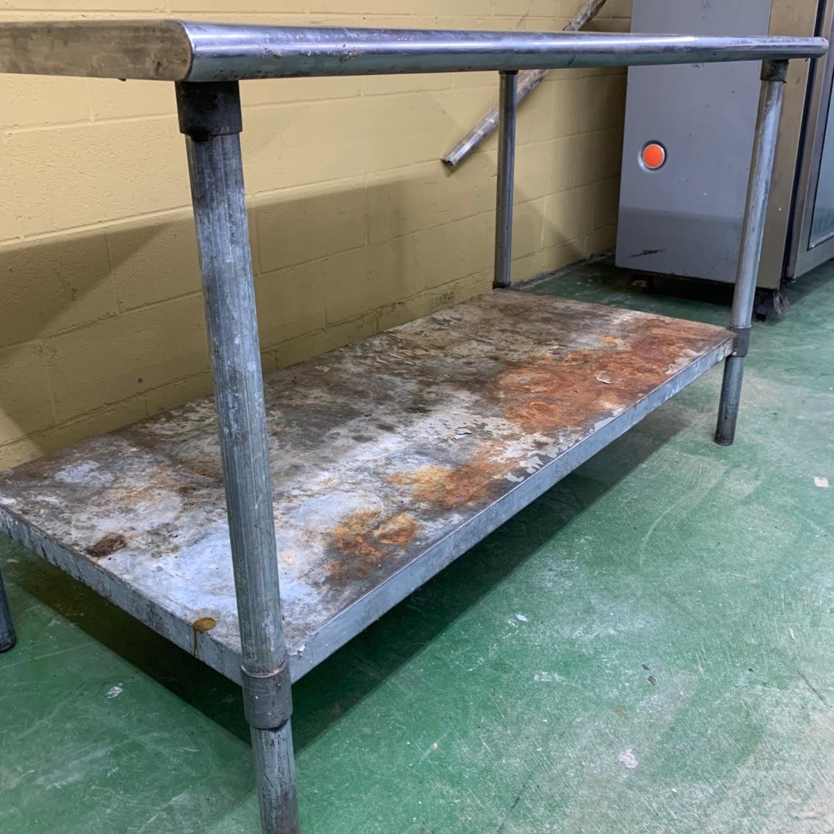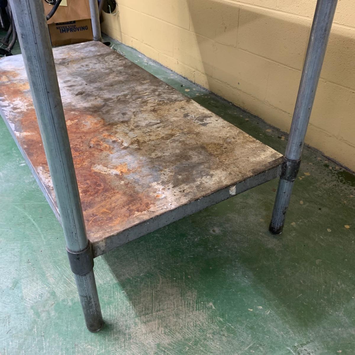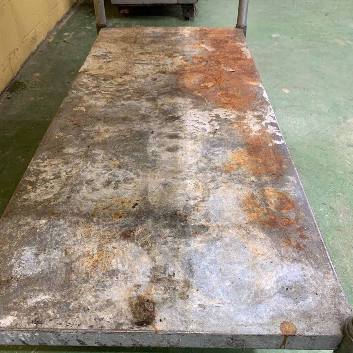 This stainless steel works top table measures 60” x 30” x 34.5”. According to the previous owner, the table has a 304 stainless top and a 430 stainless bottom. The top surface has some scratches and stains, most of which appear to be cleanable. The surface of the bottom shelf has quite a bit of peeling and rust. Structurally, the table is in very good solid condition. Local pickup only. There is easy access to load this item into your vehicle through a door in the room it is located in to the parking lot. It will not have to be moved up or down any stairs. The winning bidder will need to bring help to load this item.