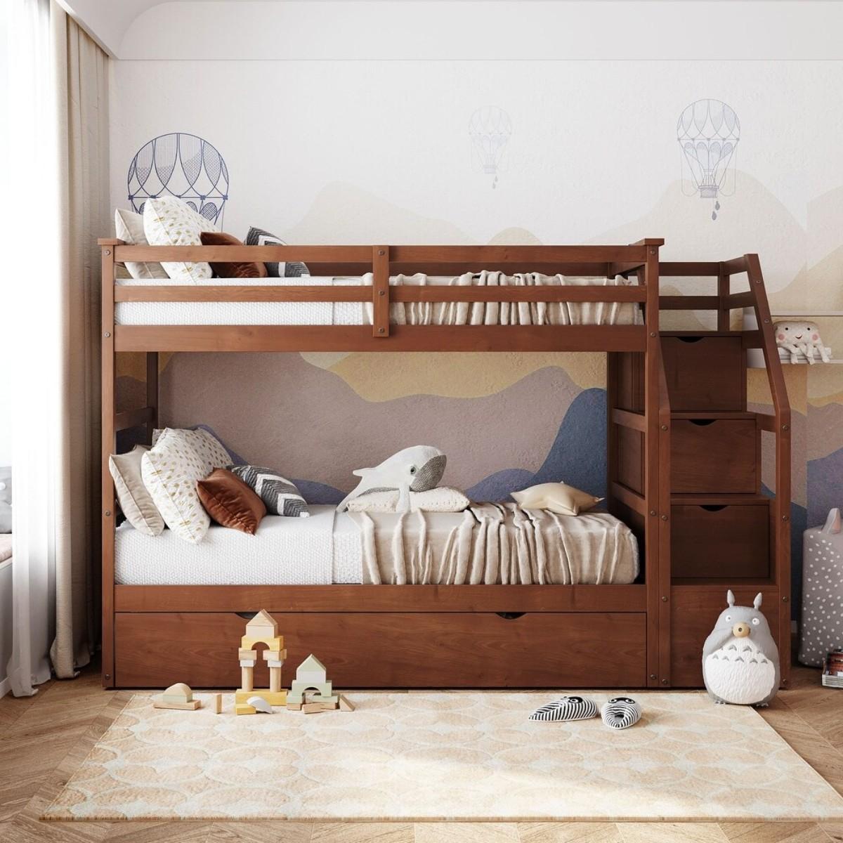 STAIRWAY BUNK BED OF TWO TWIN BEDS AND A TRUNDLE. CUBBIE STEPS. DOUBLE GUARD RAIL AND STEPS BUILT IN