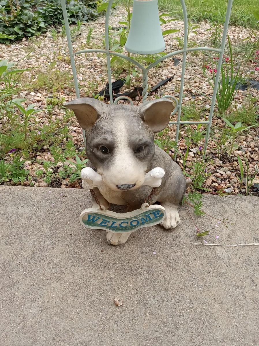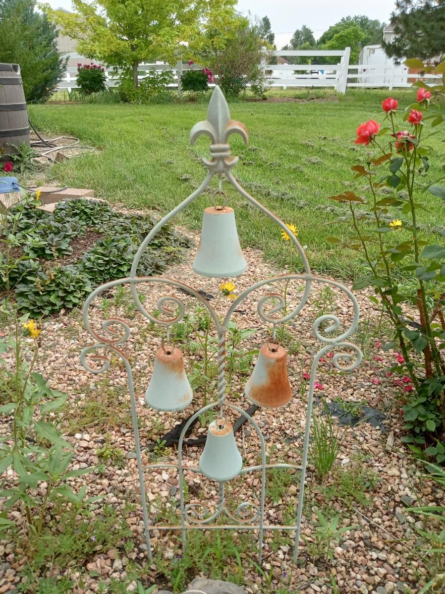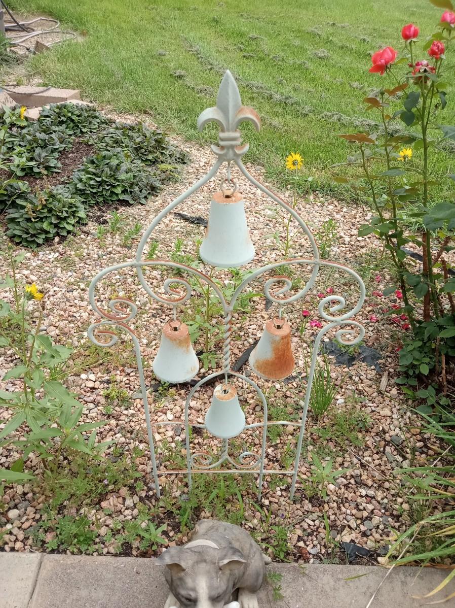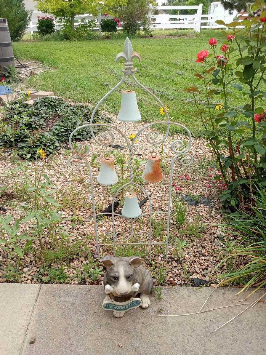 STAKED CAST IRON HANGING BELLS AND A WELCOME PUP