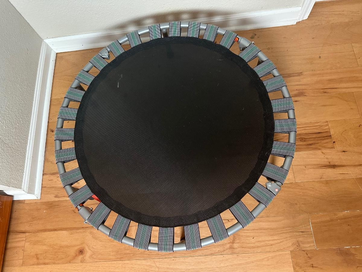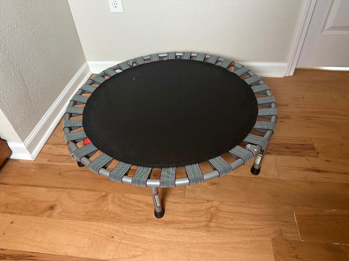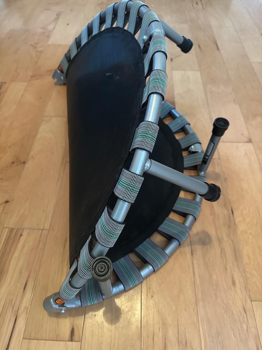 The legs are removable, and the trampoline folds flat for easy storage under a couch, bed, or in a closet.