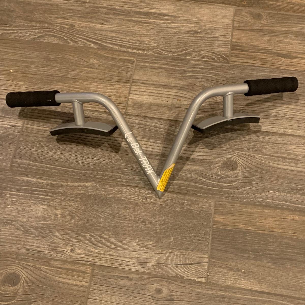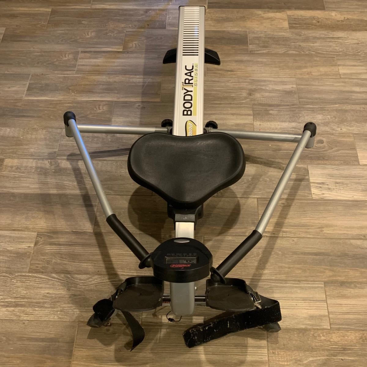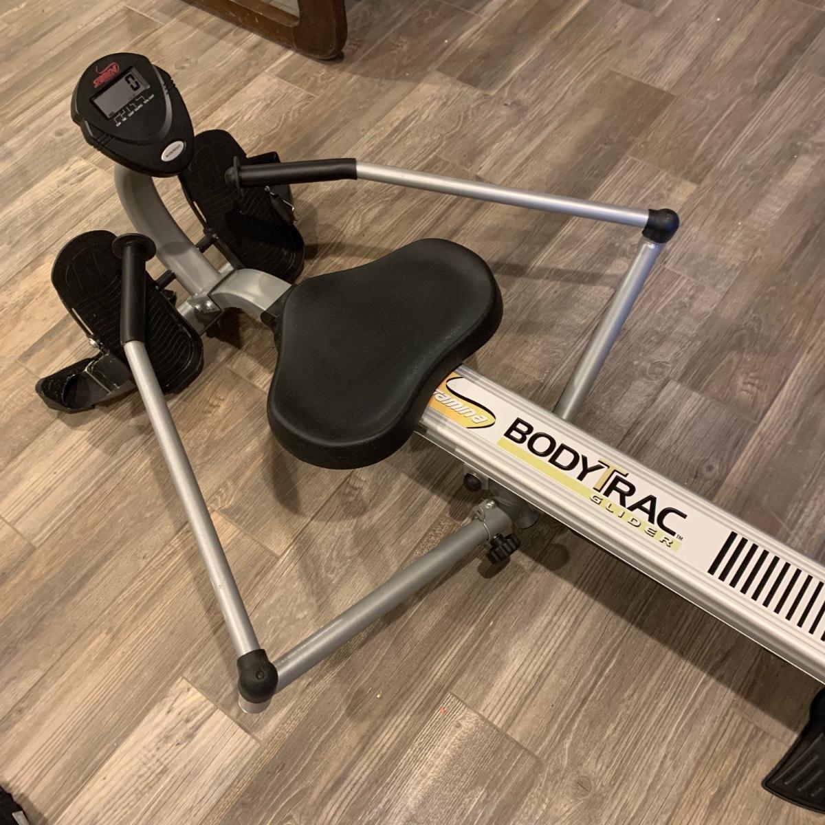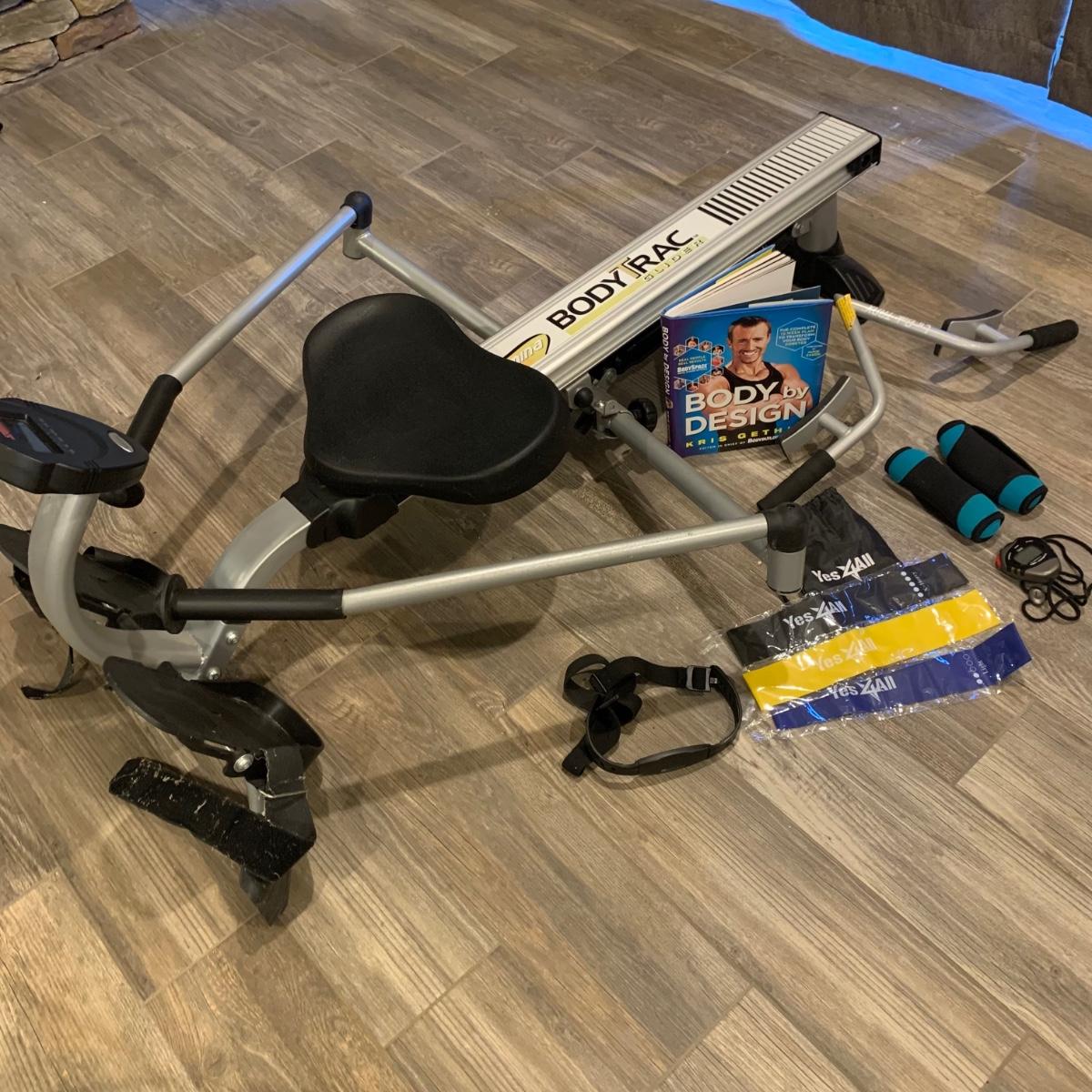 This collection of fitness related items includes: a Stamina BodyTrac Glider, a Lo Bak Trax spinal traction device, a set of fabric weights, a heart rate monitor, a stopwatch, unopened resistance bands, and hardcover book “Body by Design” by Kris Gethin. Glider is Model 35-1050D. It appears to function well. The heart rate monitor and stop watch appear to need new batteries, but everything else seems to be in good condition.