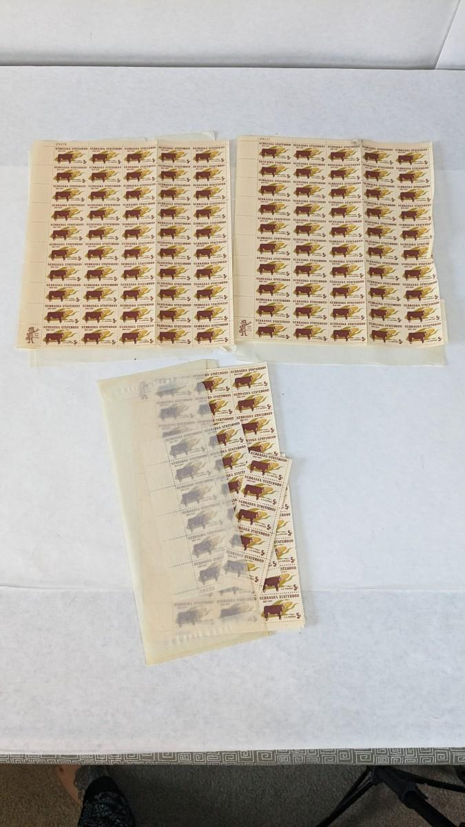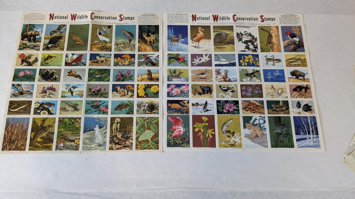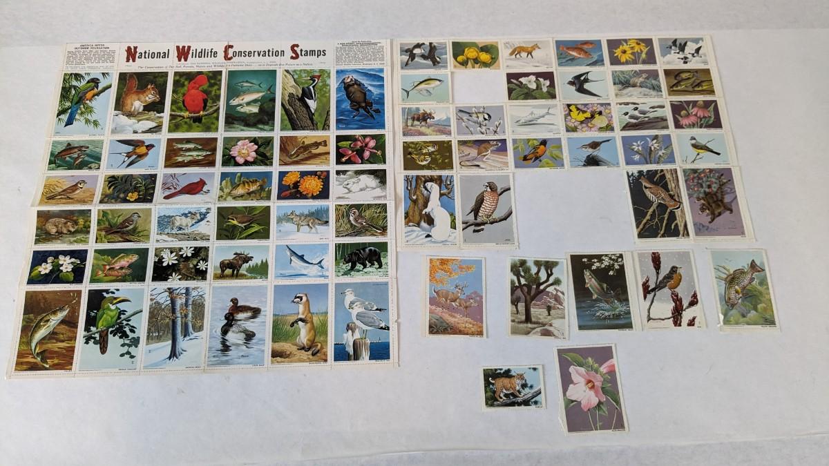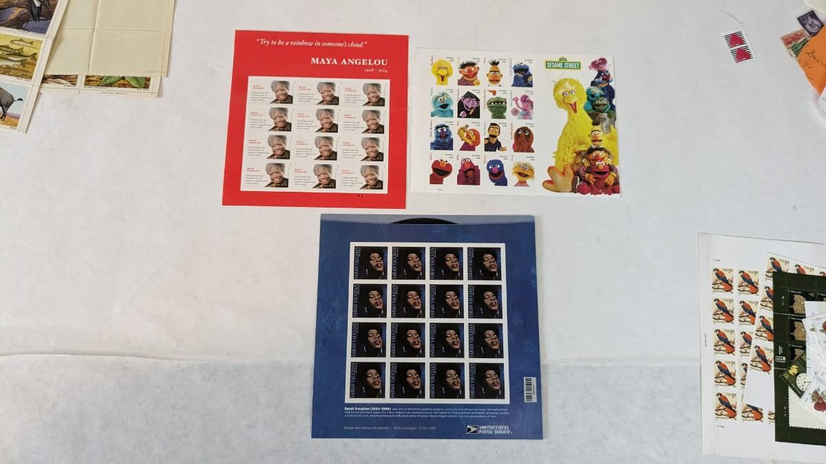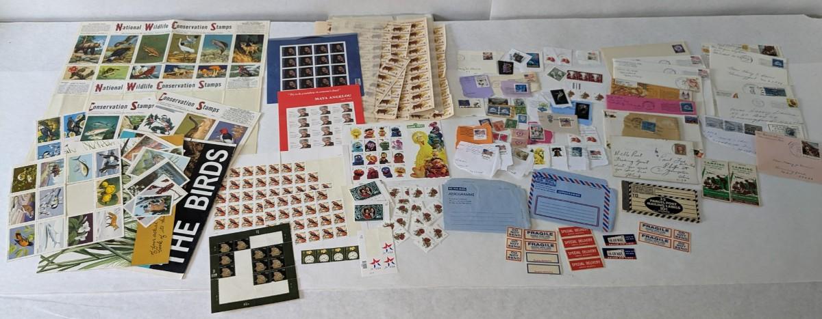 a super array of used, unused, and collectible stamps. Includes full sheets of Maya Angelou, Sarah Vaughn, Sesame Street, and Nebraska Statehood. Partials of postcard stamps. Various used corners and a great little collection of Conservation stamps with 2 posters. Note wear in photos to these pieces, overwhelmingly intact and perfect for framing.