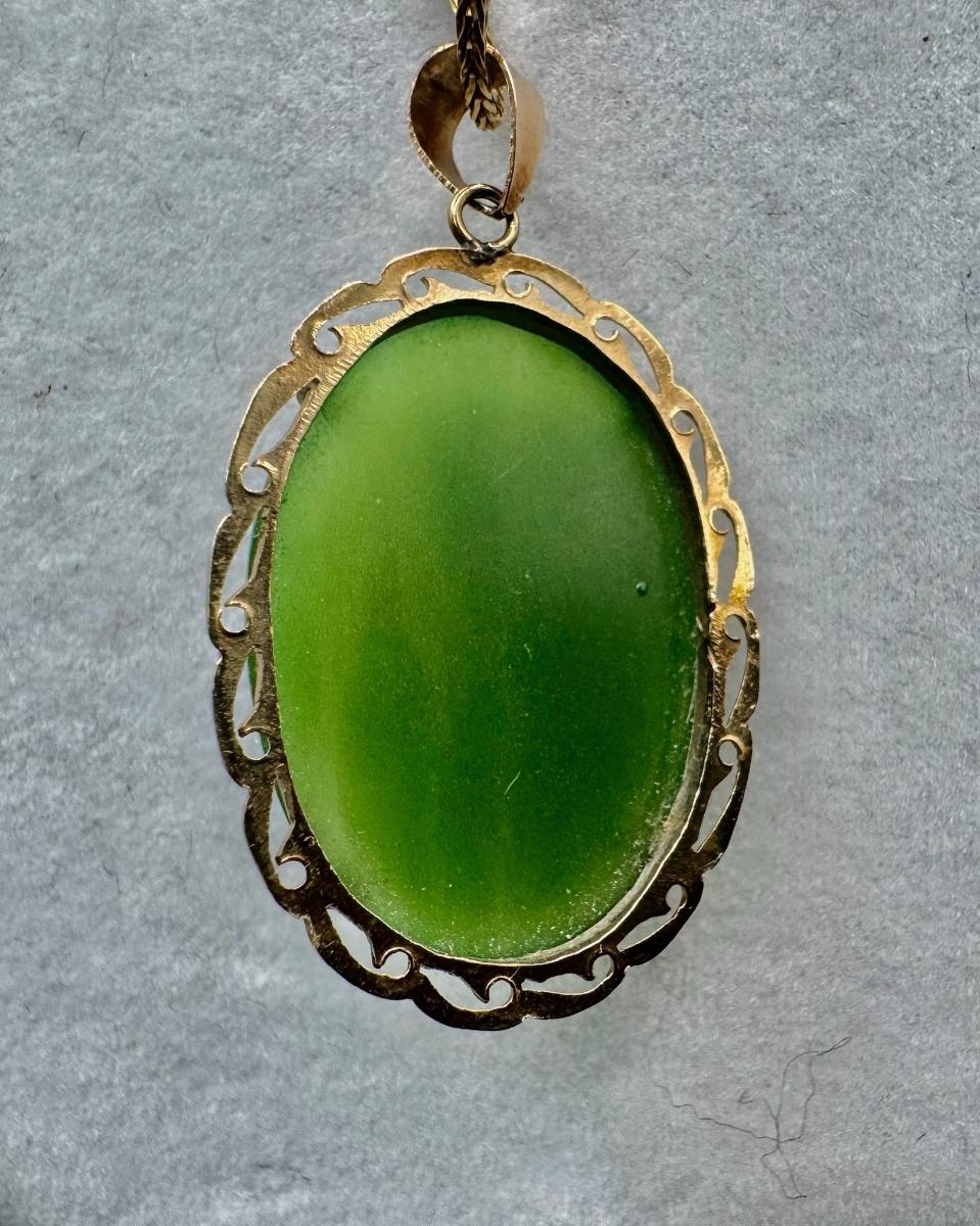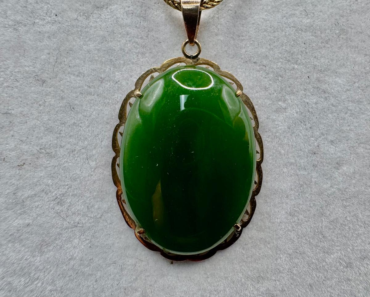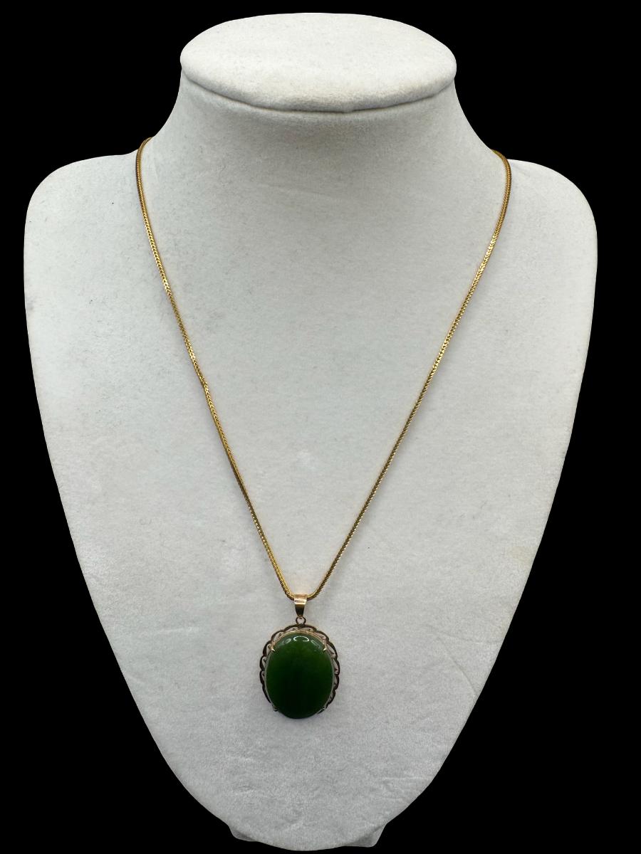 **WIRE TRANSFER IS REQUIRED IF SHIPPED.** [9.00g] This beautiful jade cabochon pendant hangs from a foxtail chain. The chain is stamped “Balestra, 750.” The pendant is stamped “18K.” The chain has two minor kinks. Measurement of chain: 20”L. Measurement of pendant: 1.25”L. **ALL PRECIOUS METALS SALES ARE FINAL. NO REFUNDS WILL BE GIVEN FOR ANY REASON.** [LD]