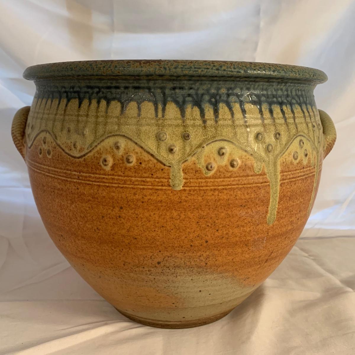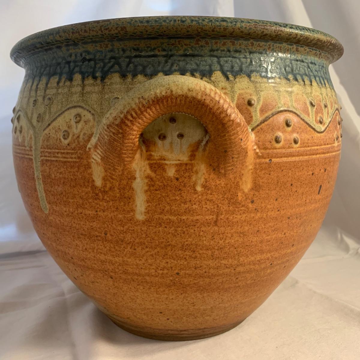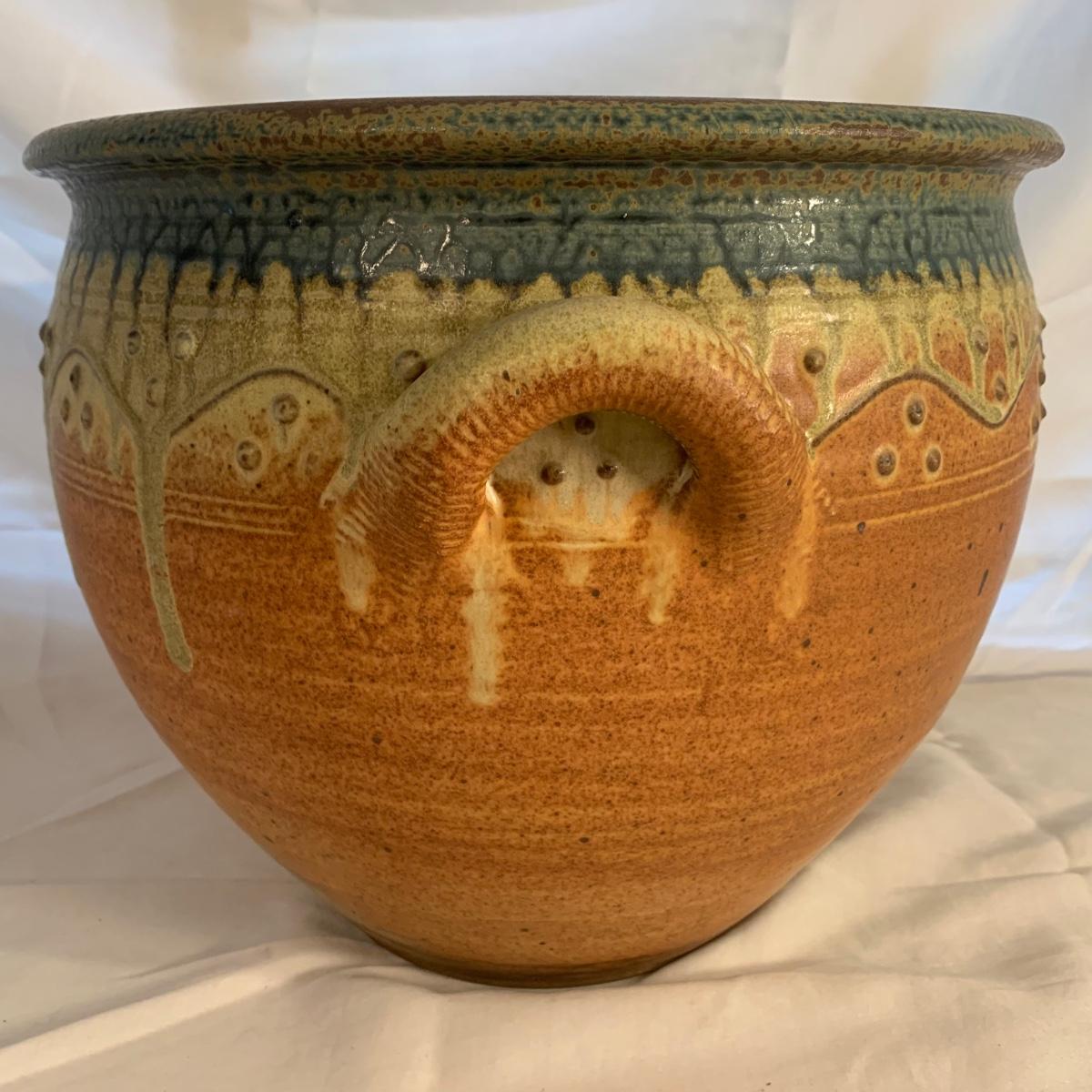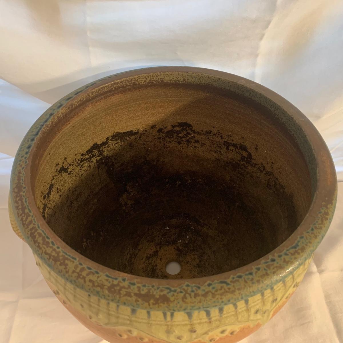 Stamped blue and clay colored pottery planter. Large blue planter measures about 13.5”D x 11.5”H. Planter appears to be in good condition.