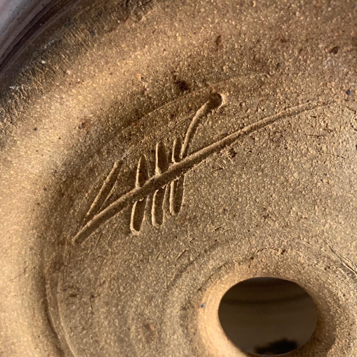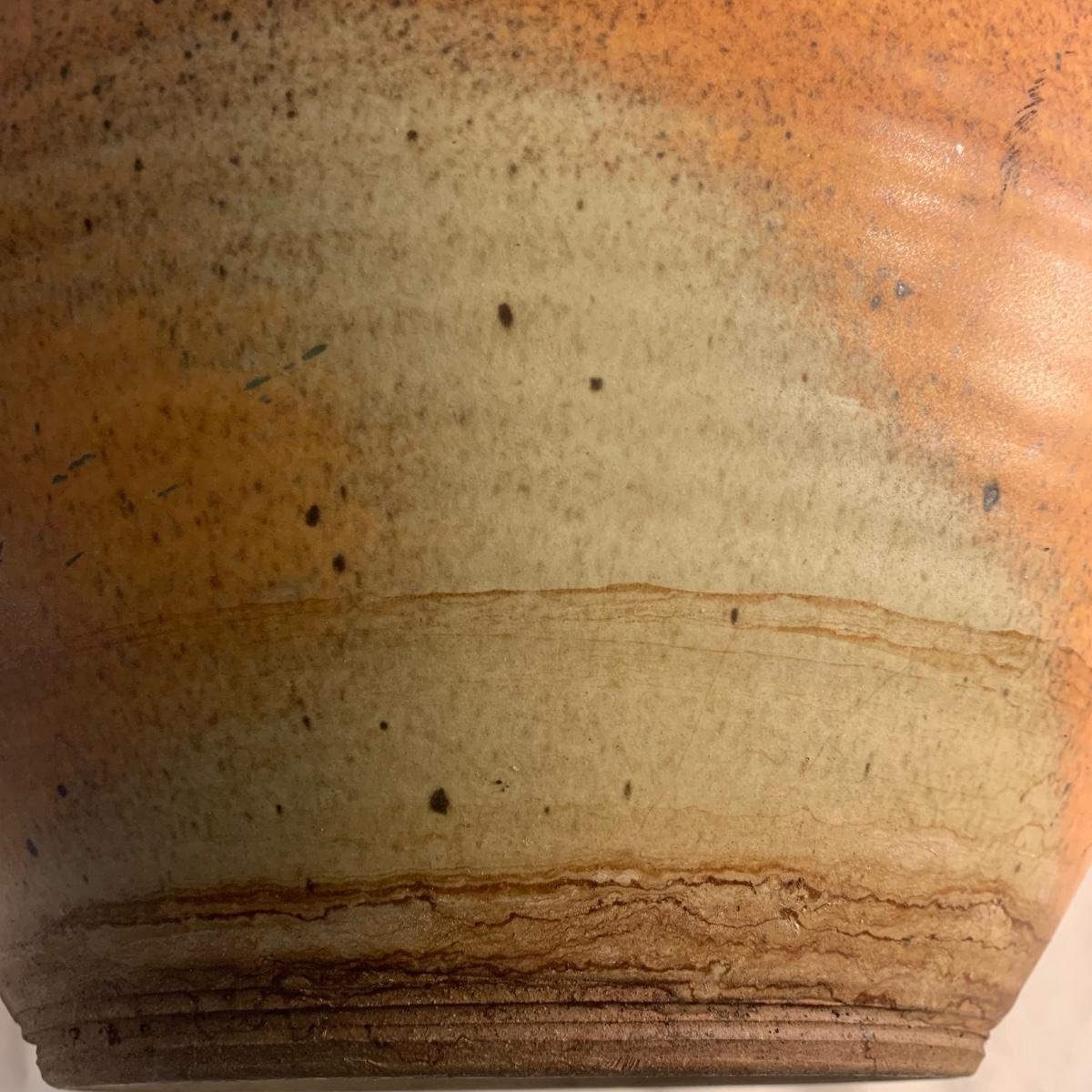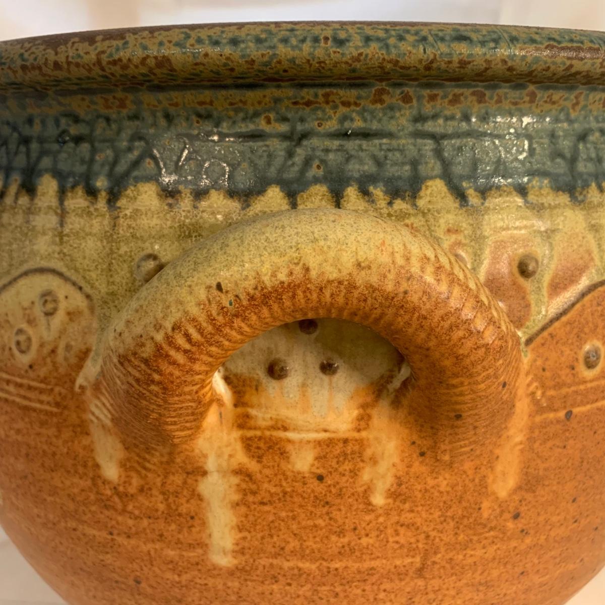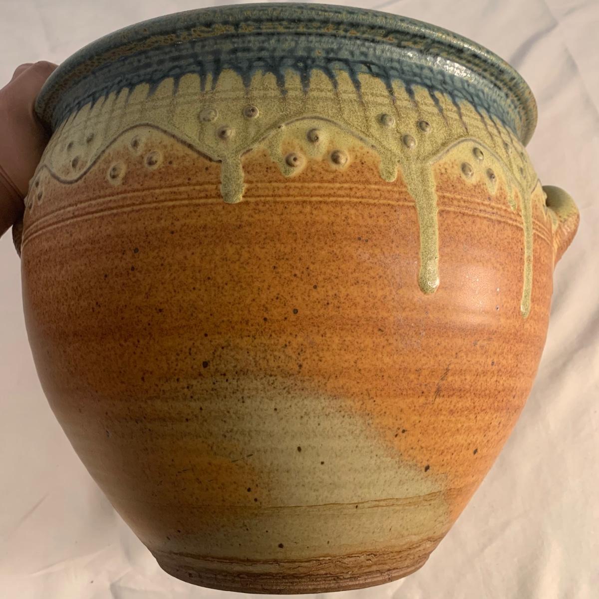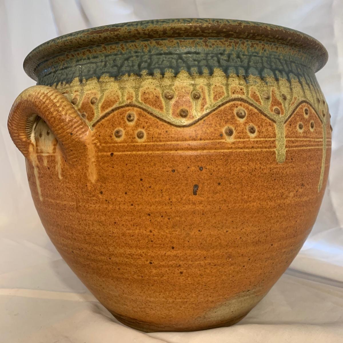 Stamped blue and clay colored pottery planter. Large blue planter measures about 13.5”D x 11.5”H. Planter appears to be in good condition.