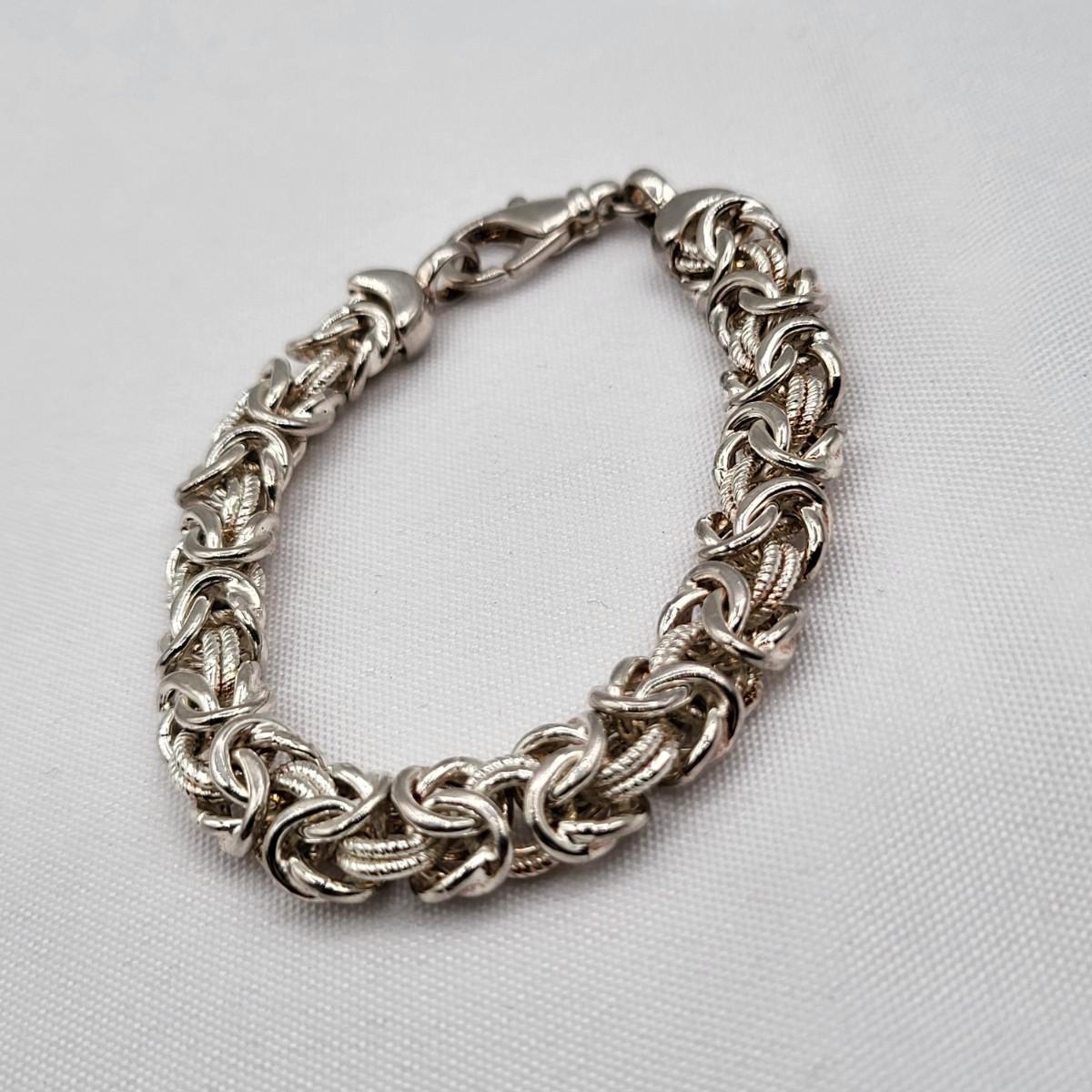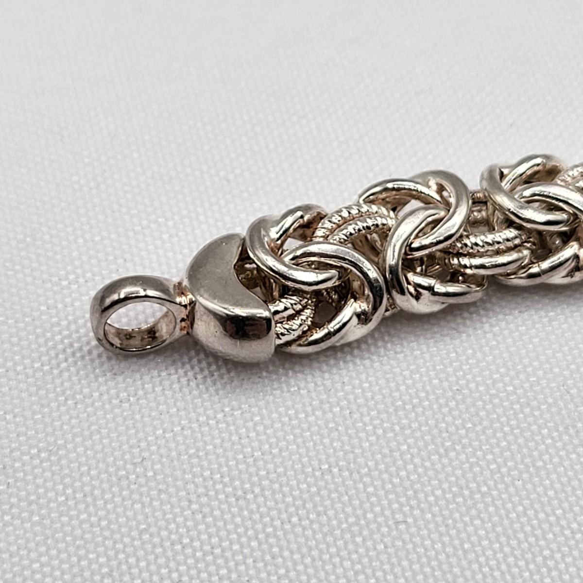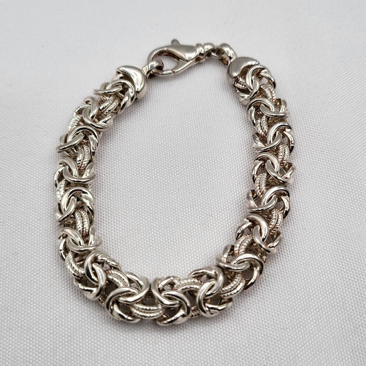 Byzantine link bracelet, stamped 925 Milor Italy, measures 6.75" long and 10mm wide. Weighs 19.16 grams.