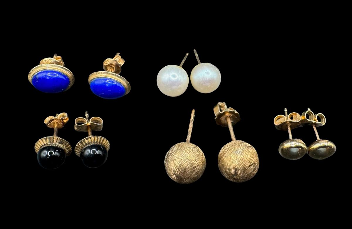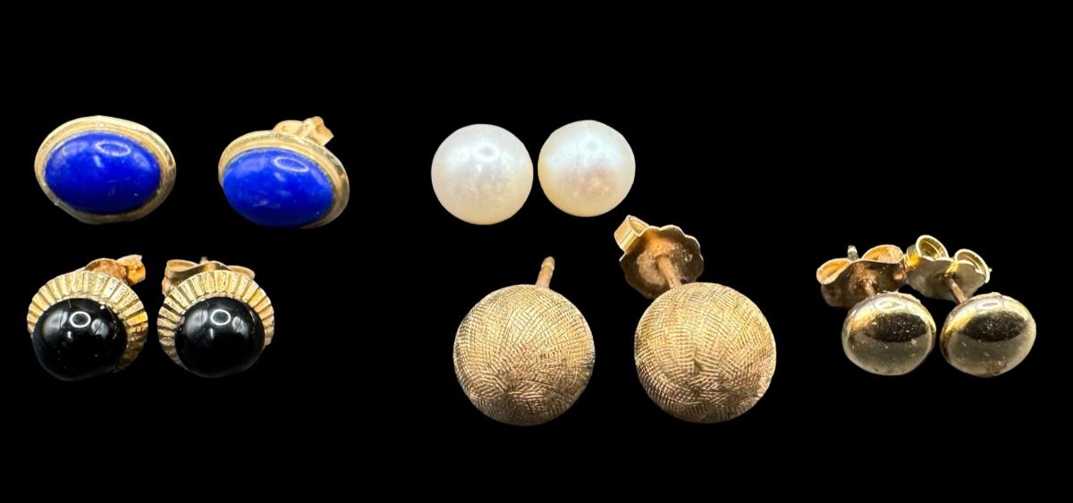 **WIRE TRANSFER IS REQUIRED IF SHIPPED.** Includes four pairs of 14K gold earrings (3.74g), and one pair of 10K gold earrings (1.14g). Gold content confirmed using Niton XRF precious metals analyzer. **ALL PRECIOUS METALS SALES ARE FINAL. NO REFUNDS WILL BE GIVEN FOR ANY REASON.** [JL]