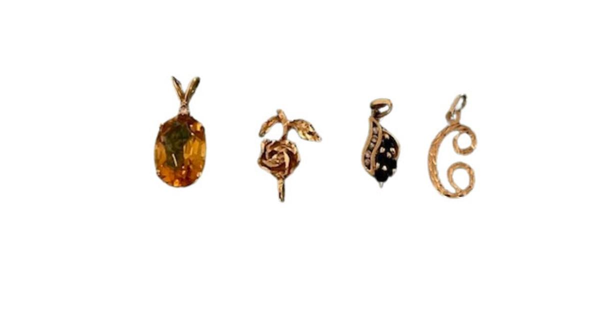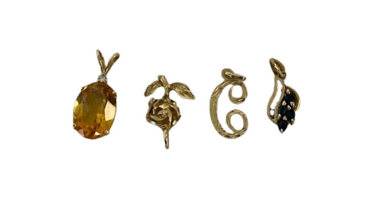 **WIRE TRANSFER IS REQUIRED IF SHIPPED.** [4.56g] One is a citrine, two are diamond cut, and one has sapphires and diamonds. Total of 4 pieces. Gold content confirmed using Niton XRF precious metals analyzer. [ST]