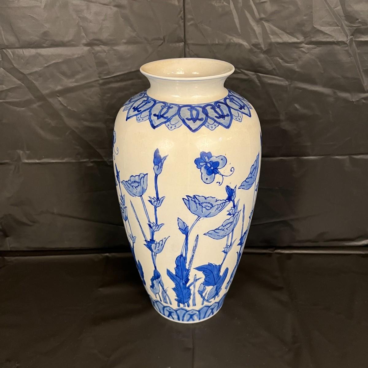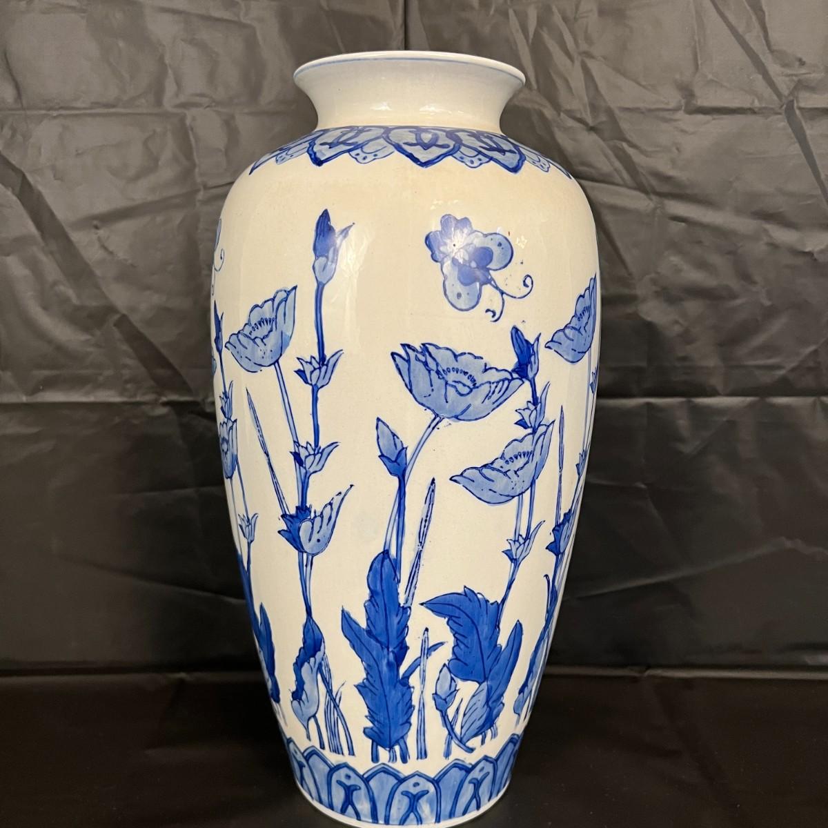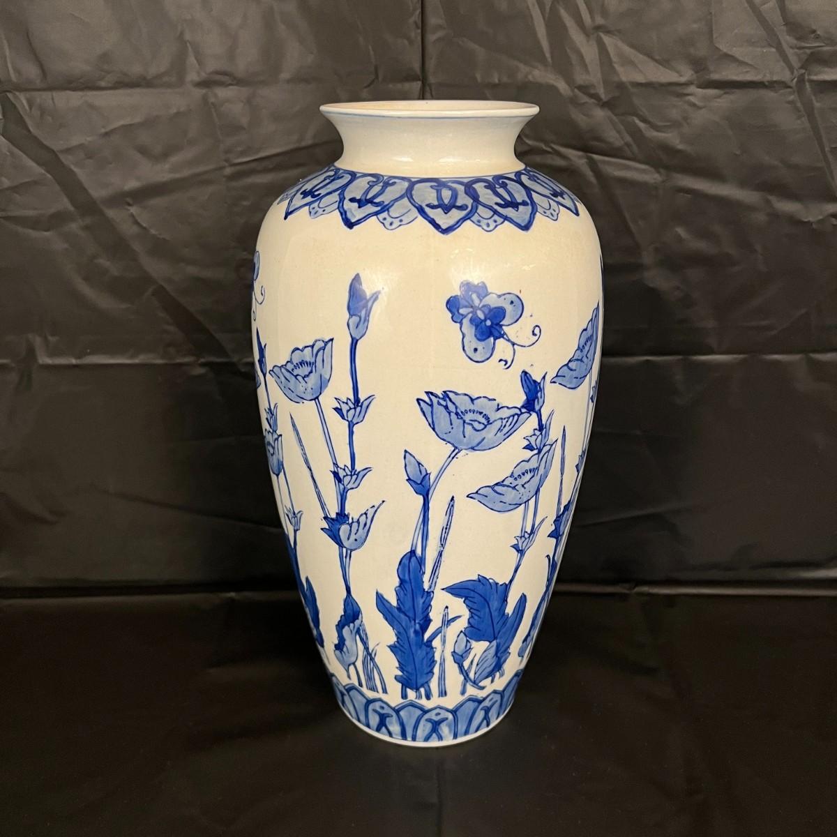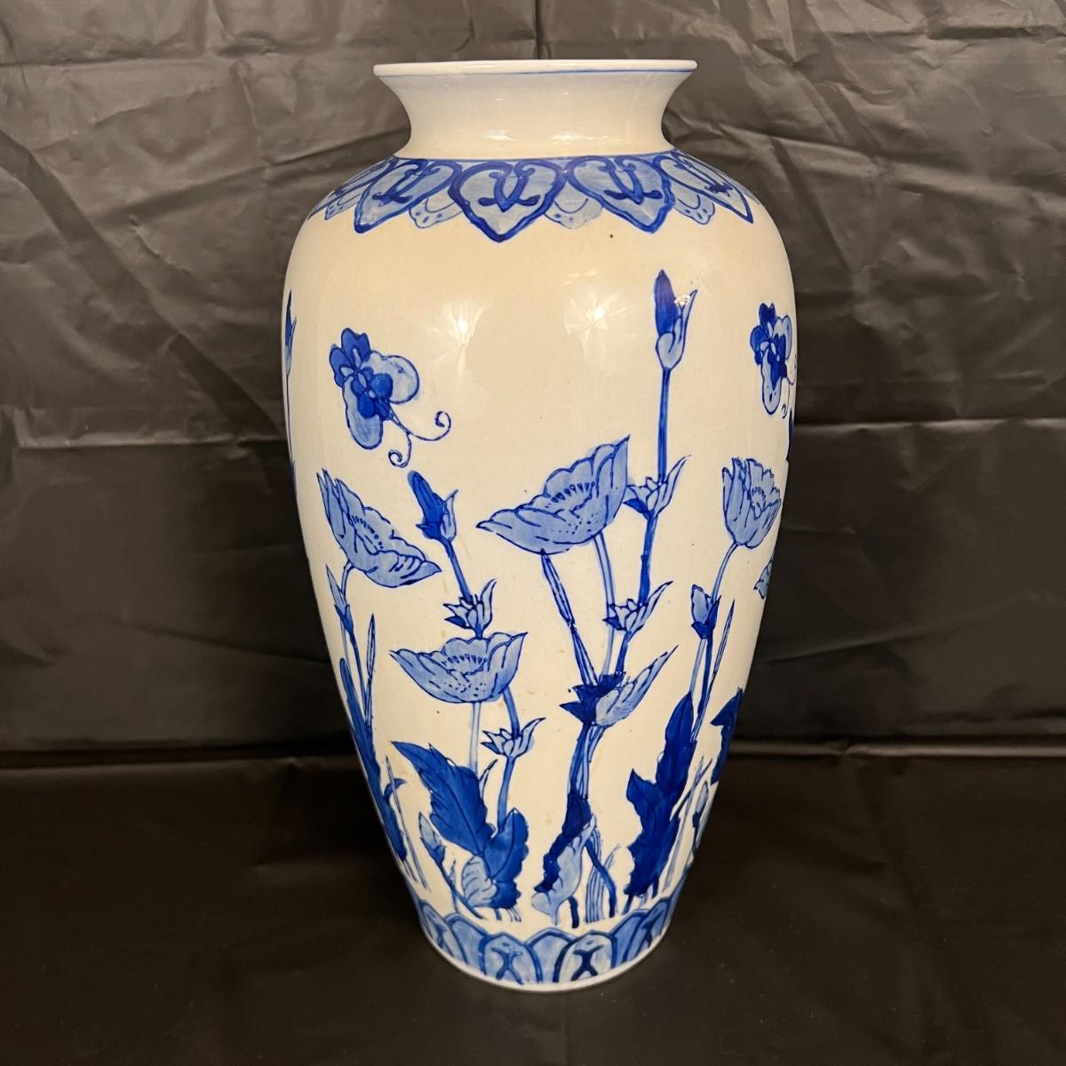 Beautiful Stamped Chinese Vintage Blue and White Floral Gazed Ceramic Vase. Flowers look like some kind of poppies or wildflowers and butterflies. In very good condition, as shown.