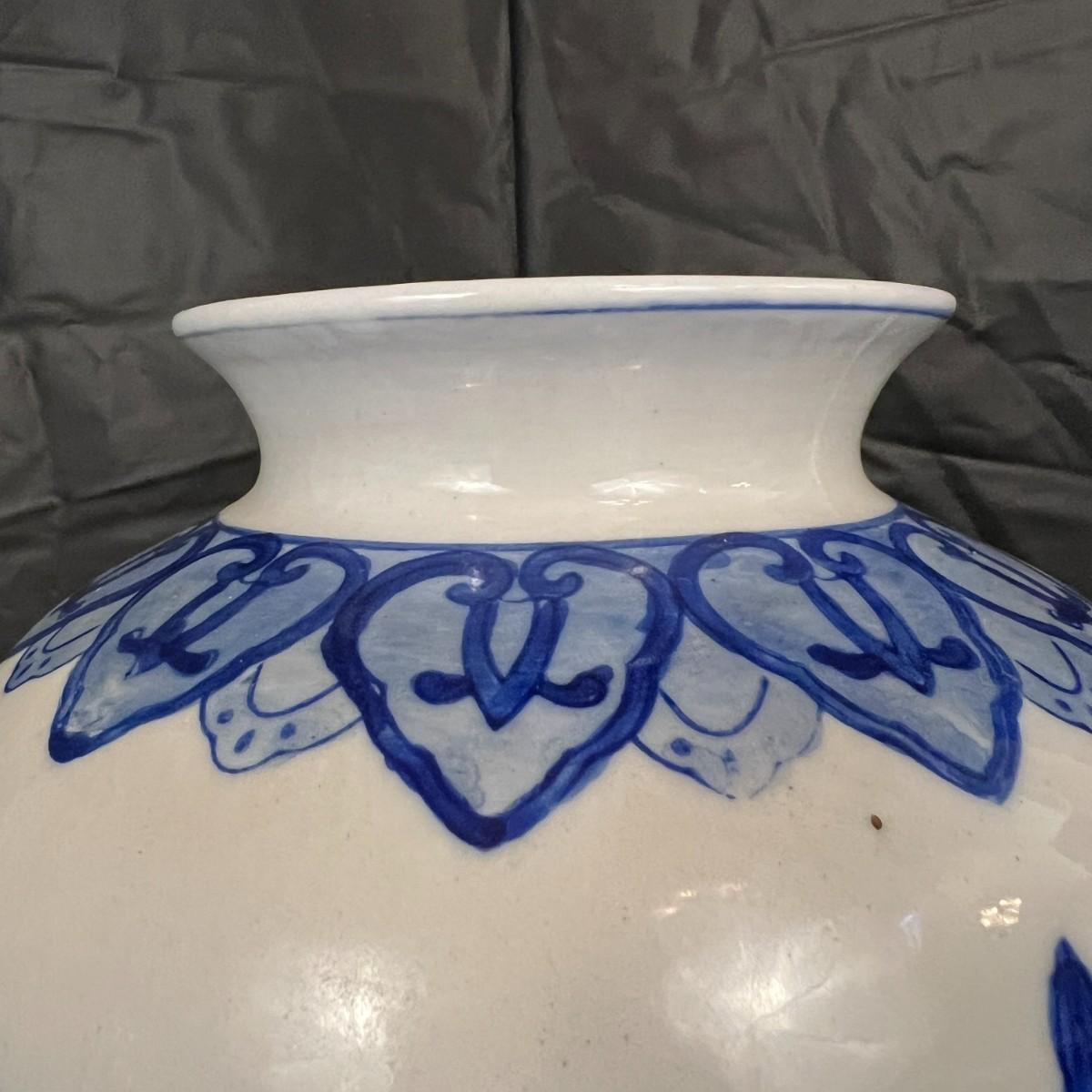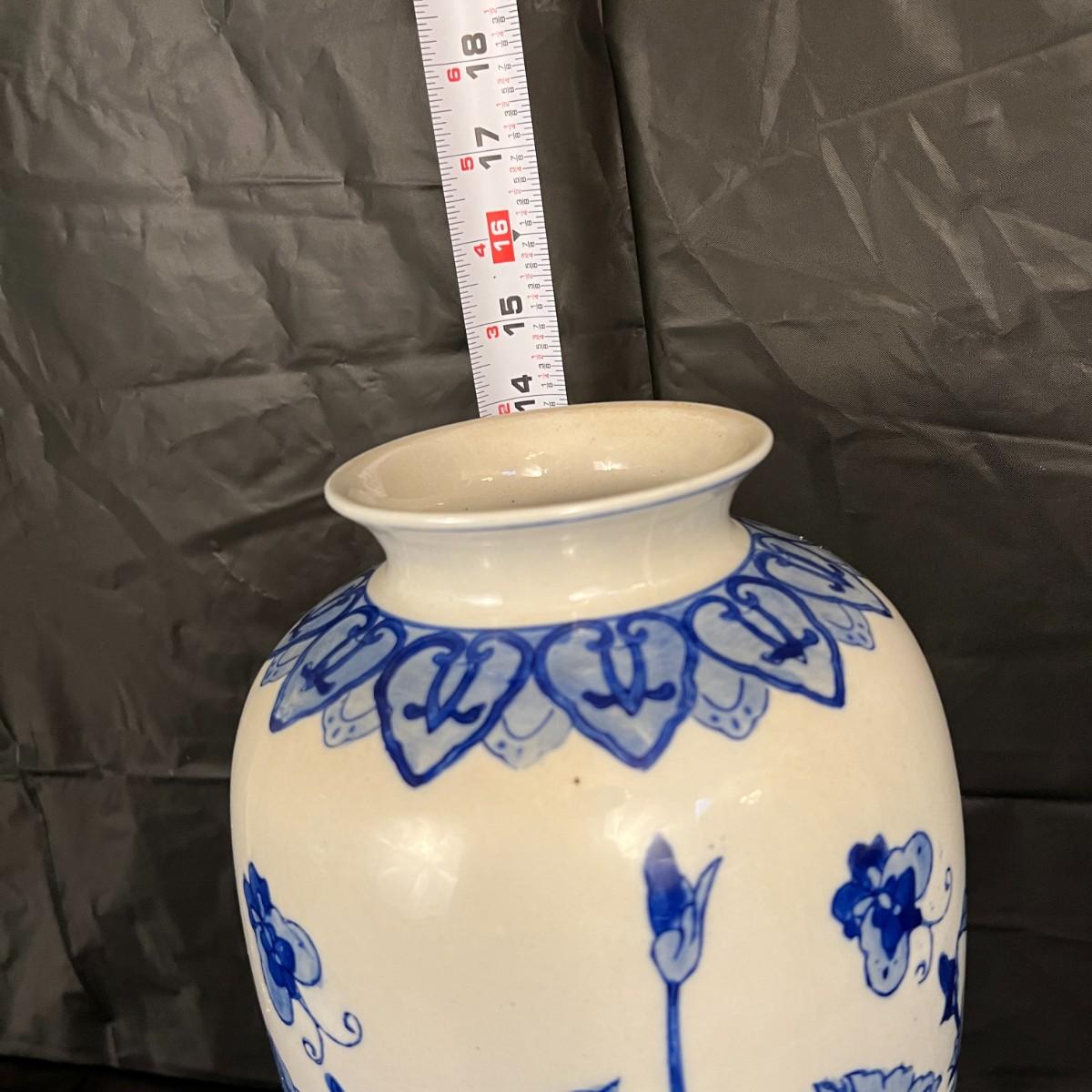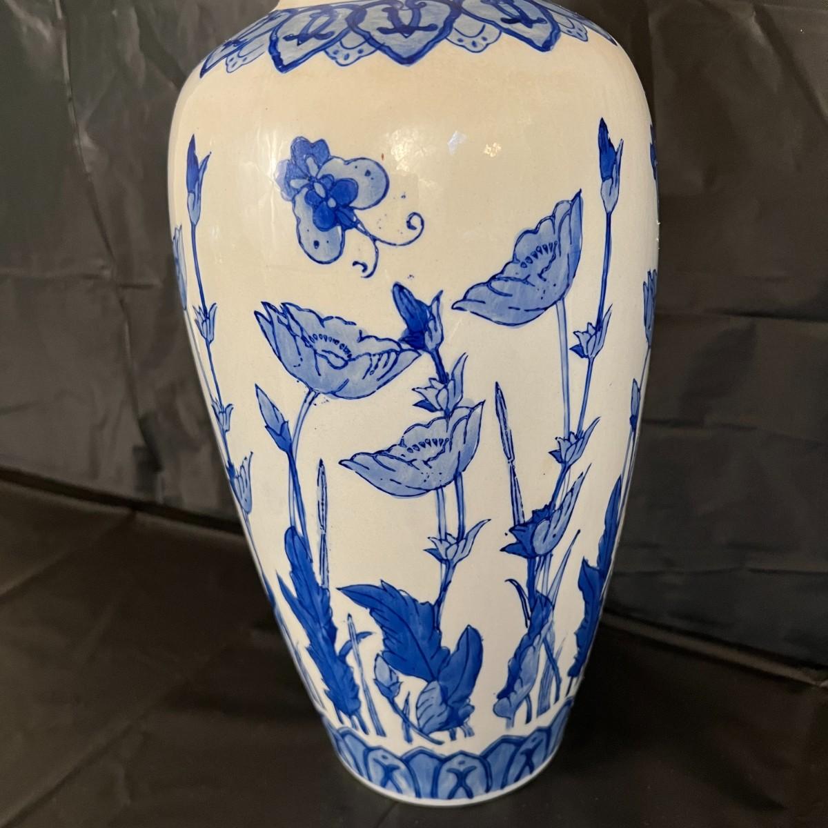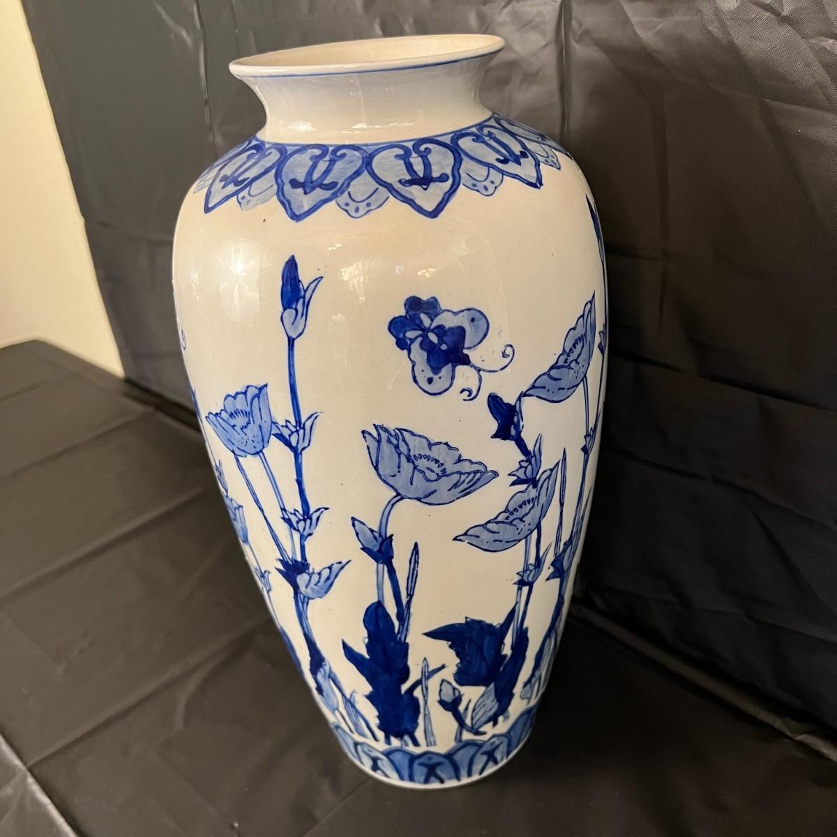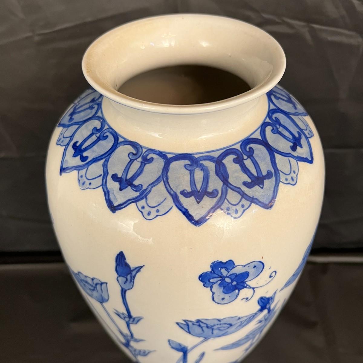 Beautiful Stamped Chinese Vintage Blue and White Floral Gazed Ceramic Vase. Flowers look like some kind of poppies or wildflowers and butterflies. In very good condition, as shown.