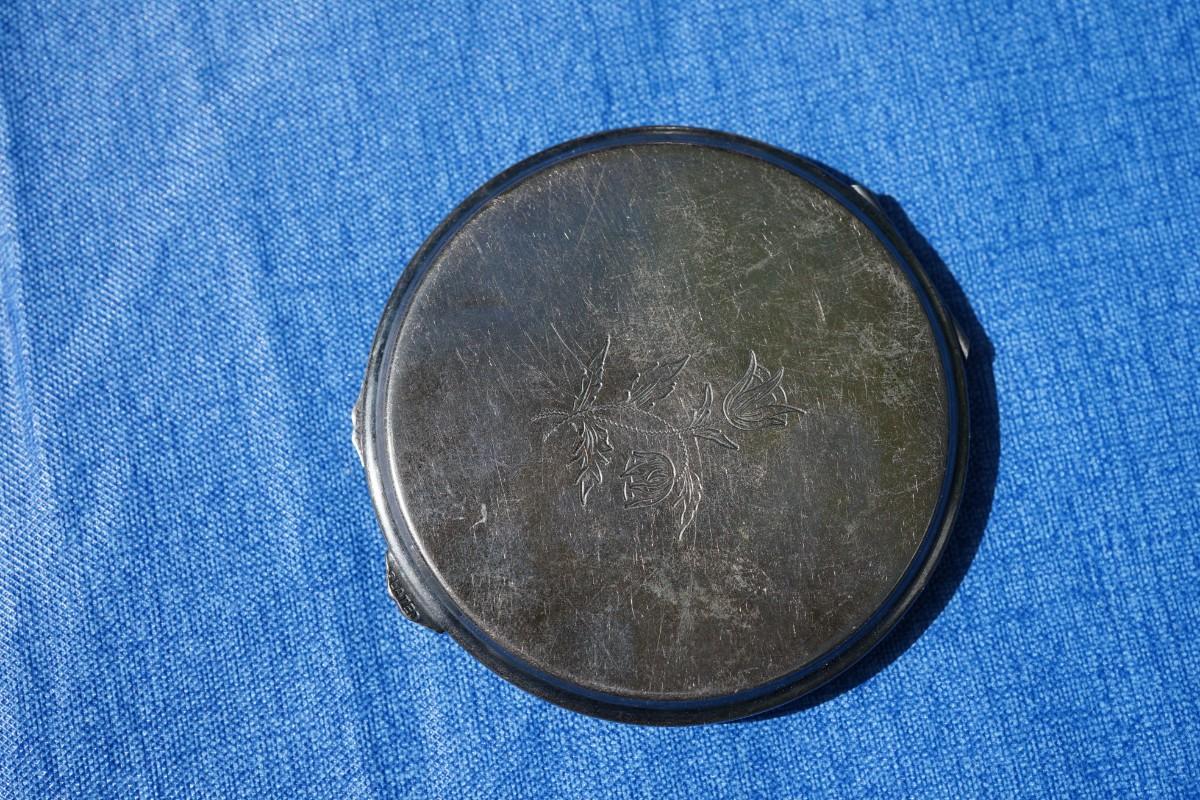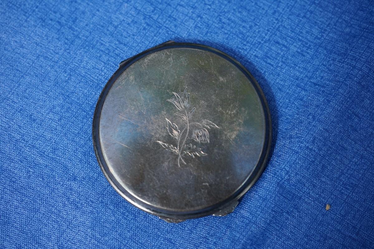 STAMPED DANISH SILVERPLATE COMPACT W/ ENGRAVED FLOWER ON LID.